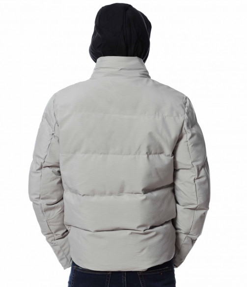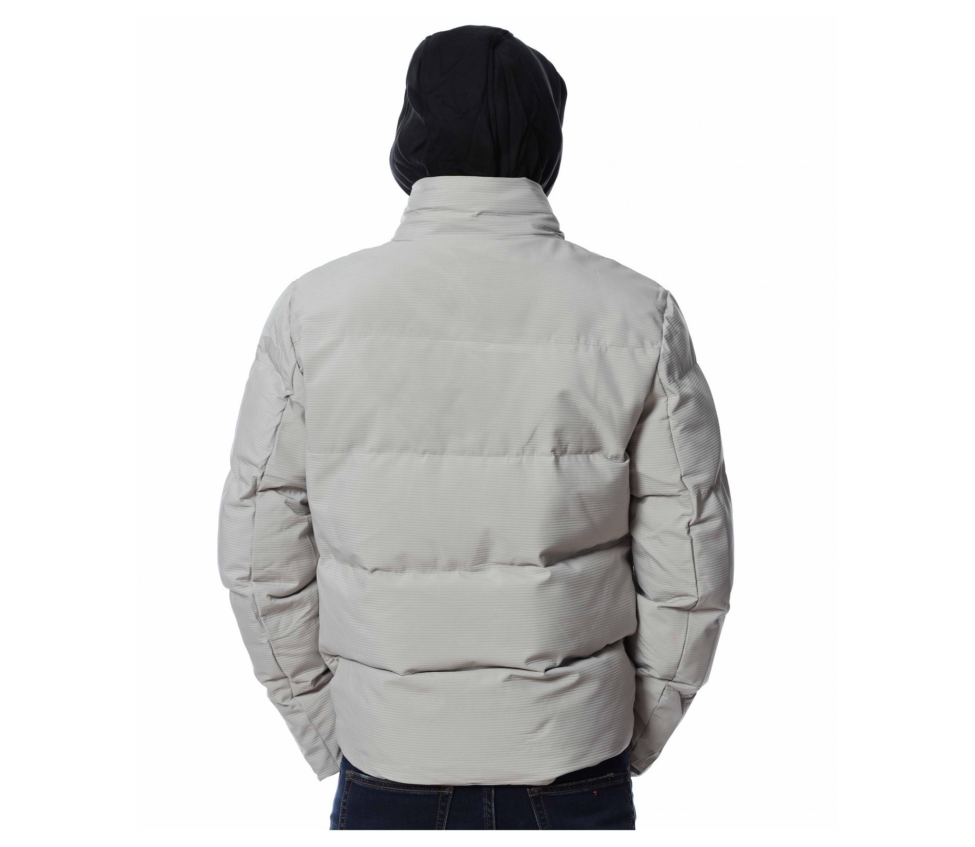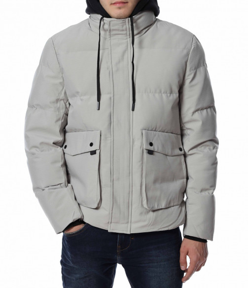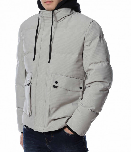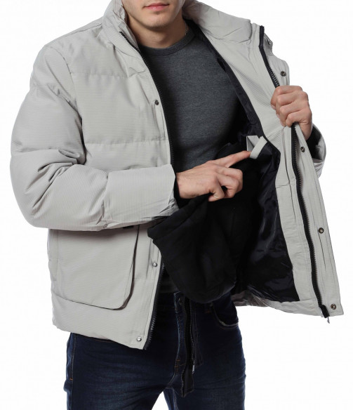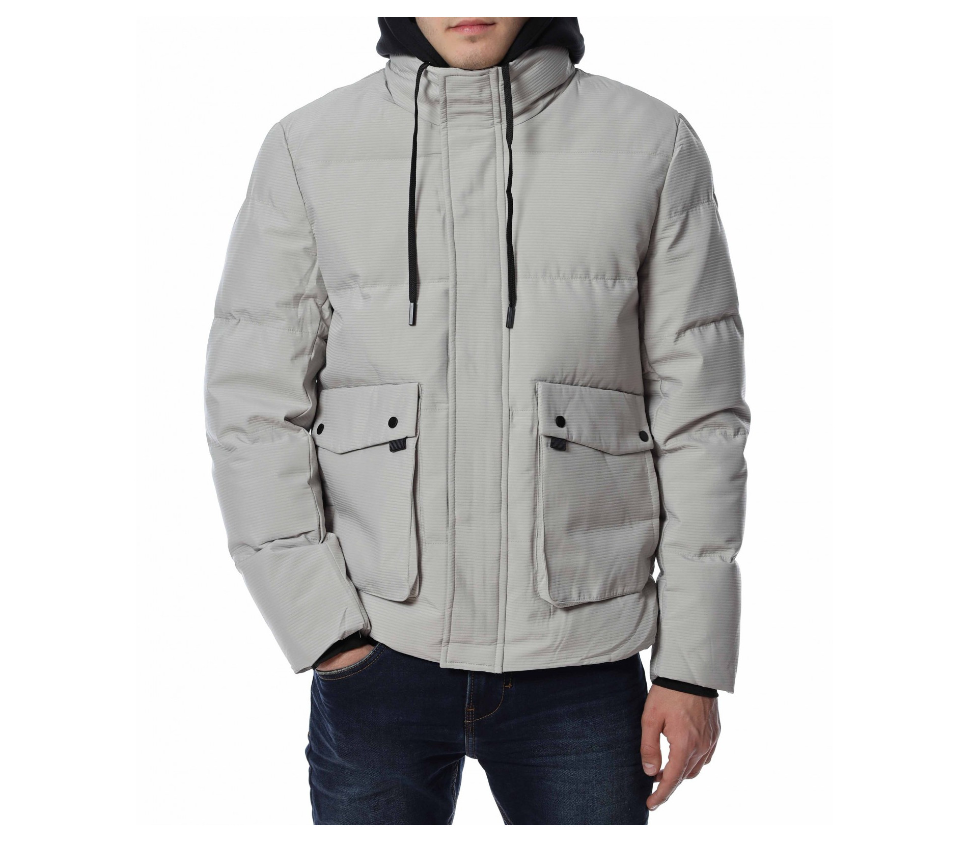 Мъжко яке от непромокаема материя, подходящо за студените месеци. Основата е едноцветна, а дизайнът е заложен на хоризонтални оребрени шевове. Качулката е от мека, памучна материя и подплатено от силиконова вата. Закопчаването се състои в цип и капси. Дължината на модела е до средата на седалището, което улеснява движенията ви.В предната част са разположени джобове с капачета за акцент. Комбинирайте с блуза и дънки.