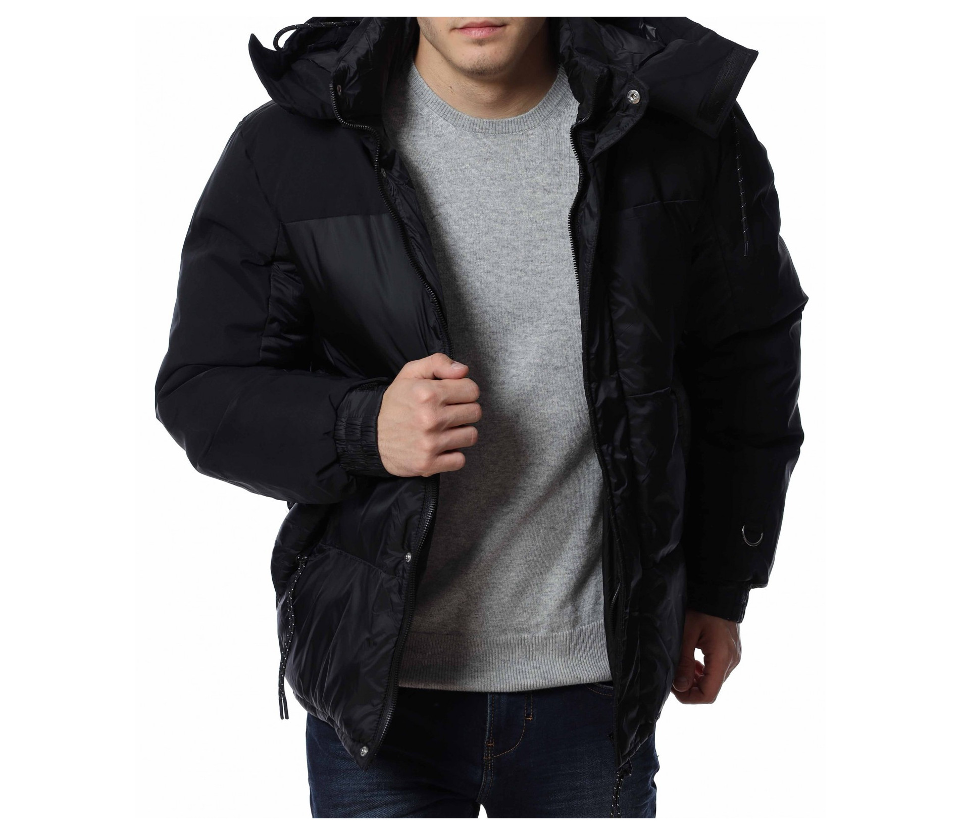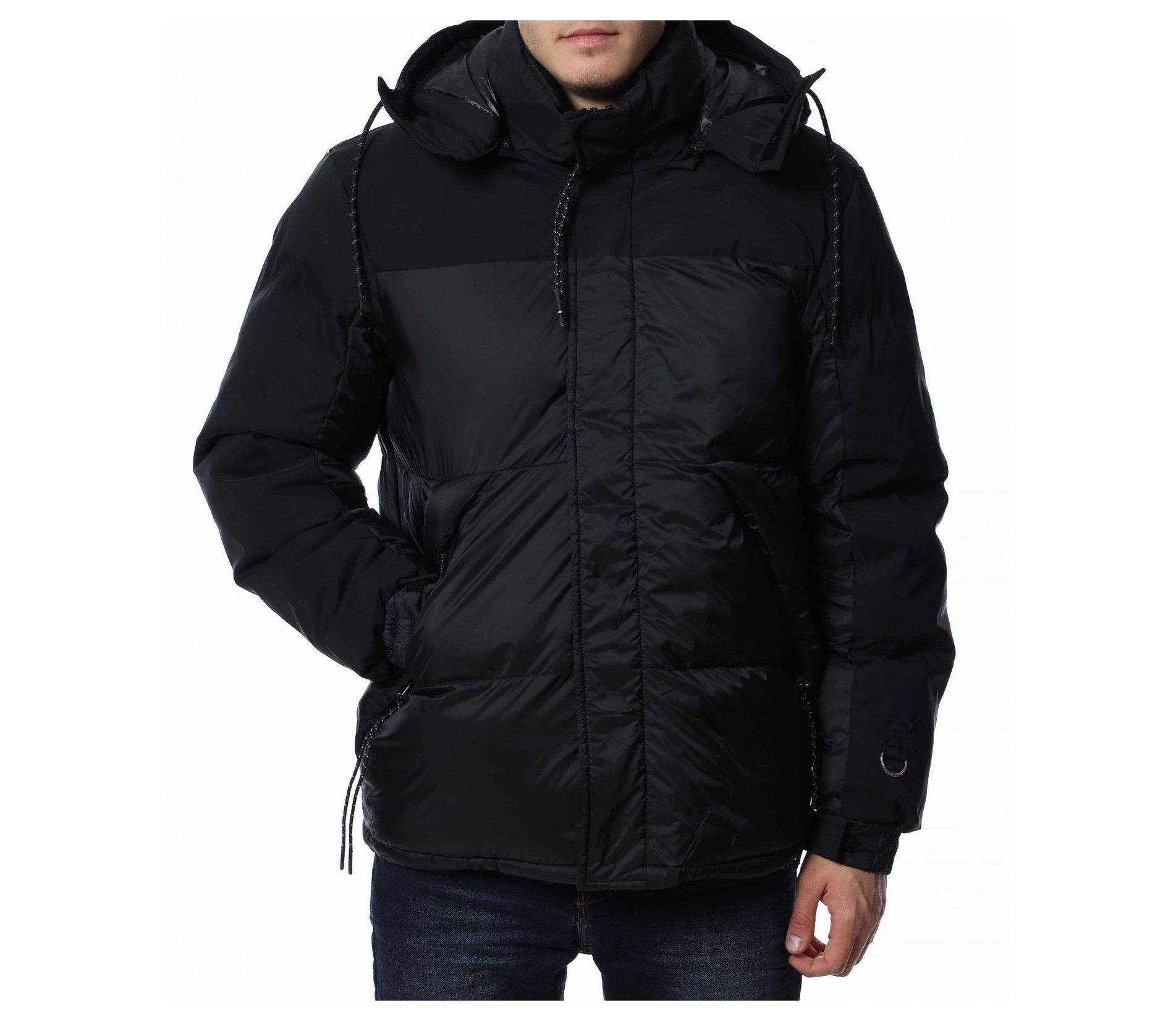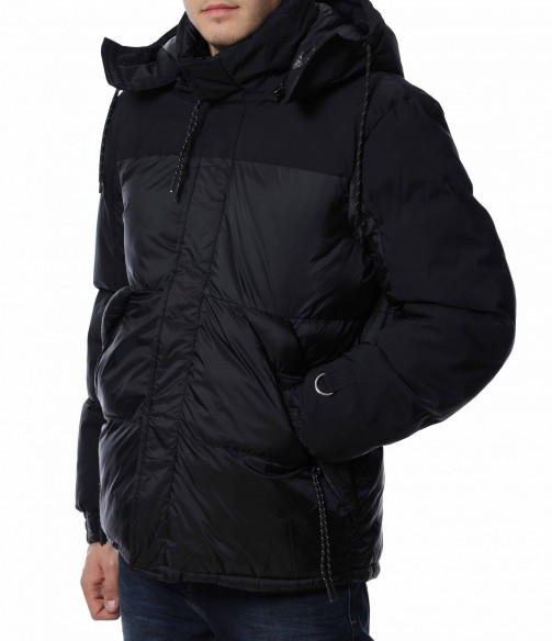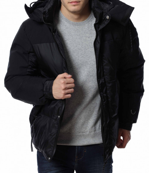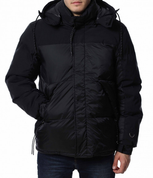Мъжко, зимно яке с качулка. Дизайнът на якето се откроява с оребрени шевове по цялата дължина и матирани части. Отстрани са разположени джобове с ципове, а закопчаването също се състои в цип и капси. На качулката забелязваме връзки, с които да регулирате ширината, както и цип чрез, който можете да я свалите. Кройката е изключително удобна, а материята придава на тялото незаменим комфорт и топлина. Комбинирайте с блуза и дънки и завършете вашия аутфит.