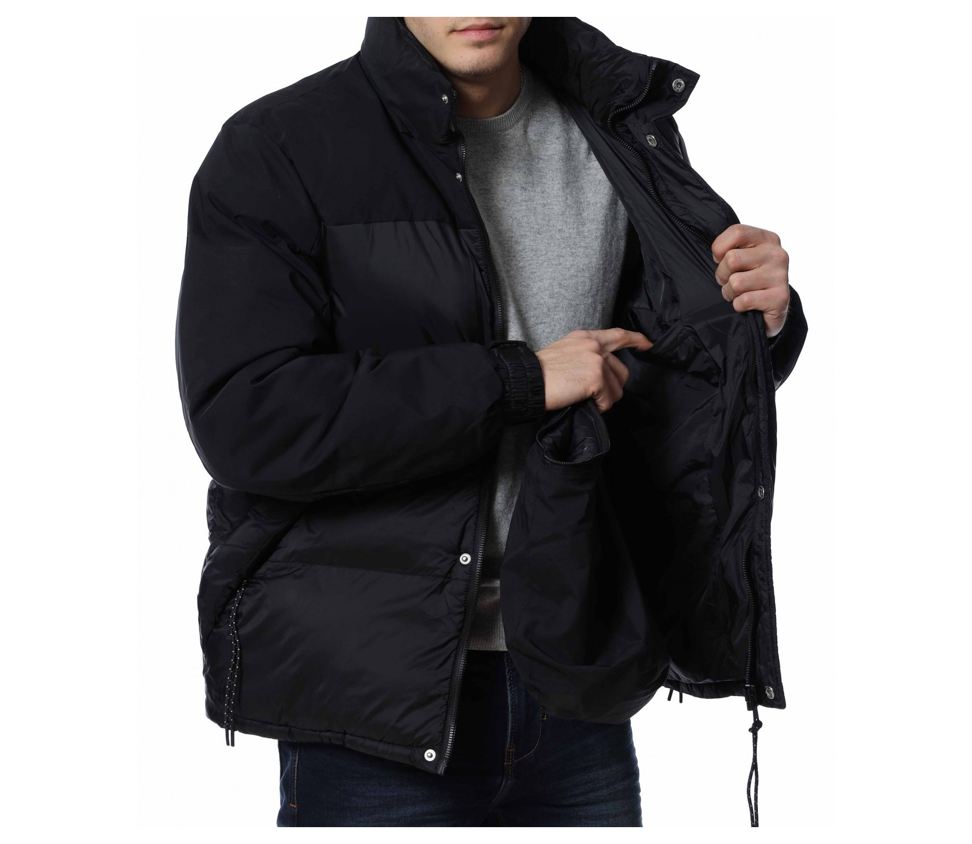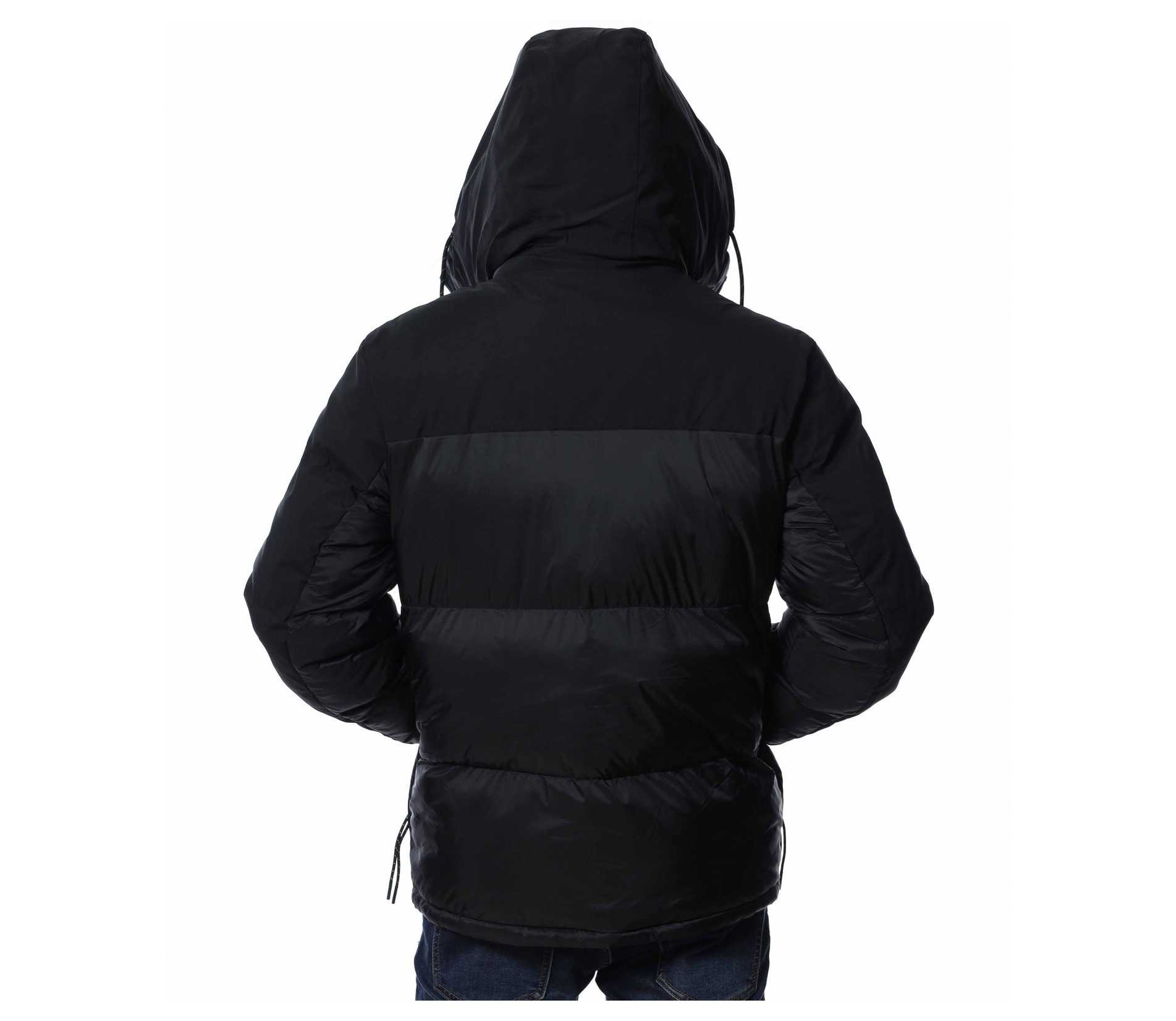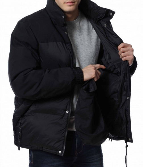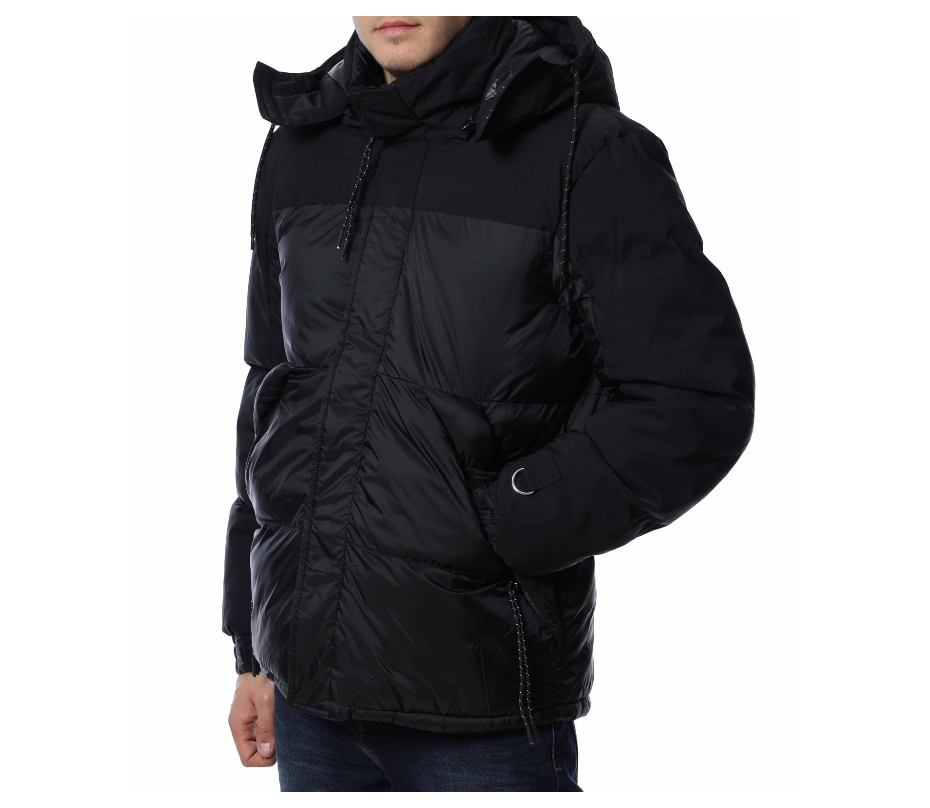 Мъжко, зимно яке с качулка. Дизайнът на якето се откроява с оребрени шевове по цялата дължина и матирани части. Отстрани са разположени джобове с ципове, а закопчаването също се състои в цип и капси. На качулката забелязваме връзки, с които да регулирате ширината, както и цип чрез, който можете да я свалите. Кройката е изключително удобна, а материята придава на тялото незаменим комфорт и топлина. Комбинирайте с блуза и дънки и завършете вашия аутфит.