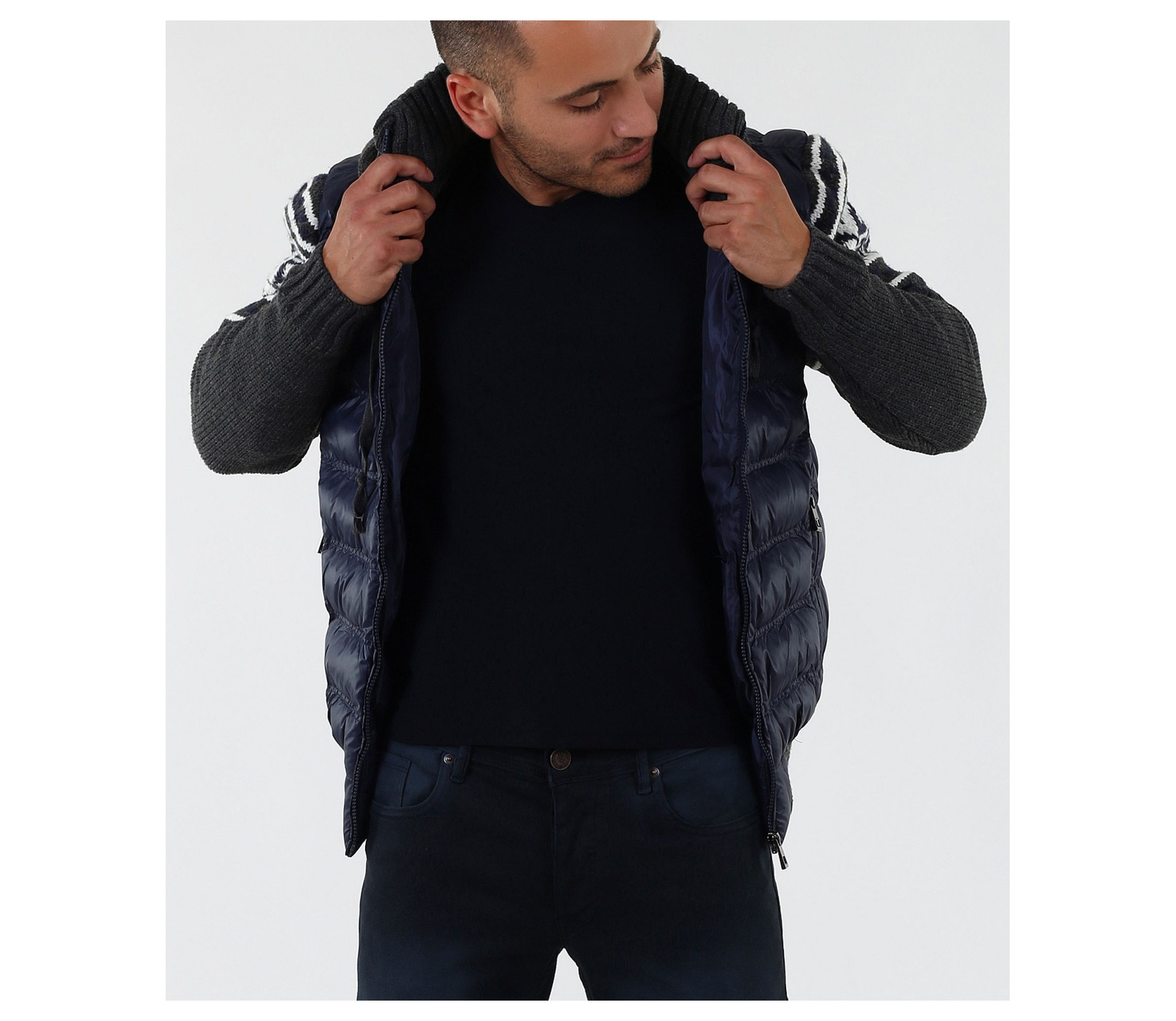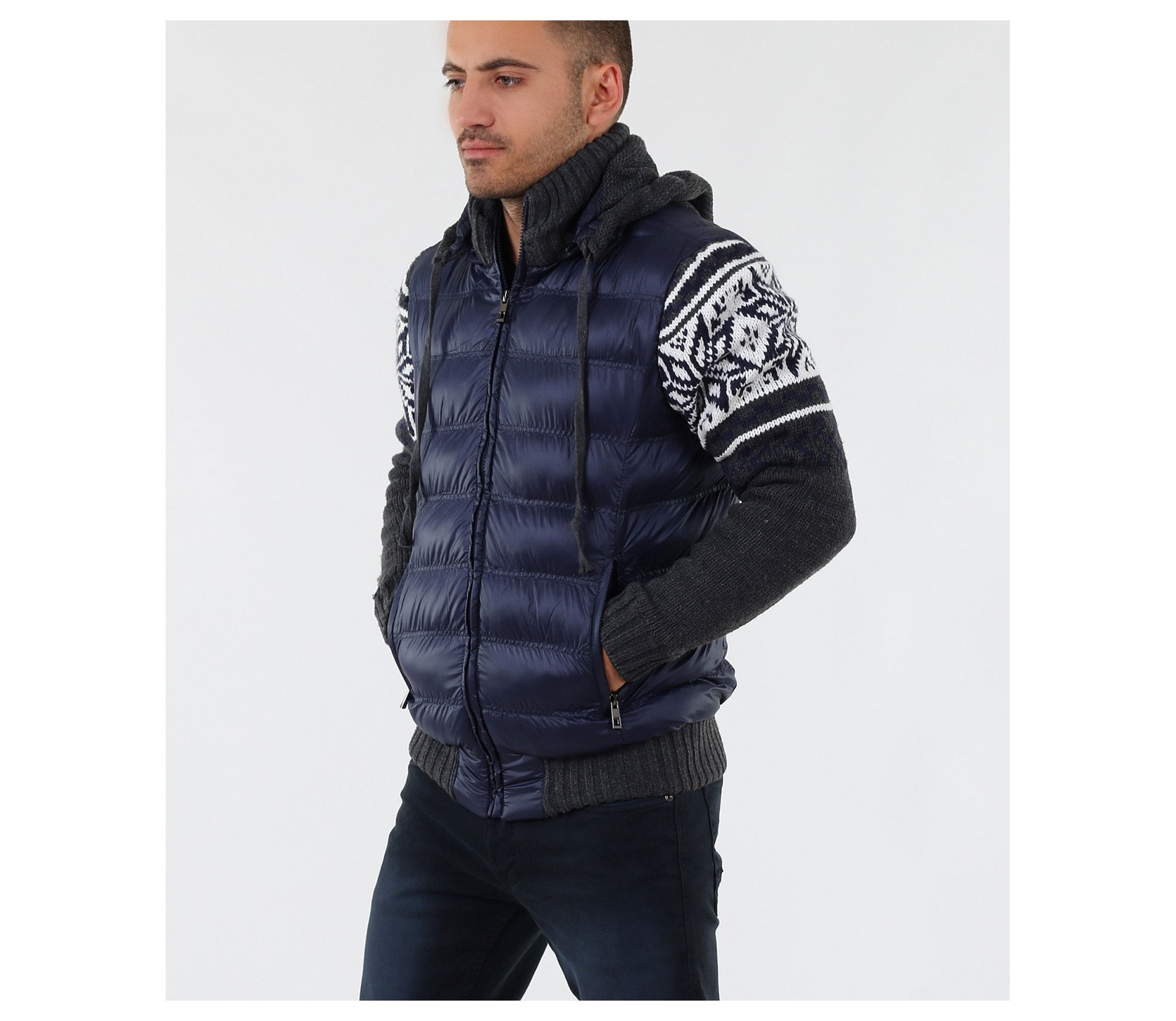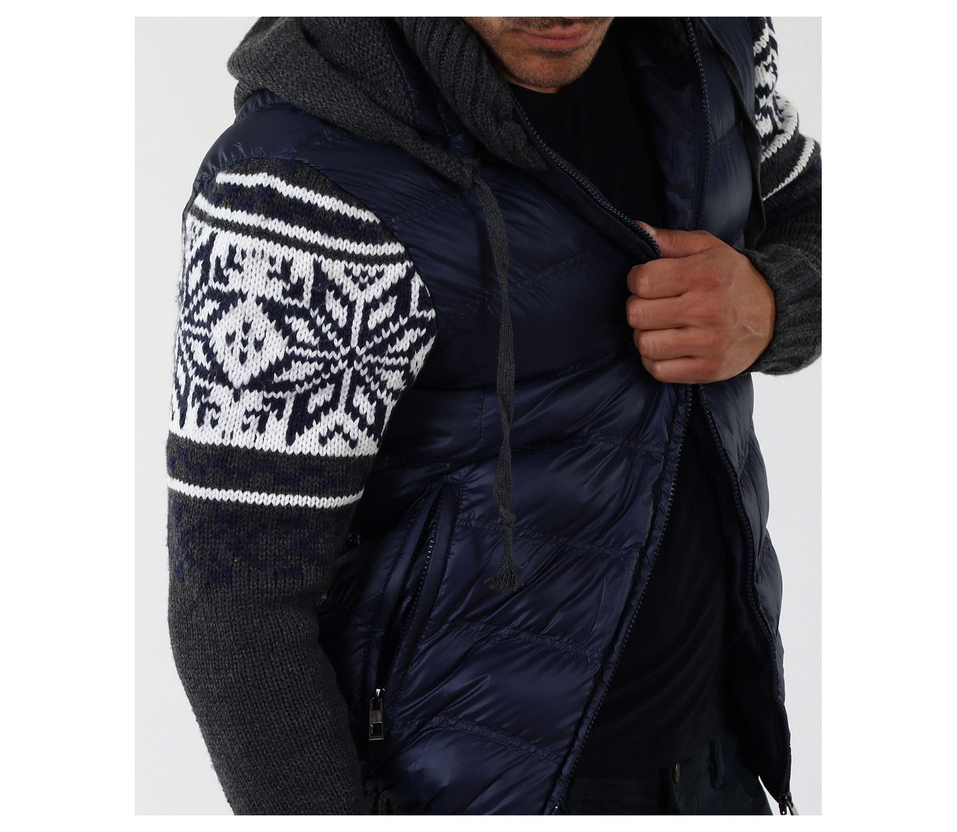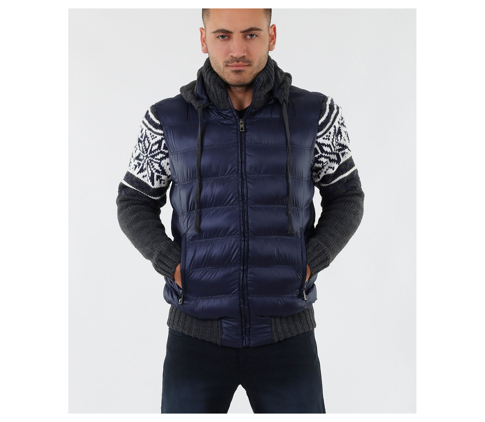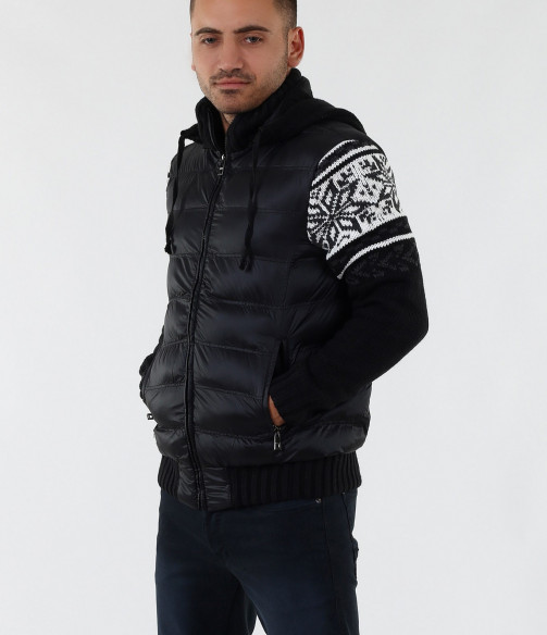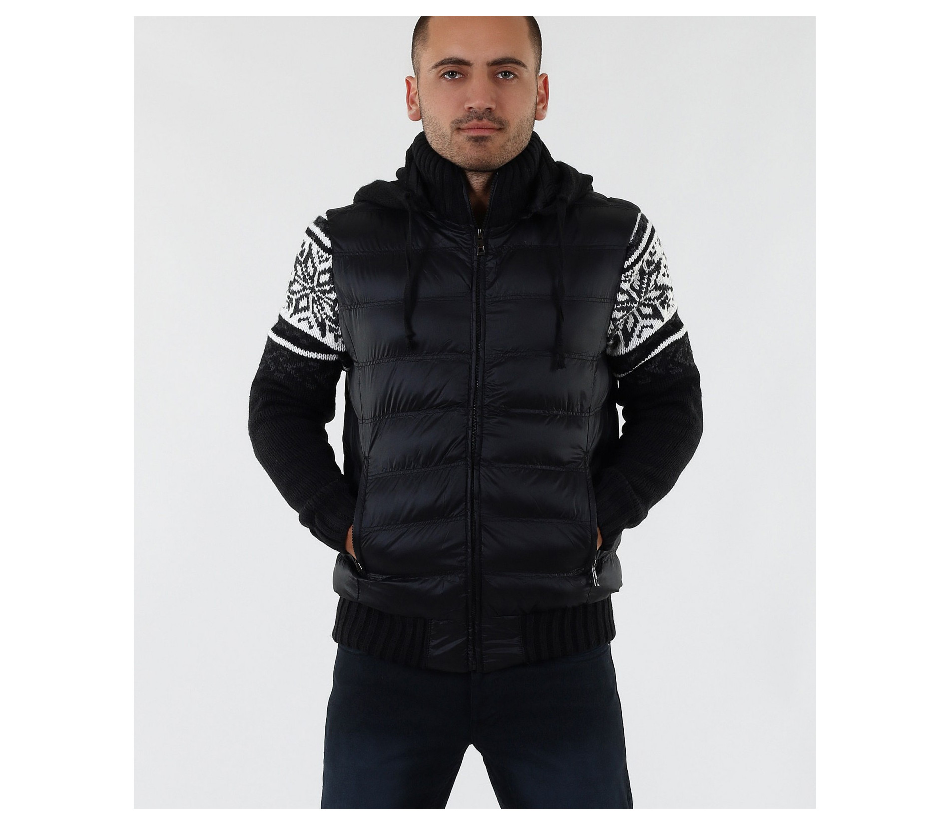 Описание на продукта: Мъжко стилно яке с шушлекова част и плетени ръкави. Изключително интересен модел , подходящ за феновете на модерния и различен стил на обличане. С вталена кройка, стандартна дължина, акцент на ръкавите и качулка с опция за сваляне, този модел яке перфектно завършва визията Ви. Якето се предлага в два цвята: черен и син. В предната част са поставени два дълбоки джоба с цип. Перфектно се съчетава както със стилни дънки, така и със спортно-елегантен панталон. Изработен от 100% висококачествен найлон.