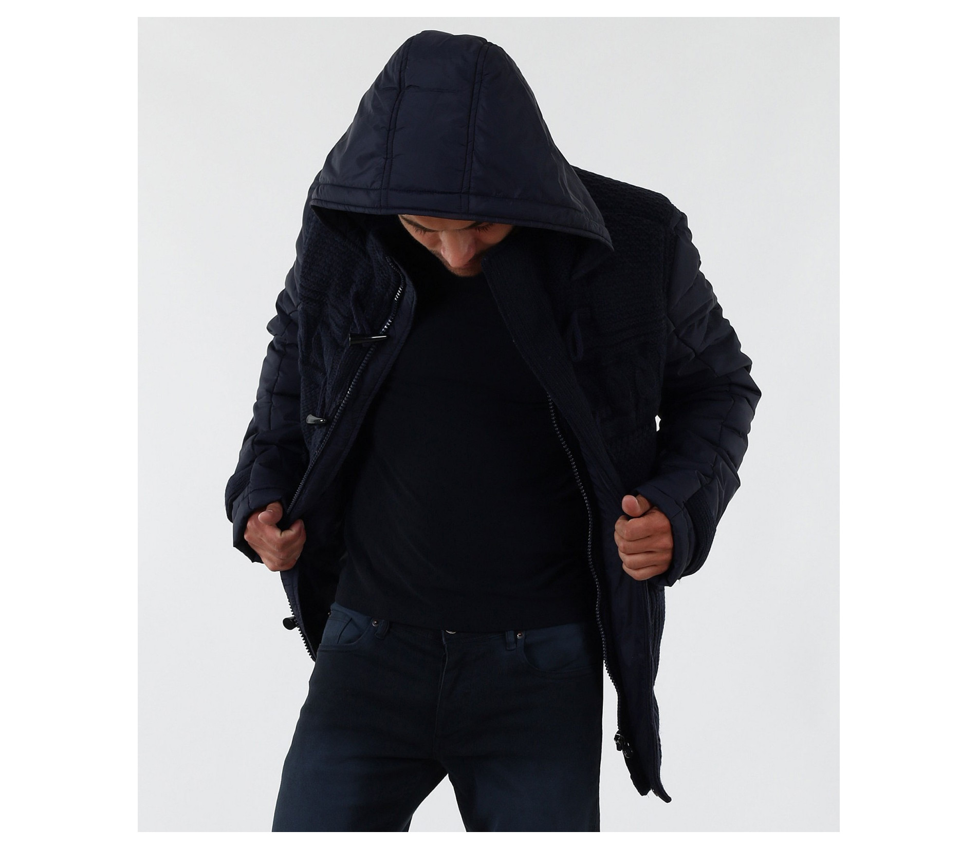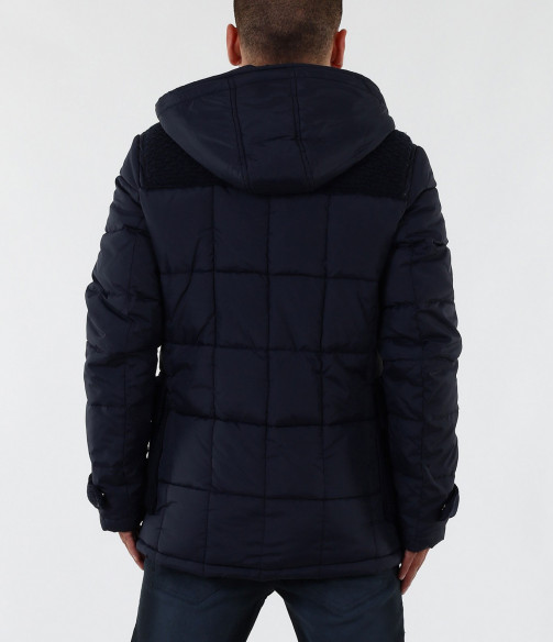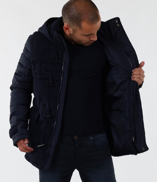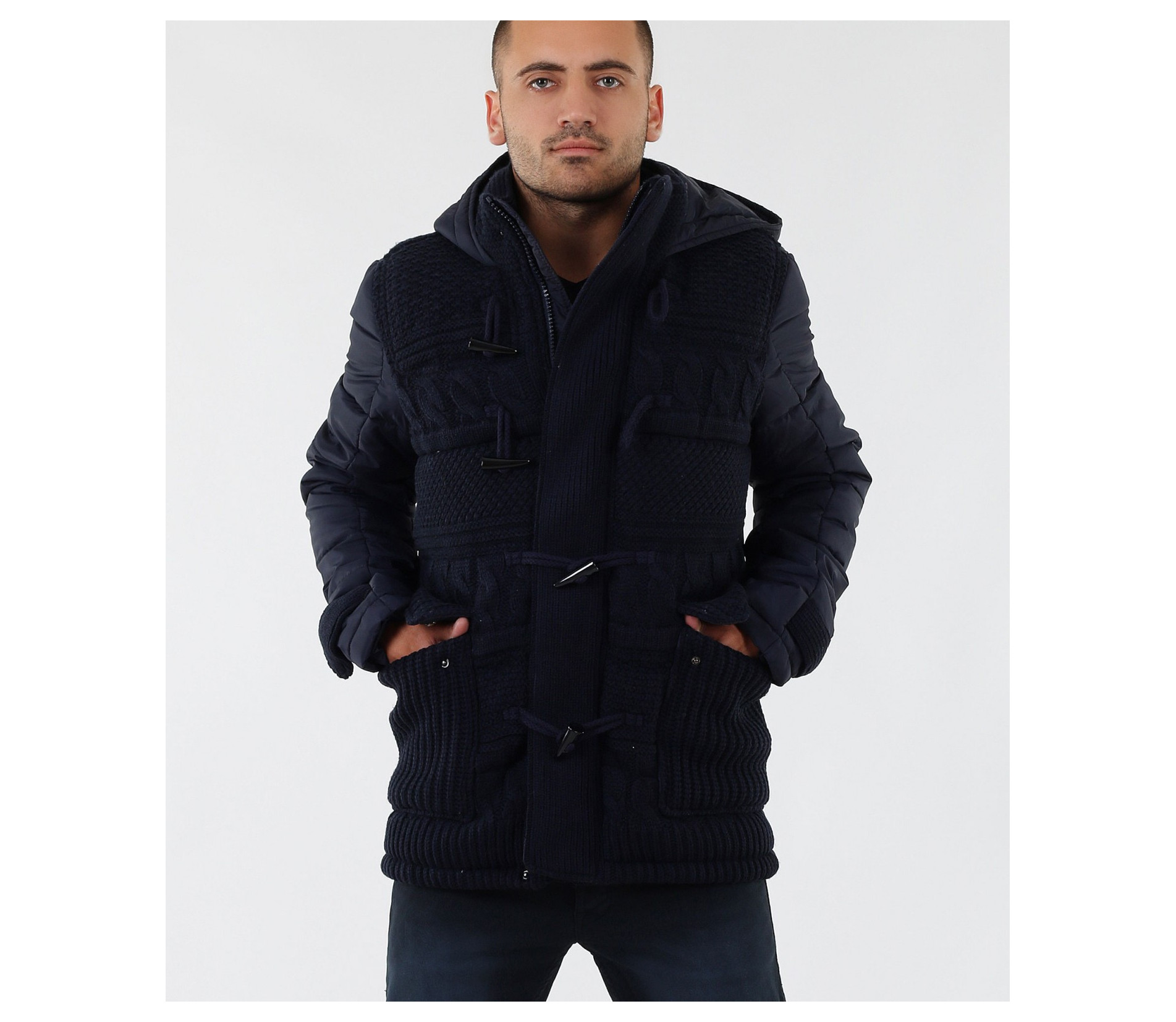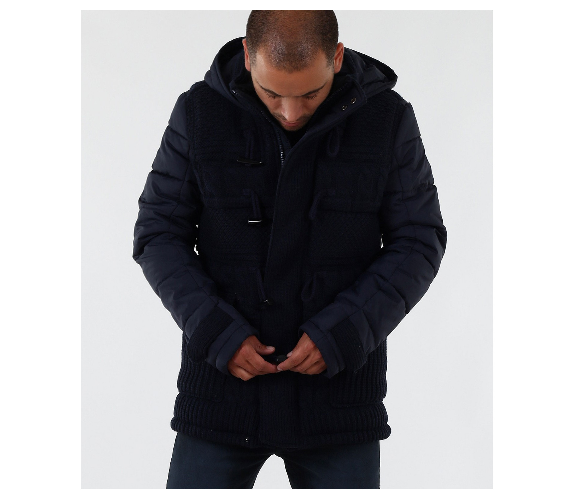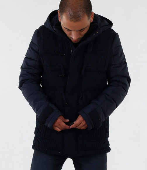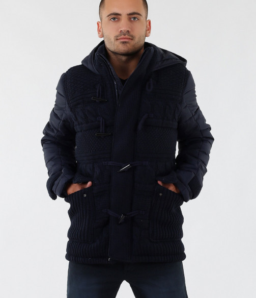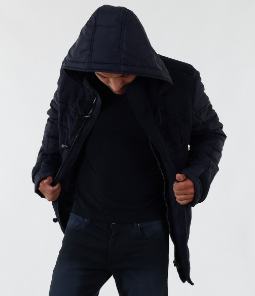 Описание на продукта: Мъжко стилно яке с плетена предната част. Моделът е с леко издължина е вталена кройка. Закопчаването е с цип и големи декоративни копчета. Има качулка, която е с опция за сваляне. Изключително интересен модел, който освен впечатляваща визия е дебело подплатено, с което Ви осигурява топлина през студените зимни дни. В предната част са поставени два дълбоки джоба. В комбинация със спортно-елегантен панталон или дънки, зимни обувки и аксесоар по Ваш вкус, получавате перфектна визия. Изработено от 100% висококачествен найлон.