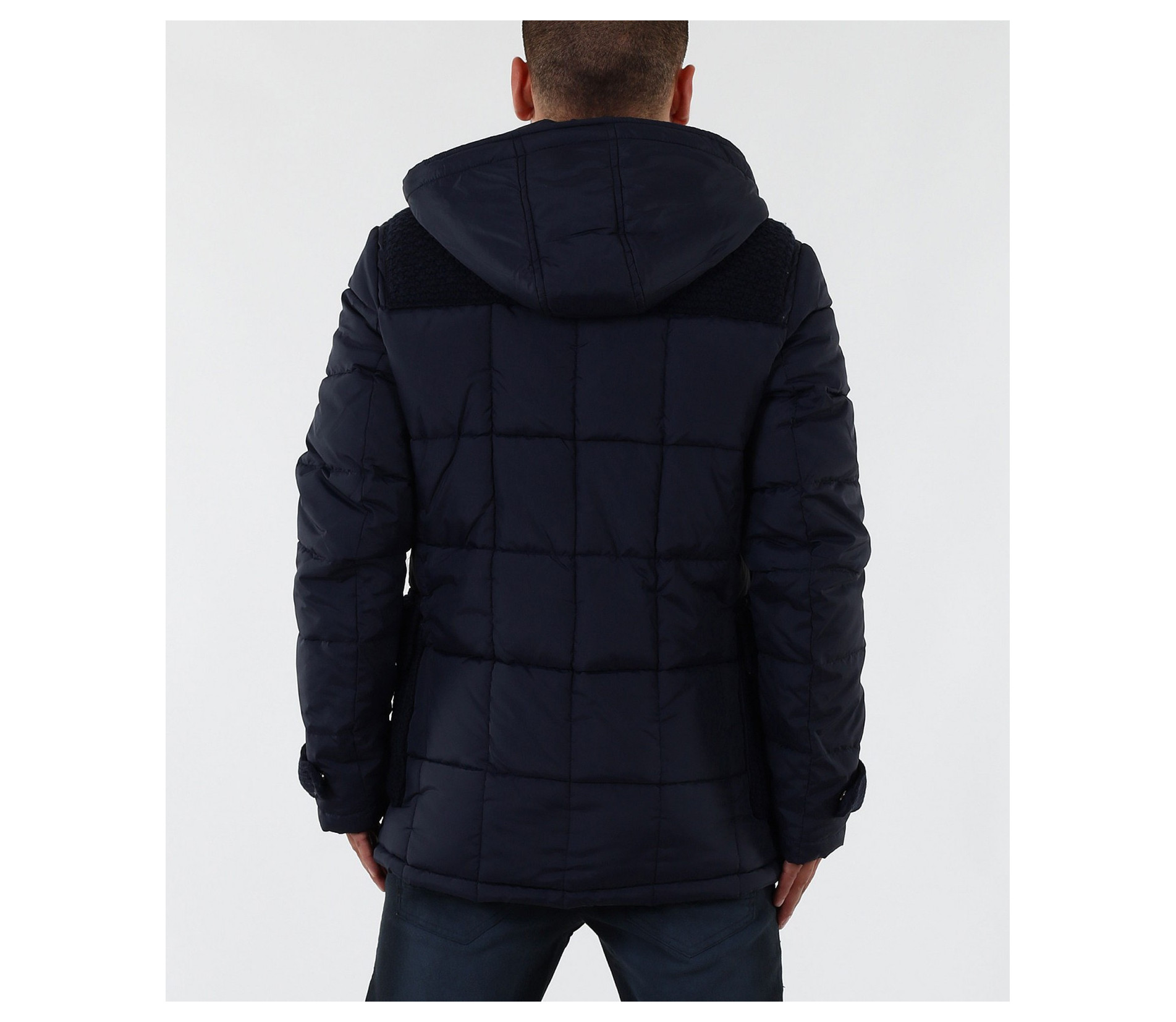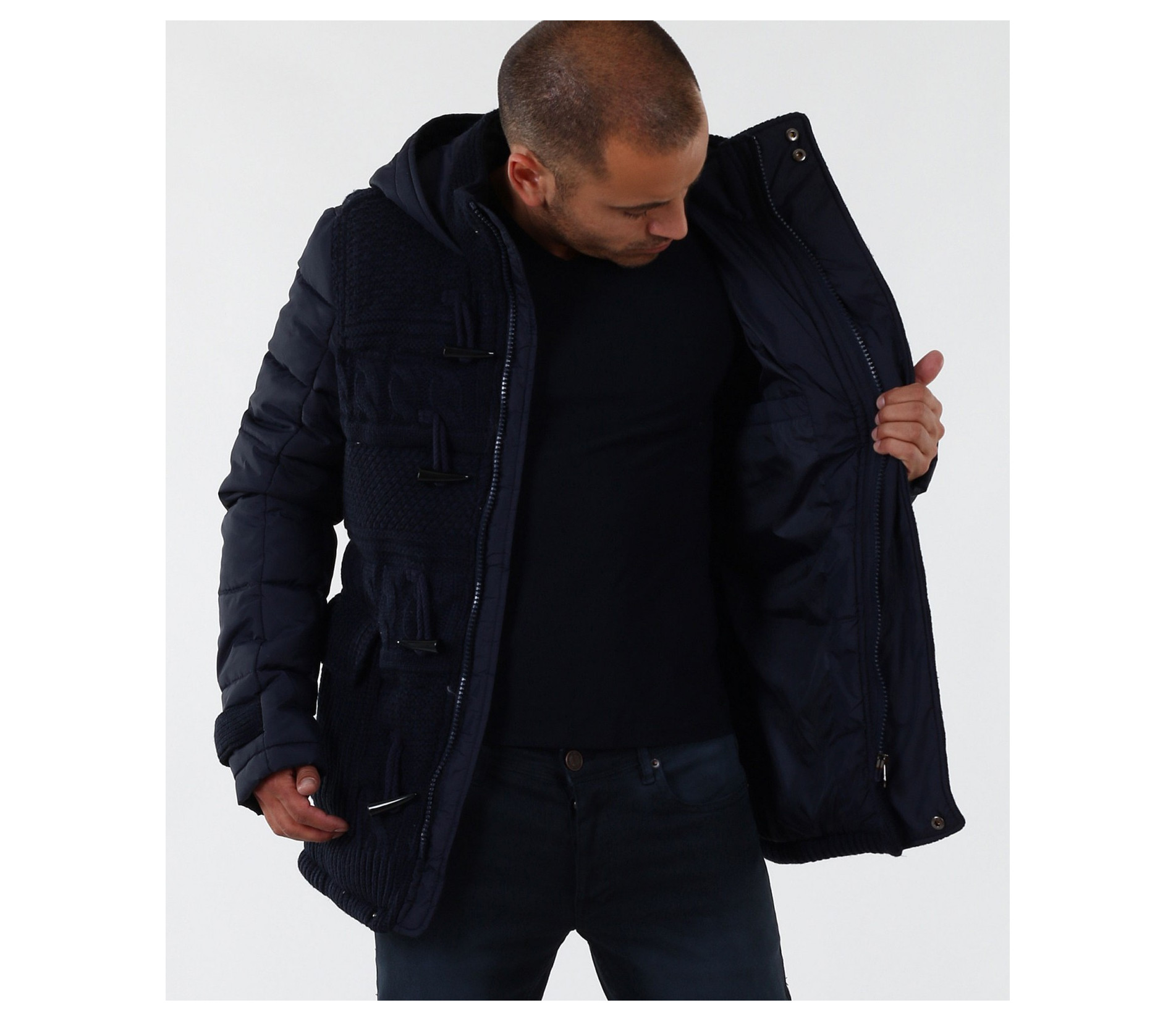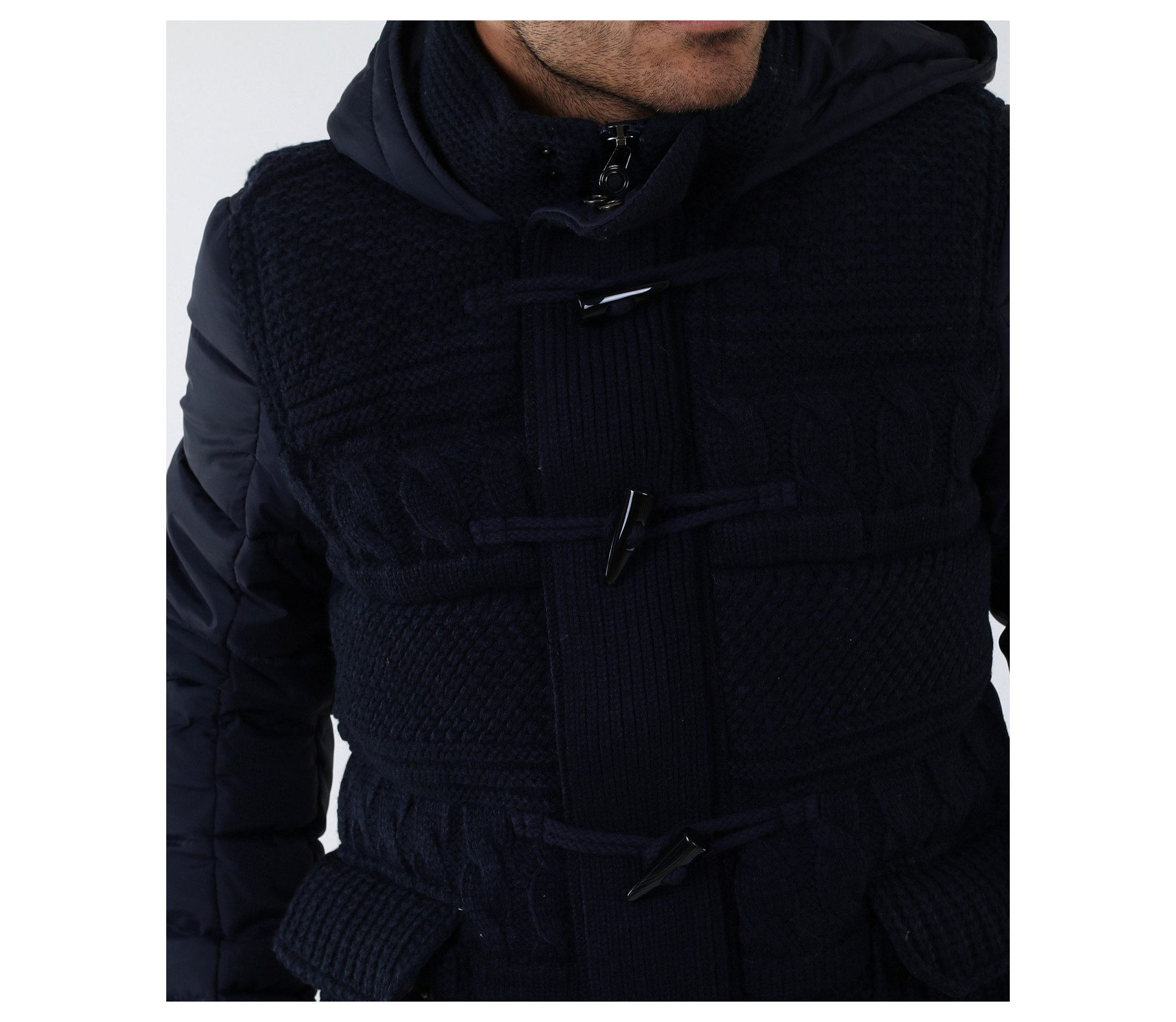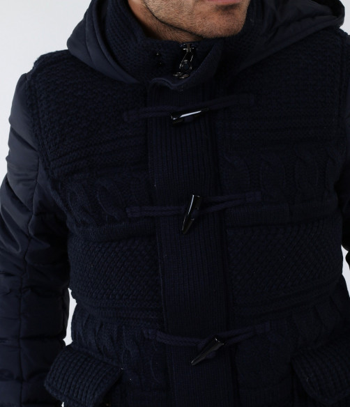 Описание на продукта: Мъжко стилно яке с плетена предната част. Моделът е с леко издължина е вталена кройка. Закопчаването е с цип и големи декоративни копчета. Има качулка, която е с опция за сваляне. Изключително интересен модел, който освен впечатляваща визия е дебело подплатено, с което Ви осигурява топлина през студените зимни дни. В предната част са поставени два дълбоки джоба. В комбинация със спортно-елегантен панталон или дънки, зимни обувки и аксесоар по Ваш вкус, получавате перфектна визия. Изработено от 100% висококачествен найлон.