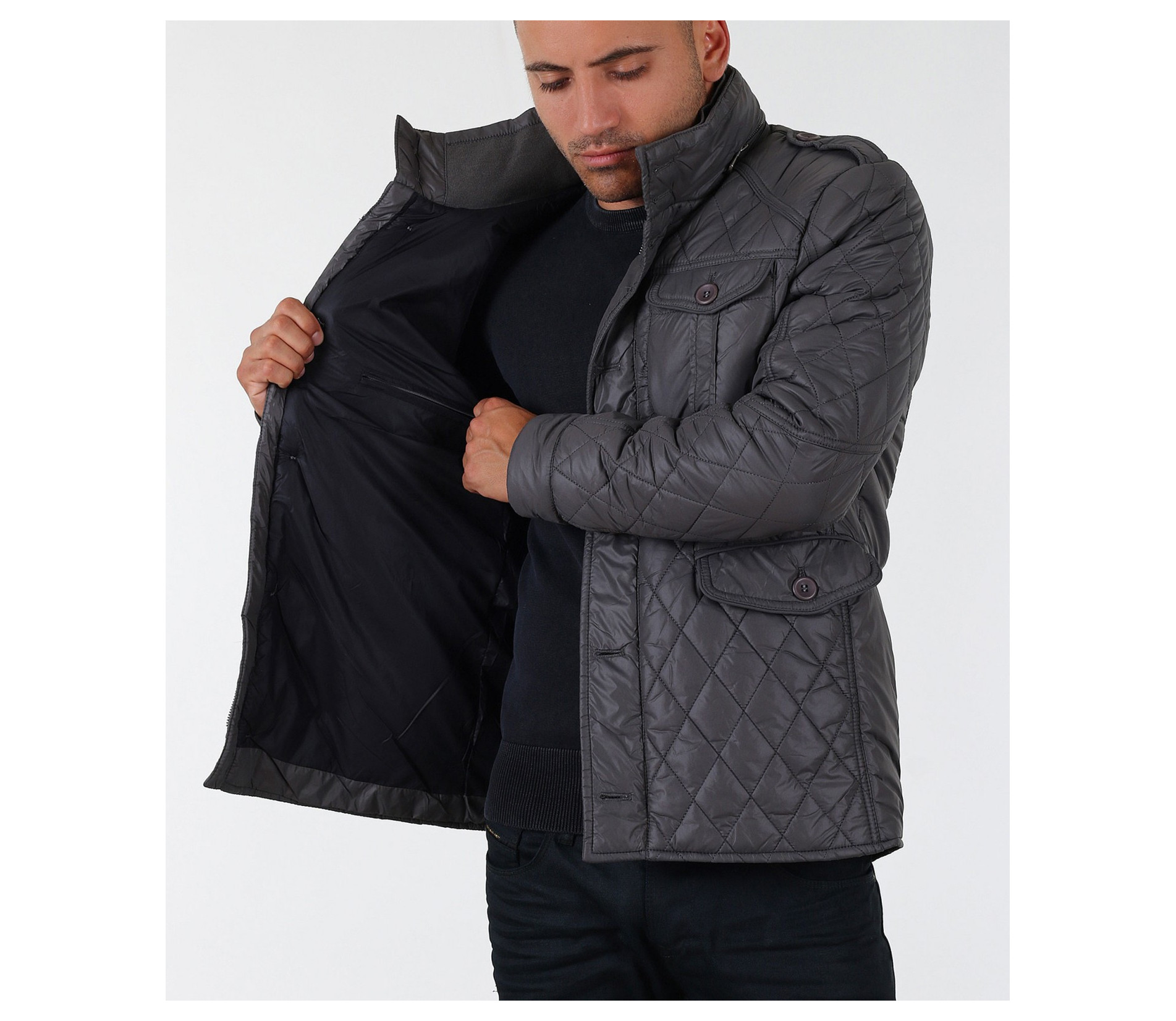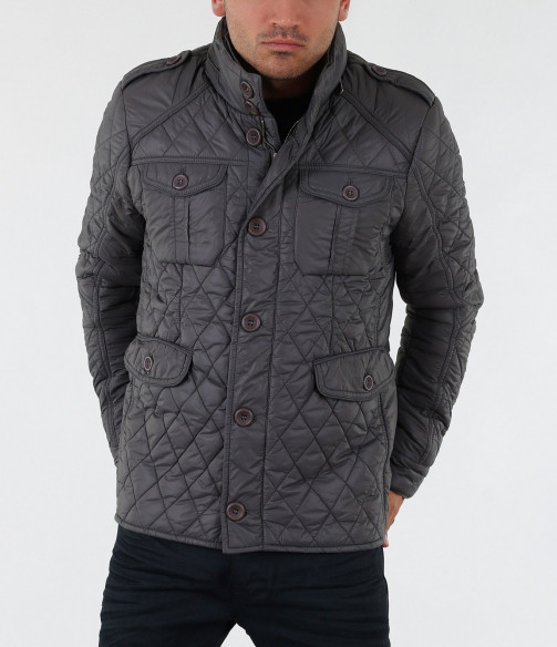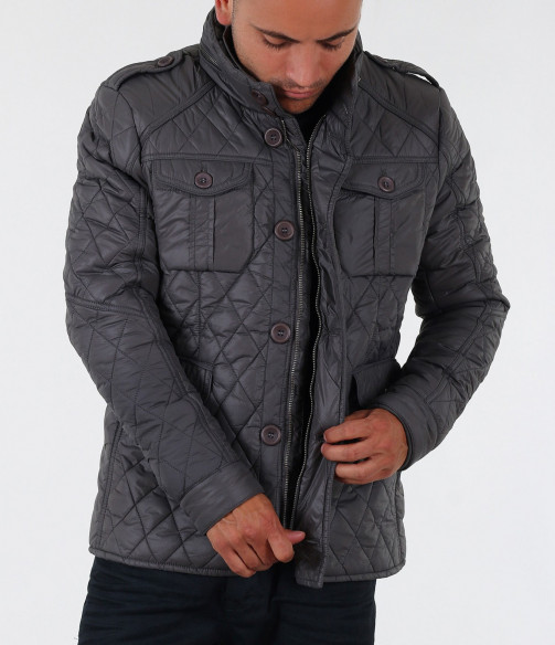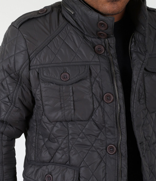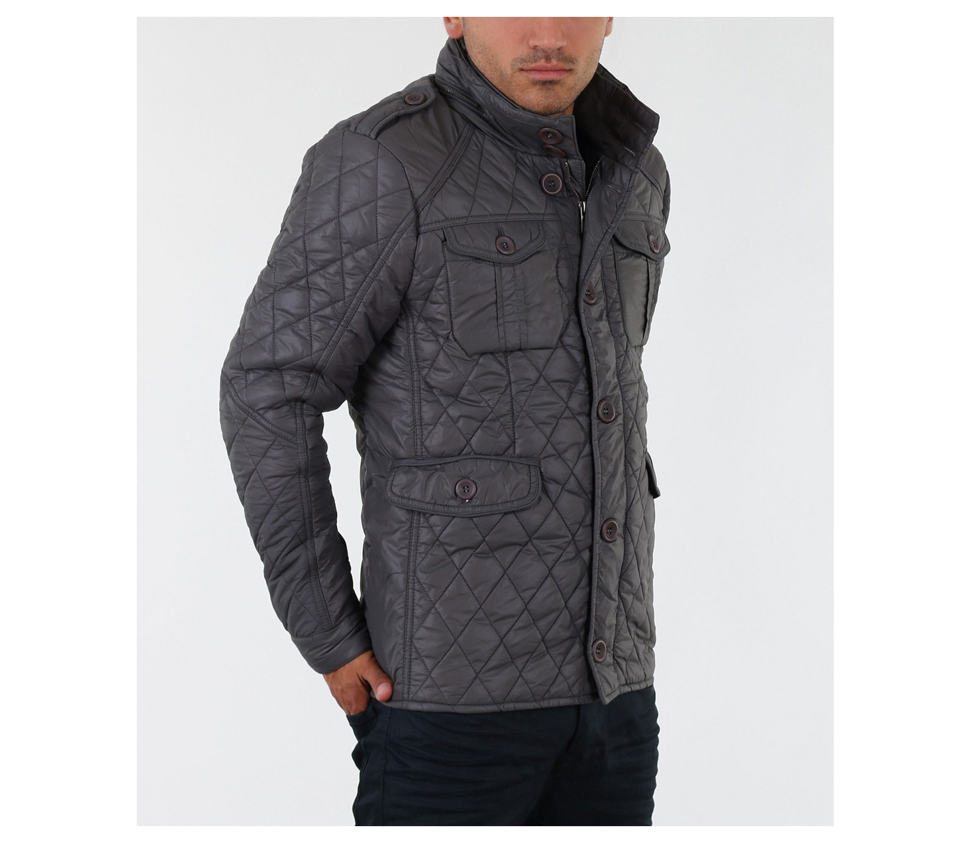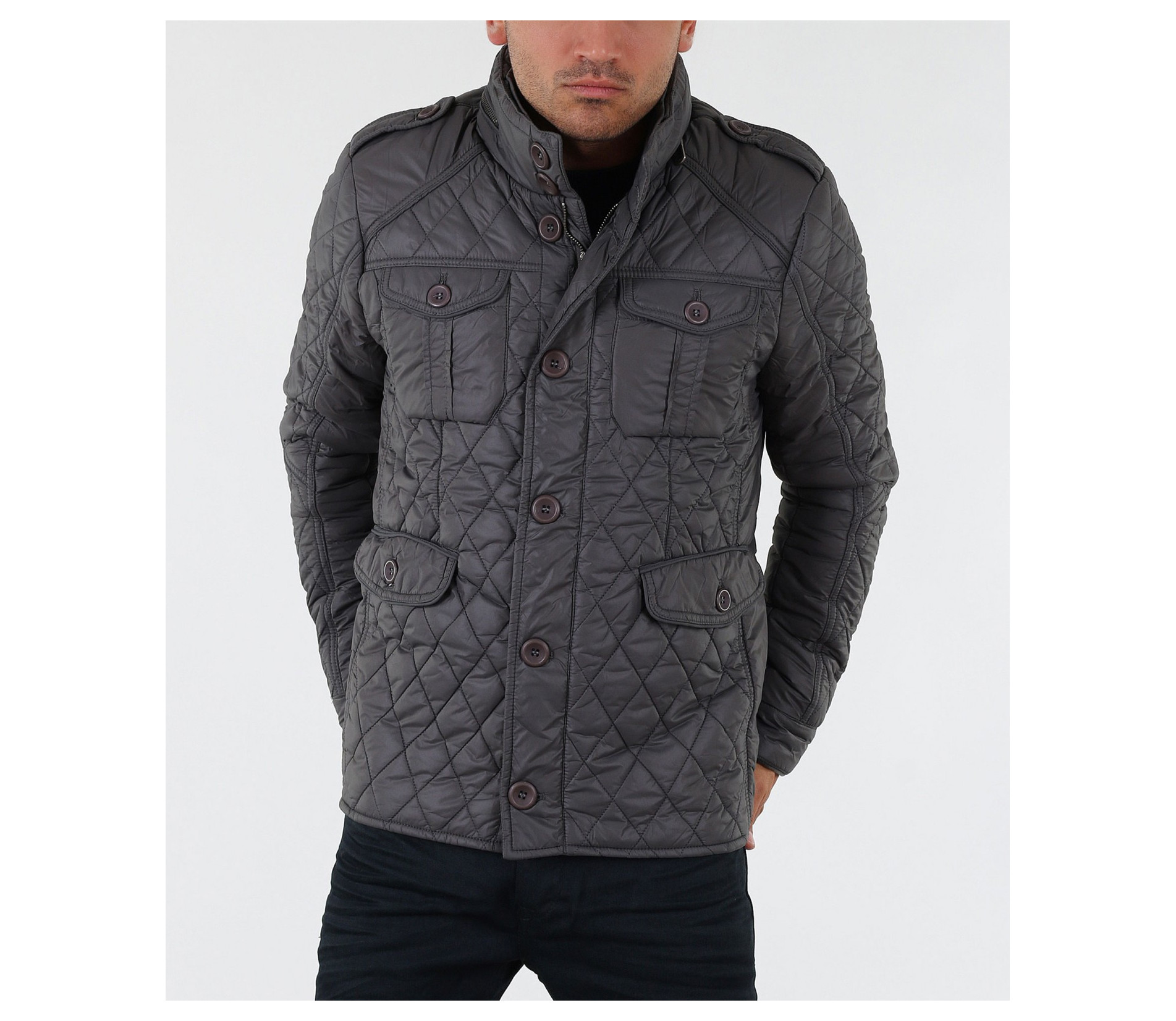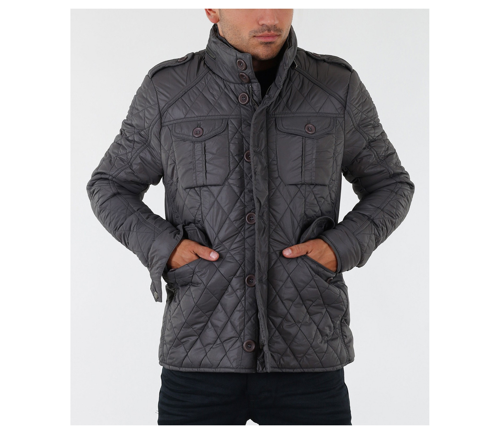 Уникален модел мъжко шушлеково яке с едро набраздена външна част. В областта на гърдите и в долната част на модела са поставени по два джоба с капаче и голямо копче. На ръкавите и раменете са поставени по две ленти декорирано също с големи копчета. Закопчаването на модела с вътрешен цип и големи копчета от външната страна. Този уникален модел яке е с вталена и издължена кройката, наподобяваща спортно сако. Заради спортно-елегантна си визия Ви позволява да го съчетаете както с дънки и спортни кецове, така и със спортно-елегантен панталон и чифт стилни обувки.