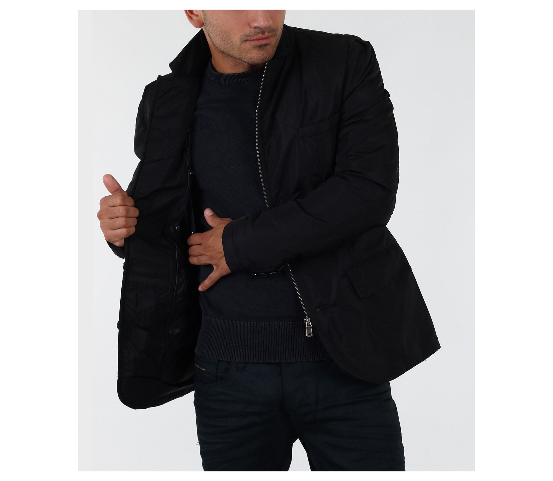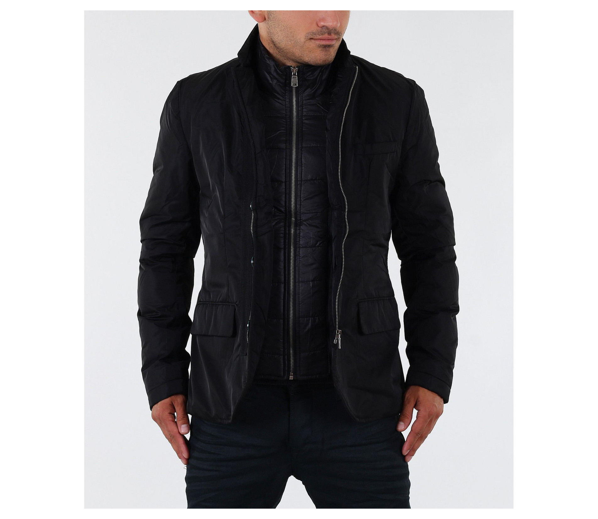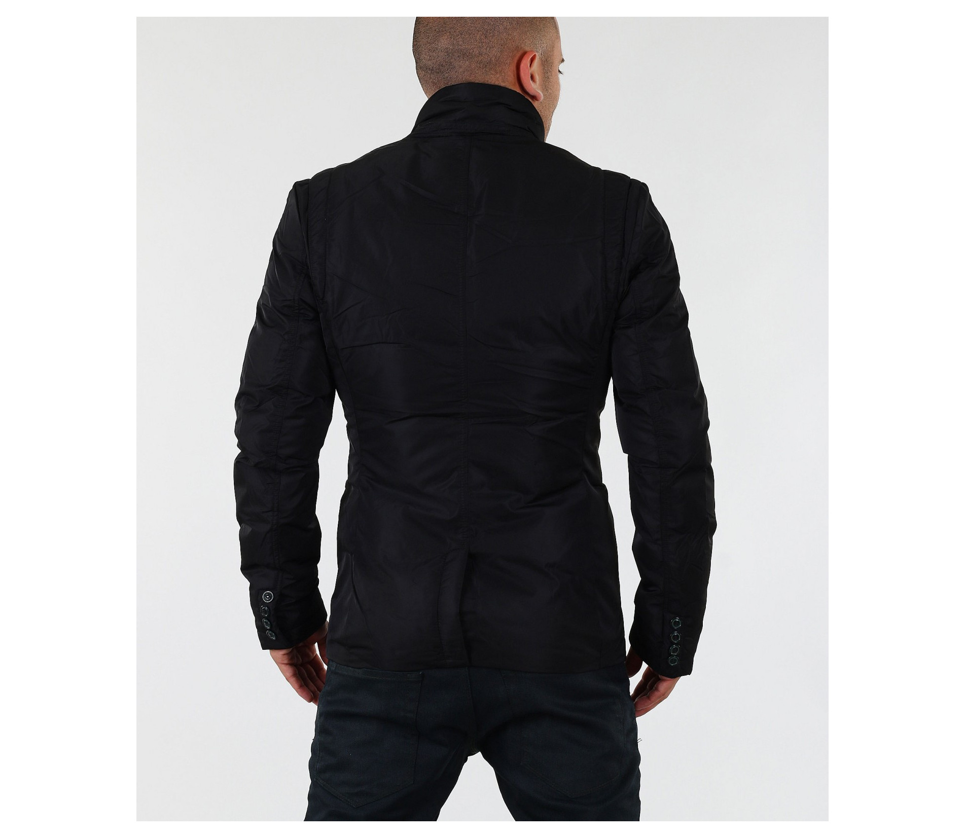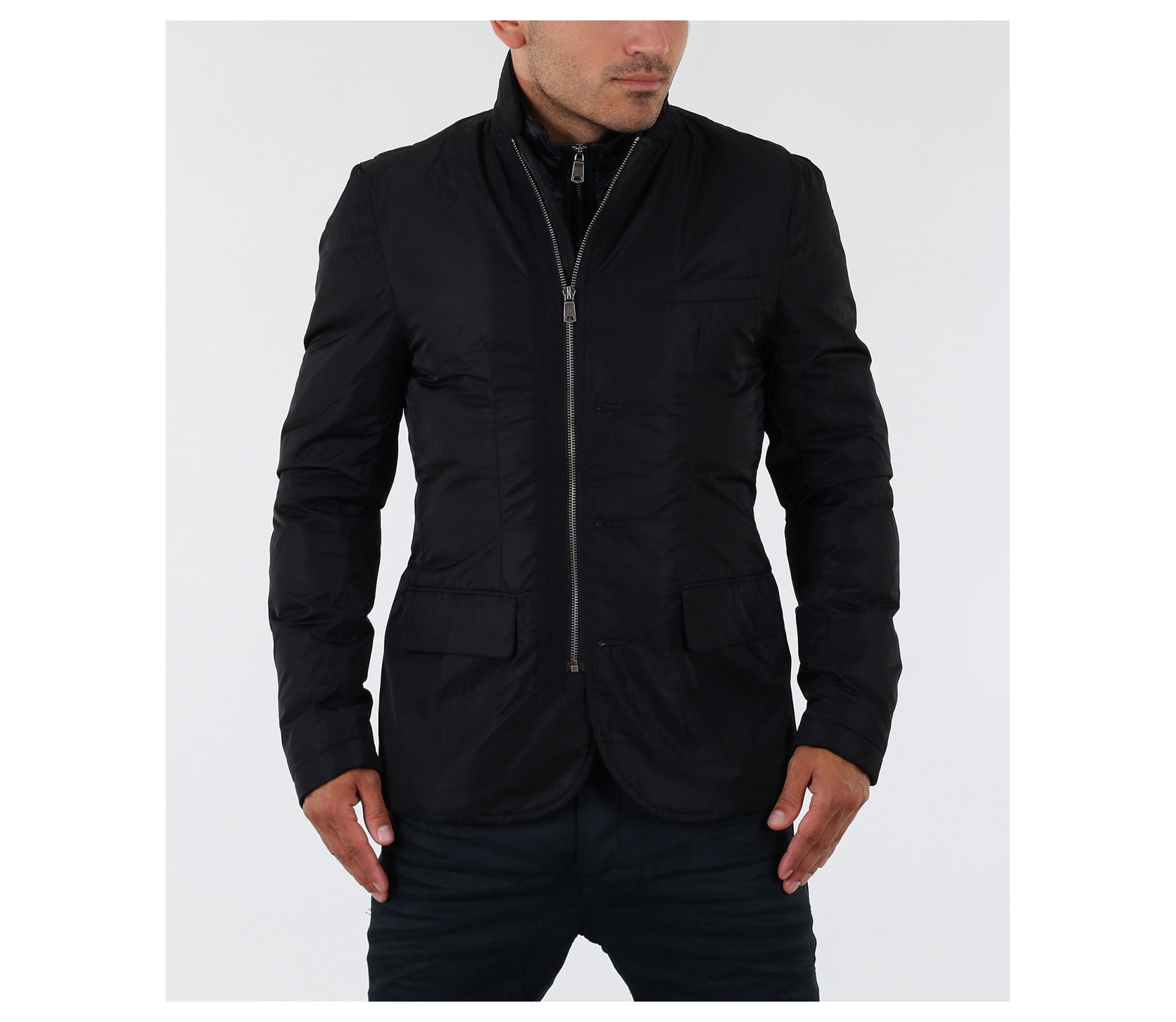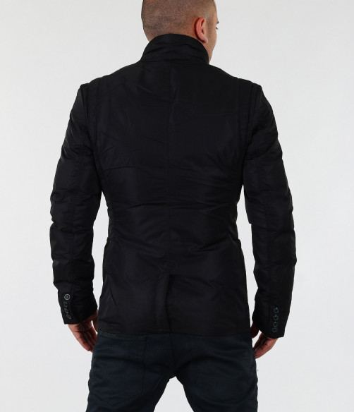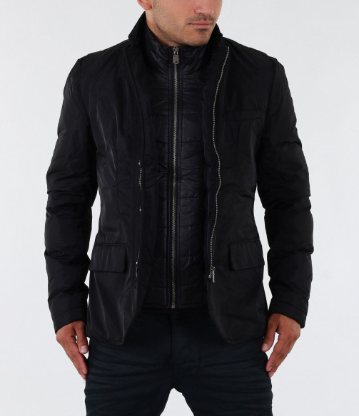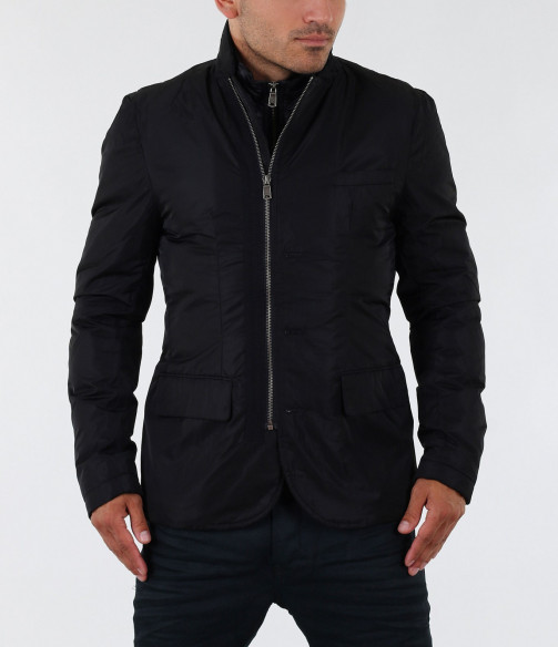Стилно мъжко яке с вталена кройка. Този модел е с едро набраздена външна шушлекова част. В предната част на якето са поставени няколко акцента, превръщащи го в толкова уникален модел. В областта на гърдите има два джоба, като единият е декориран със страничен цип. В долната част също има два джоба с капачета. По цялата дължина на модела са поставени тънки ленти в кафяв цвят. Закопчаването е с скрит цип и акцентирани сребристи копчета от външната страна. Този модел яке е с вталена и леко издължена кройка, с което перфектно би се съчетало със стилната Ви спортно-елегантна визия.
