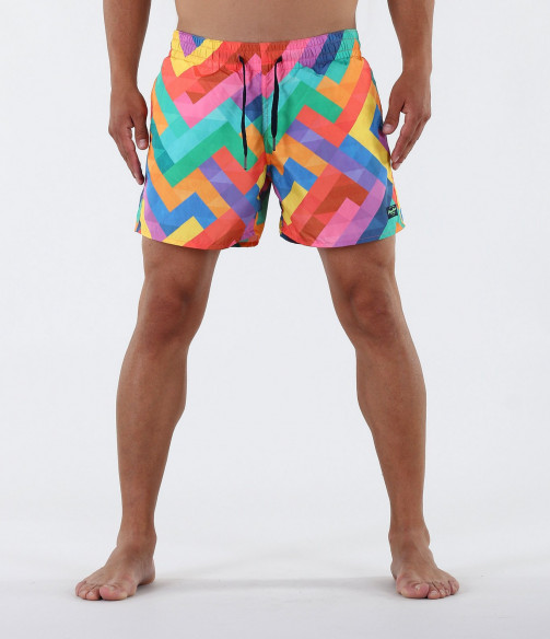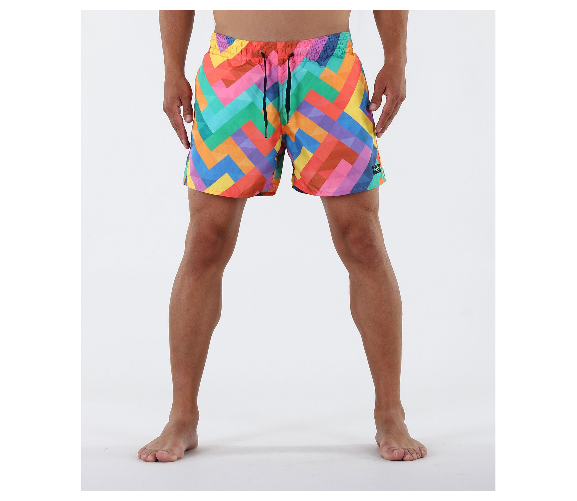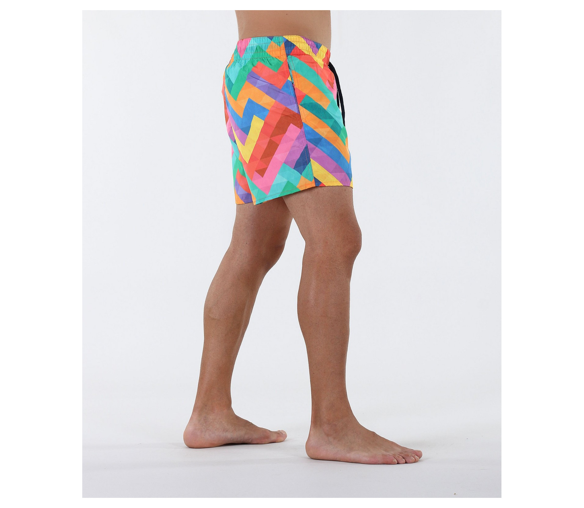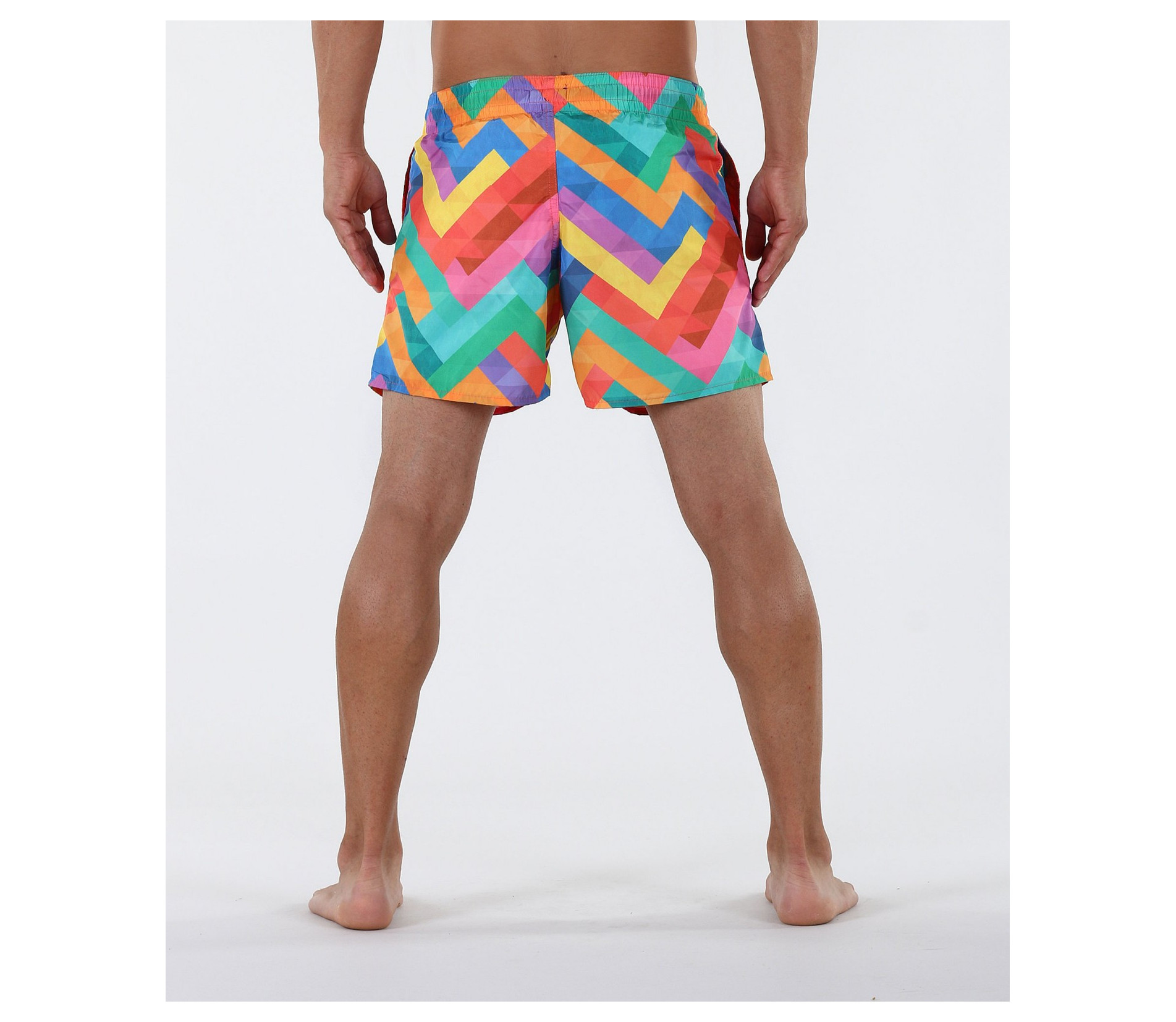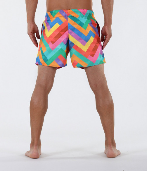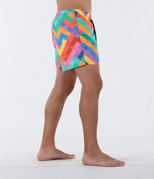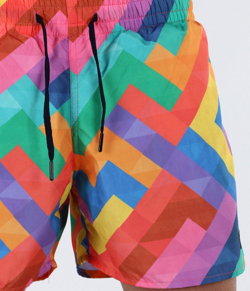 Описание на продукта: Свежи мъжки къси плажни шорти в актуален десен. В принта на модела са събрани едни от най-актуалните цветове, с които със сигурност ще привлечете вниманието на плажа. В областта на колана е поставен широк ластик през който минават и връзки. В долната част на шортите е поставено логото на фирмата. Освен за плажа, тези шорти могат да влязат и в ежедневното Ви облекло за една дълга и приятна разходка.