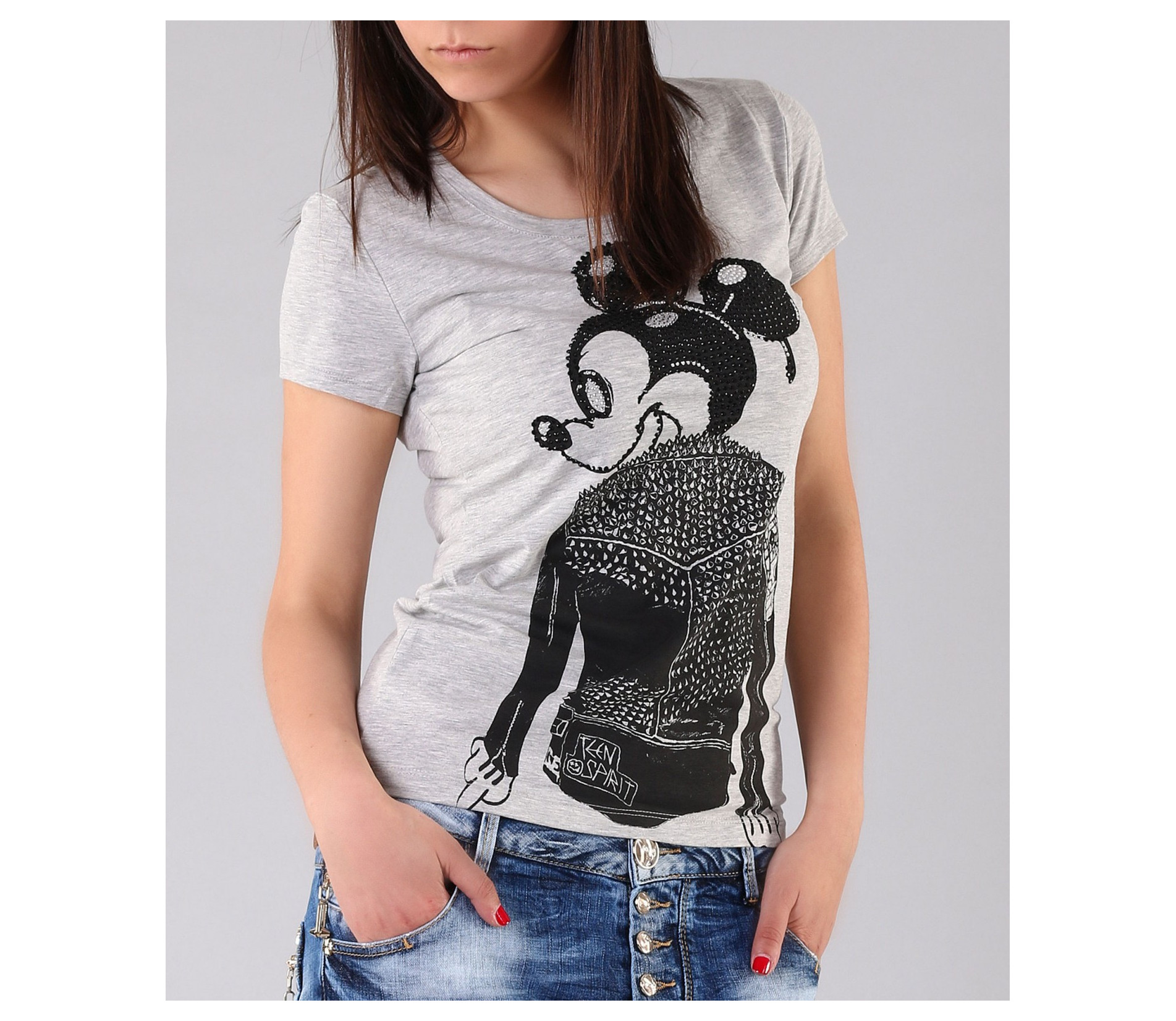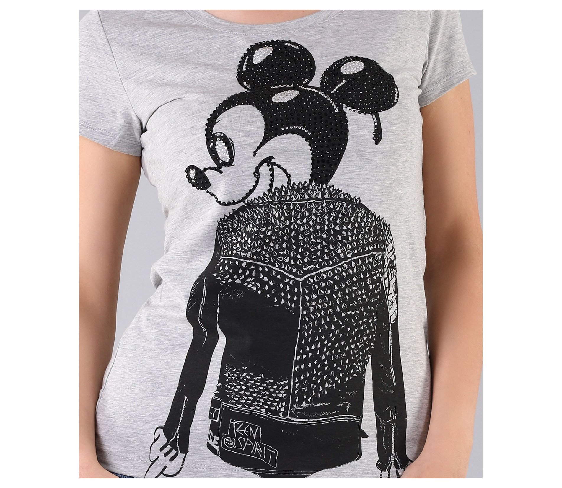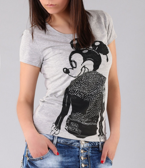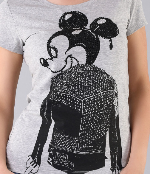 Свежо предложение за Вас, дами. Стилна спортно-елегантна тениска с интересен принт. В предната част на модела има щампа изобразяваща модерният за сезона Мики Маус, декориран с камъни и малки декоративни шипове. Изчистеният гръб позволява акцента да падне върху лицето на тениската. Супер стилен модел с овално деколте и къс ръкав. Дължината на моделът е стандартна. В съчетание с модерни къси или дълги дънки, свежи обувки и аксесоар по Ваш вкус, сте готова за привличане на погледите върху себе си. С изработката си от 92% чист памук и 8% еластант, този модел Ви гарантира 100% удобство и качество!