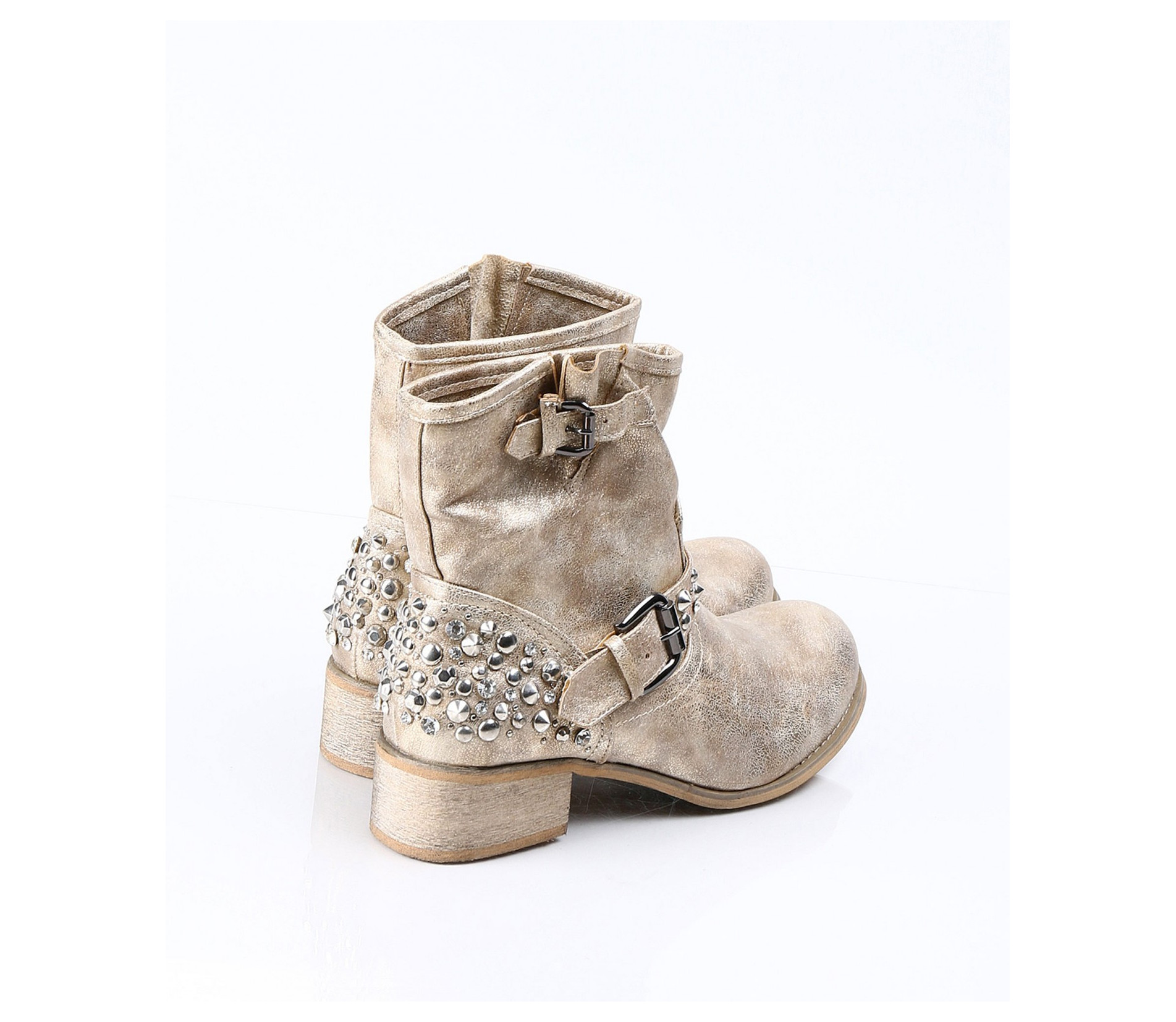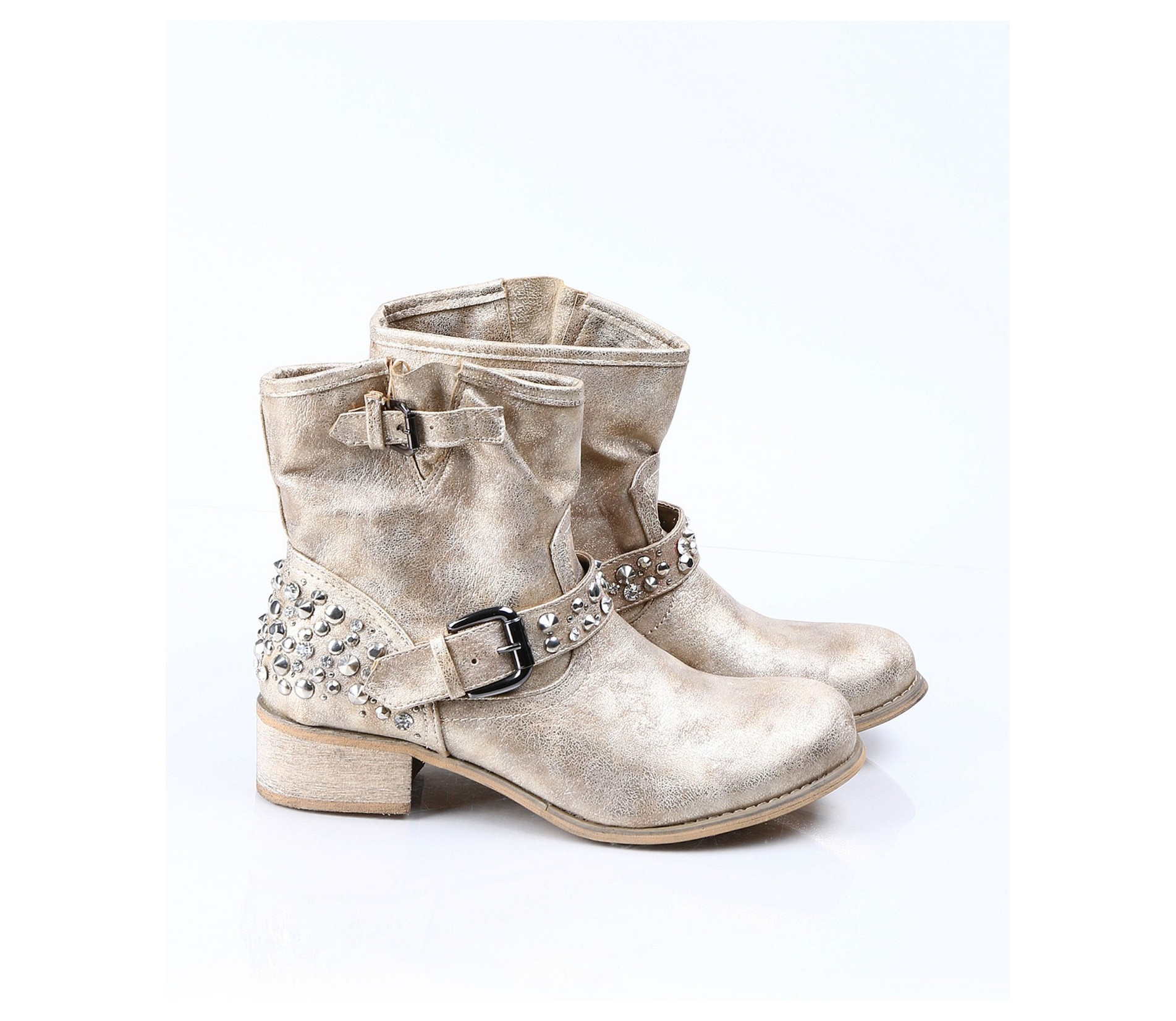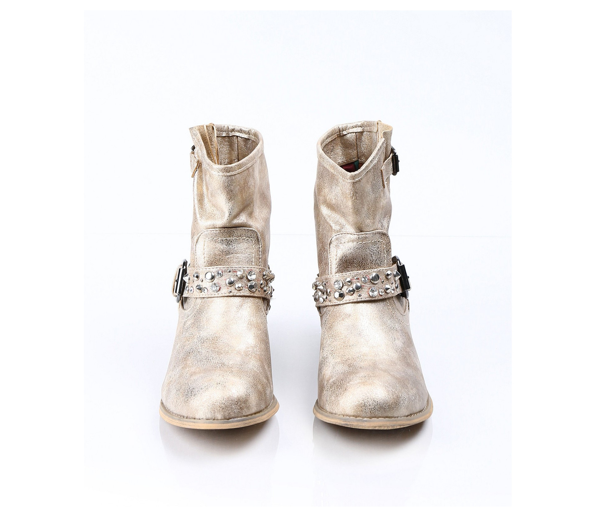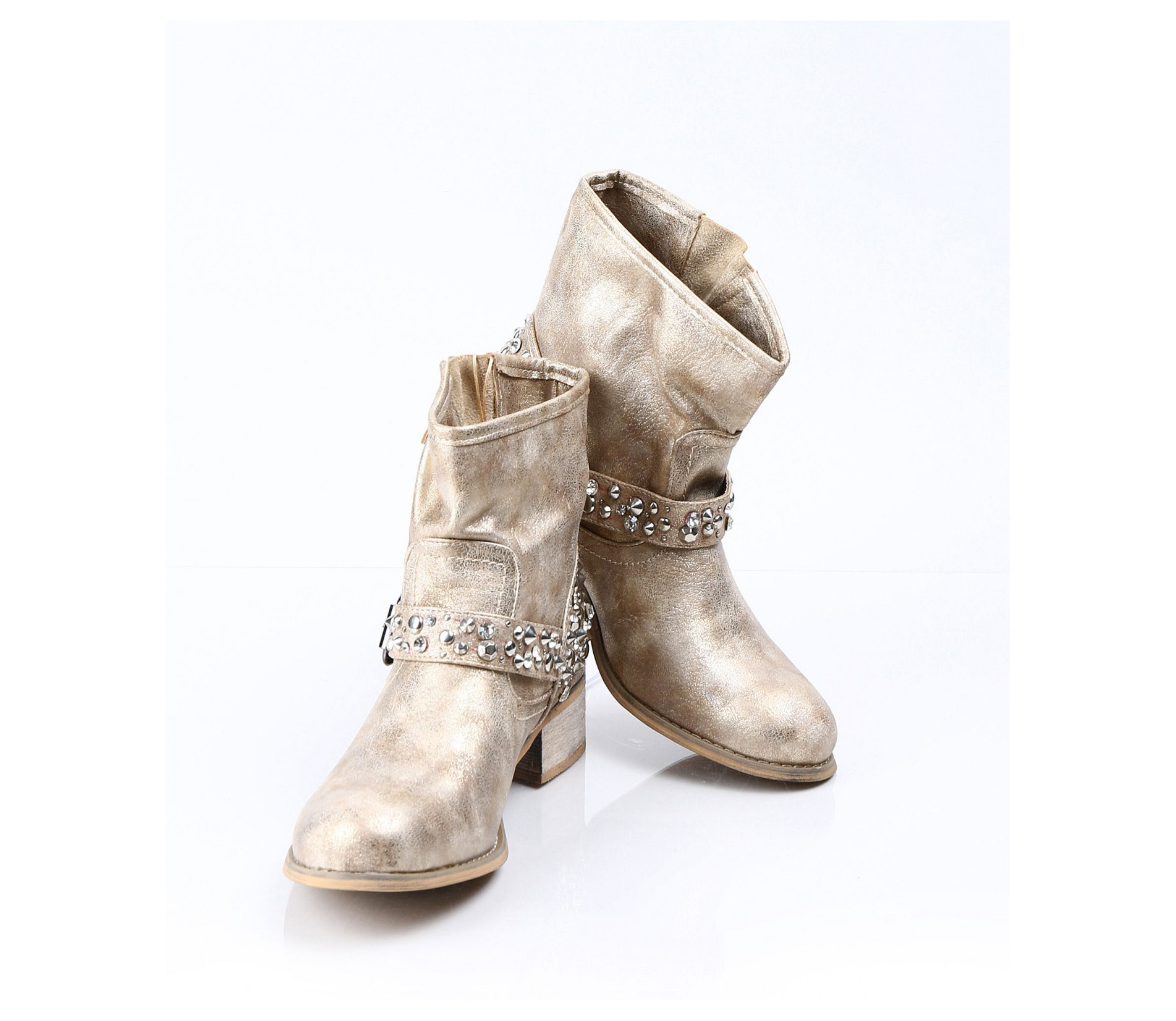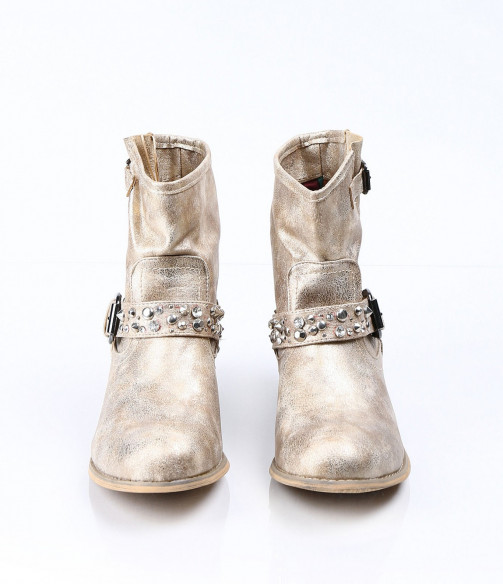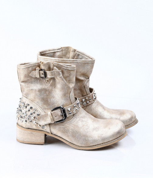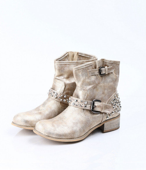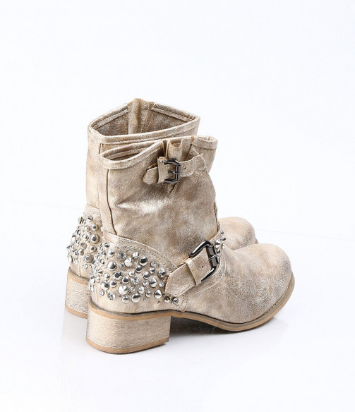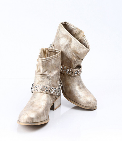 Описание на продукта: Дамски златисти боти с интересна декорация. Този модел е изключително атрактивен и модерен. Има малък и удобен ток, напълно подходящ за ежедневието. В областта на петата има декорация от малки капси . Същите са разположени и по каишката, разположена в предната част. В горната част на ботите също има малка каишка, чиято цел е да свива модела според желанието ви. Съчетайте с комфортни дънки, яке и подходящ аксесоар и станете център на вниманието.