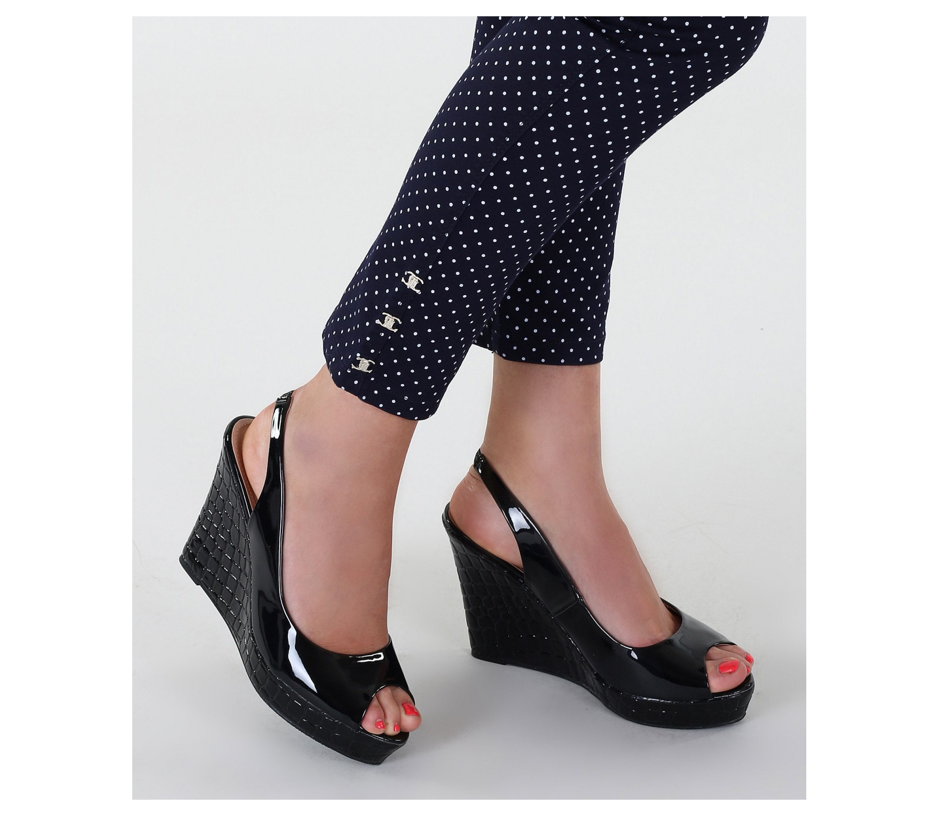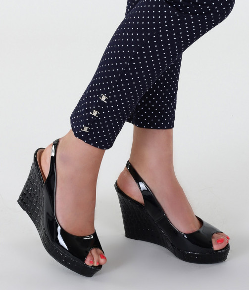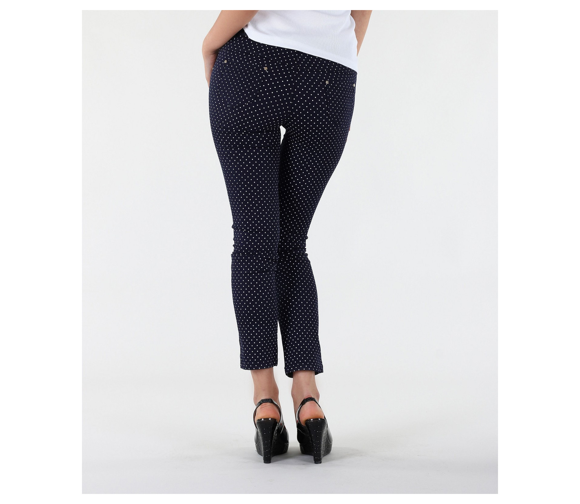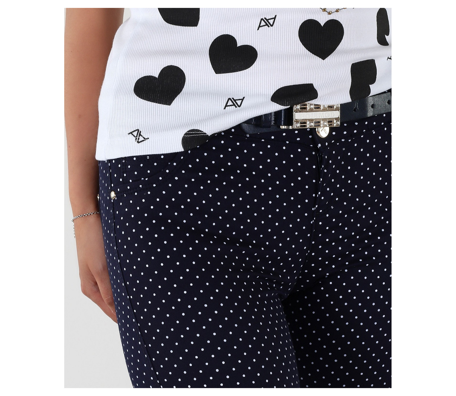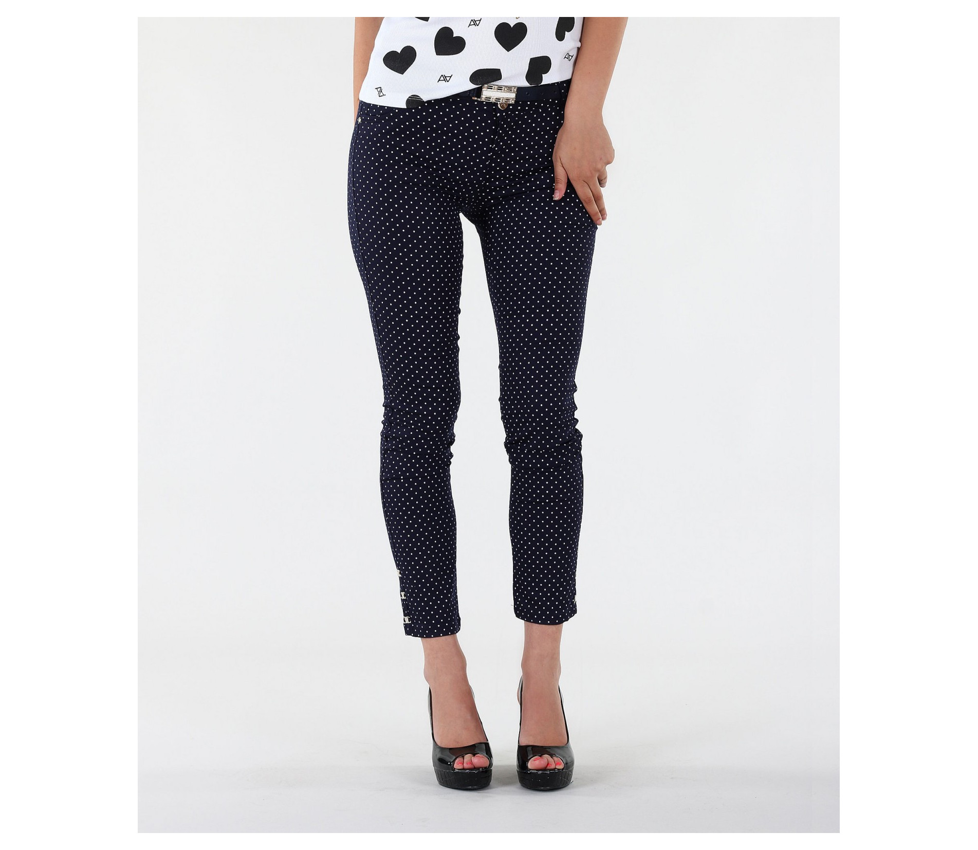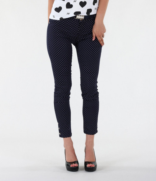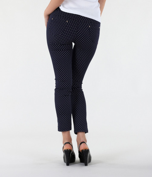Страхотно предложение на дамски син панталон, декориран с малки бели точки. В предната и в задната част са поставени по два малки джоба, декорирани с малки златисти капси. Кройката на този модел панталон е силно втален, а дължината е актуалната за сезона 7/8. В долната част на крачолите са поставени по две златисти декоративни копчета. В комплект с панталона е и нежен тъмносин колан със златиста катарама, който перфектно завършва визията на модела. В комбинация със спортно-елегантна риза или потник, обувки на висок ток и стилна чанта, сте готови да привлечете всеки поглед върху себе си.