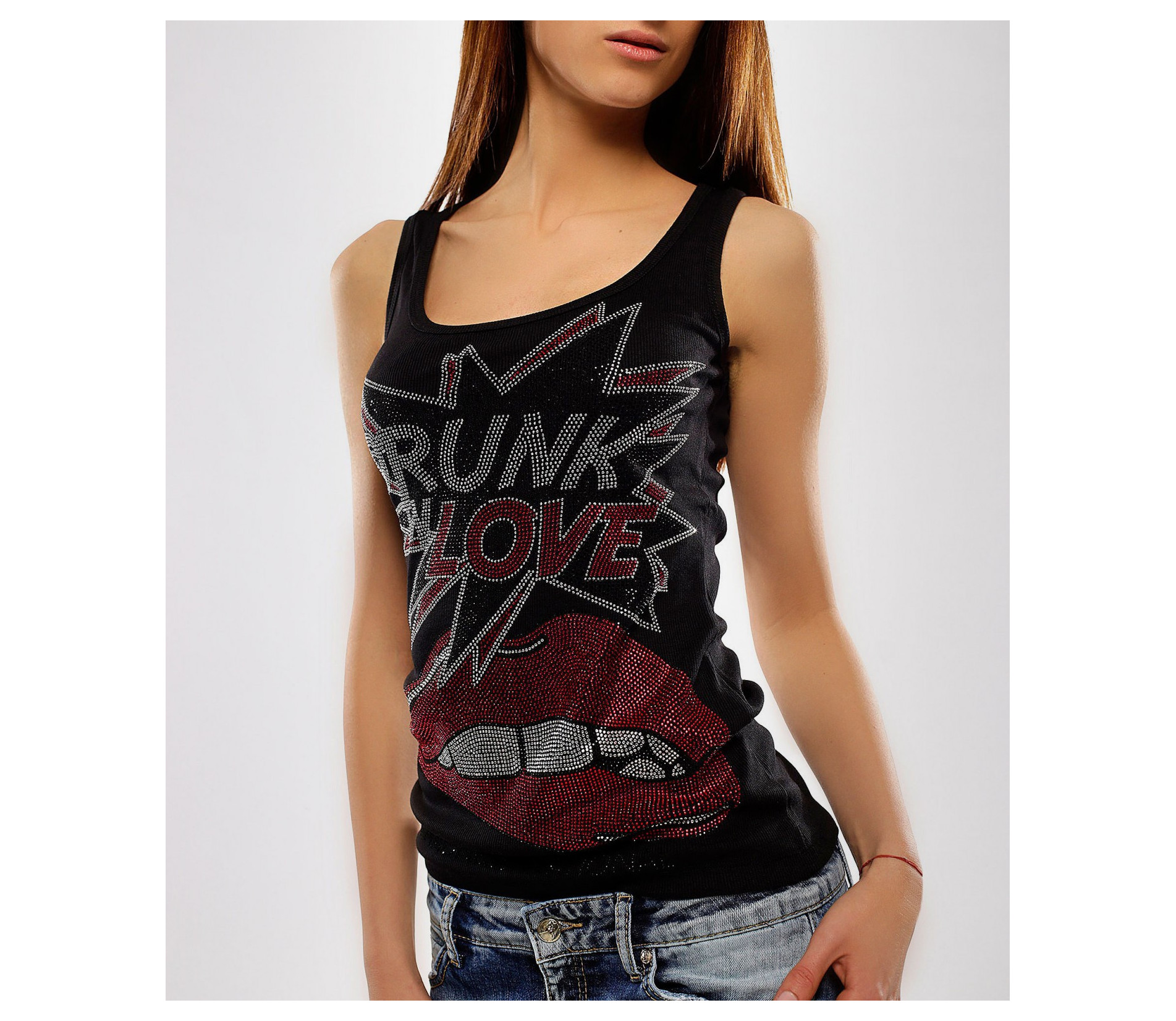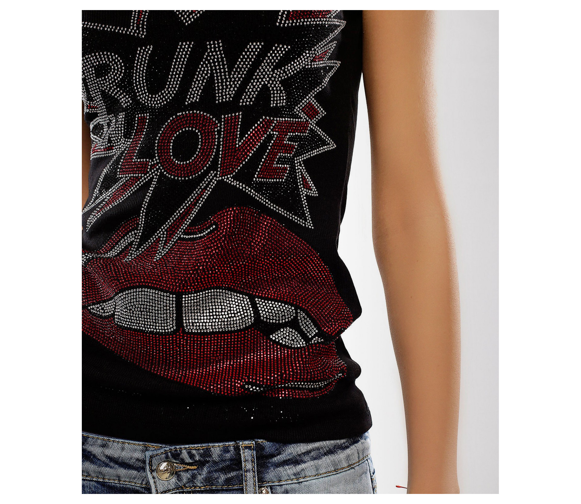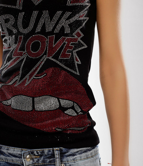 Описание : Уникален дамски потник с цветен принт в предната част изобразяващ целувка . Апликацията е изработена изцяло от камъни. Гърбът на потника е напълно изчистен. Изработен от викокачествени материали, гарантираме високо качество и безупречна визия...