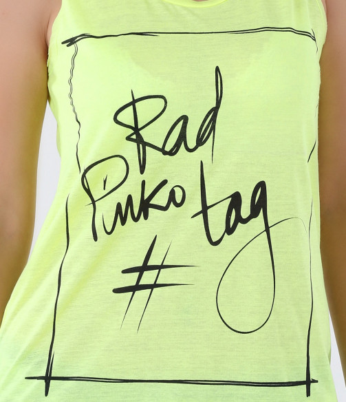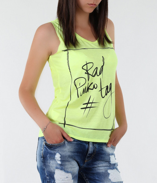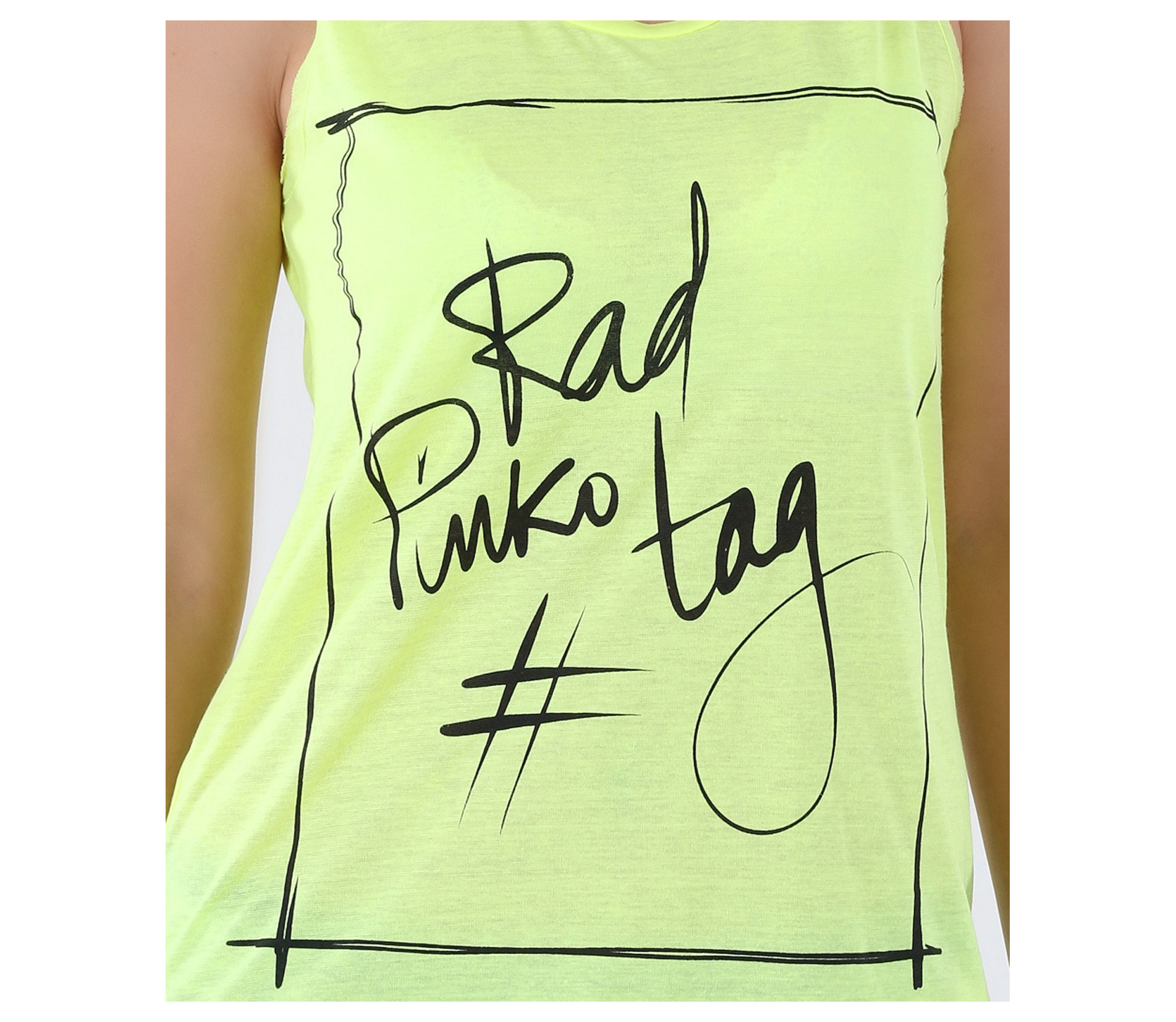 Описание на продукта: Актуално предложение за Вас, дами. Модерен потник в актуалния за сезона електриково жълт цвят. В предната част, като акцент, е поставена черна рамка декорирана с едър надпис Rad Pinko Tag. Кройката на модела е свободна а материята е изключително удобна и е с леко прозиращ ефект. Комбинирайки този актуален модел потник със стилни дънки, модерни обувки на нисък или висок ток и аксесоар по Ваш вкус, завършвате перфектната клубна визия.