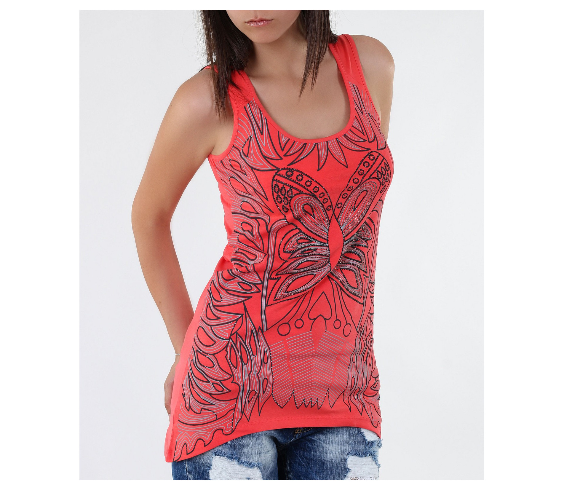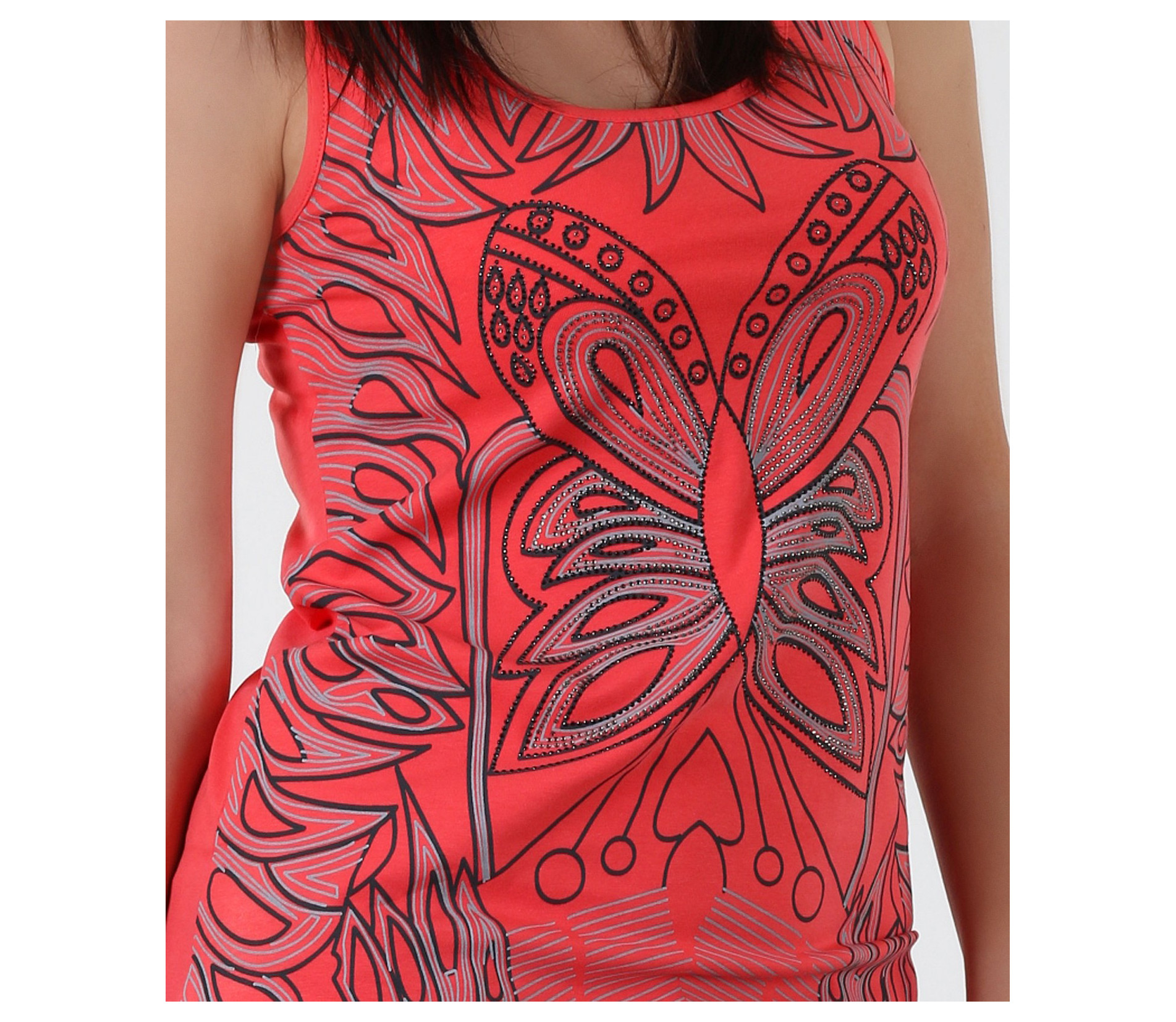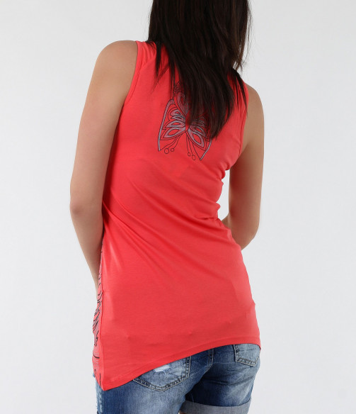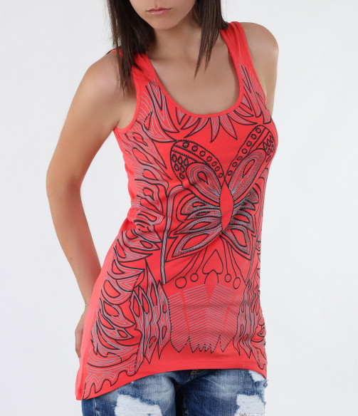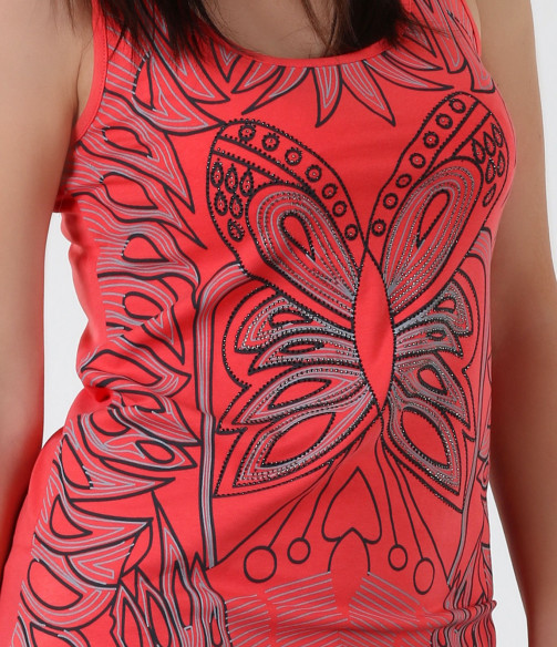 Нестандартен дамски розов потник. В предната част и в областта на врата са поставени раздвижени орнаменти, декорирани с малки камъни. Кройката на модела е вталена, като от двете долни страни потника е издължен. Деколтето е дълбоко и овално. Десена на този модел потник е в актуалния за сезона светъл корал. В комбинация със светли стилни дънки, цветни сандали и стилна чанта, завършвате перфектна визия.