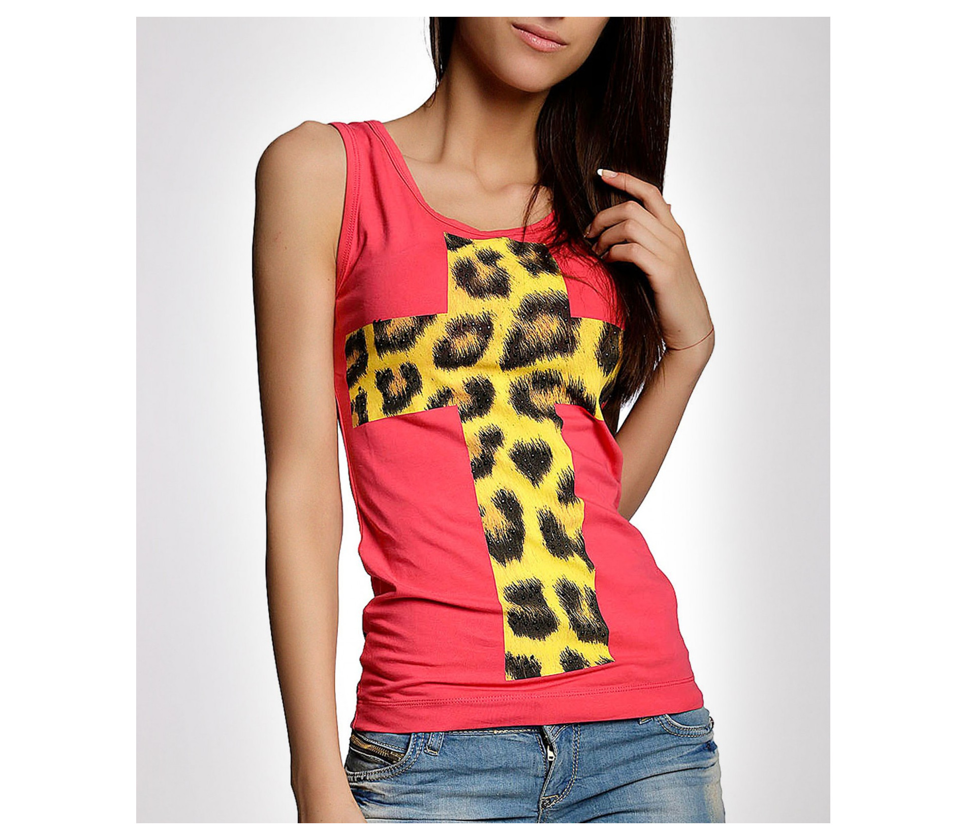 Актуален дамкси потник с интересен принт. Този модел е в свеж коралов цвят. В предната част е поставен голям декоративен кръст в леопардов десен. В долната долна част, като допълнителен акцент, е поставен надпис отново в леопардов десен. Кройката на модела е вталена с овално деколте и стандартна дължина. В комбинация с дънки или панталон, чифт спотно-елегантни обувки и ефектен аксесоар, Вие получавате впечатляващата визия към която се стремите.