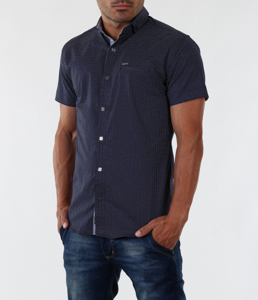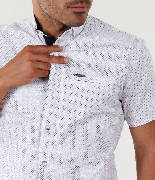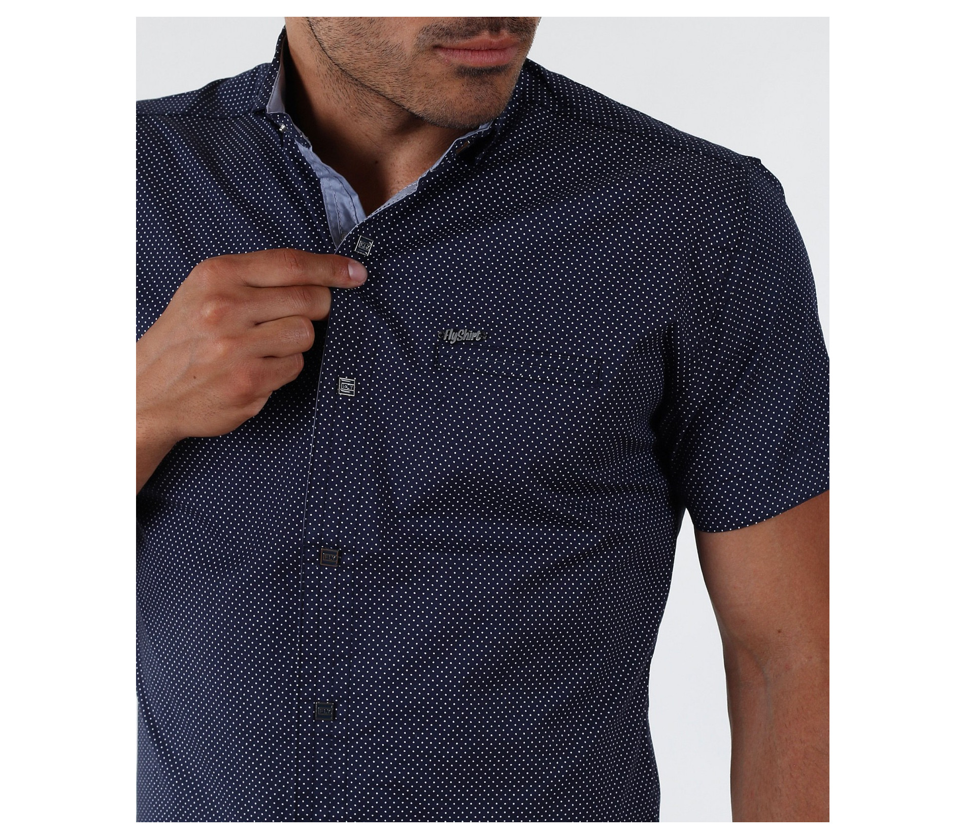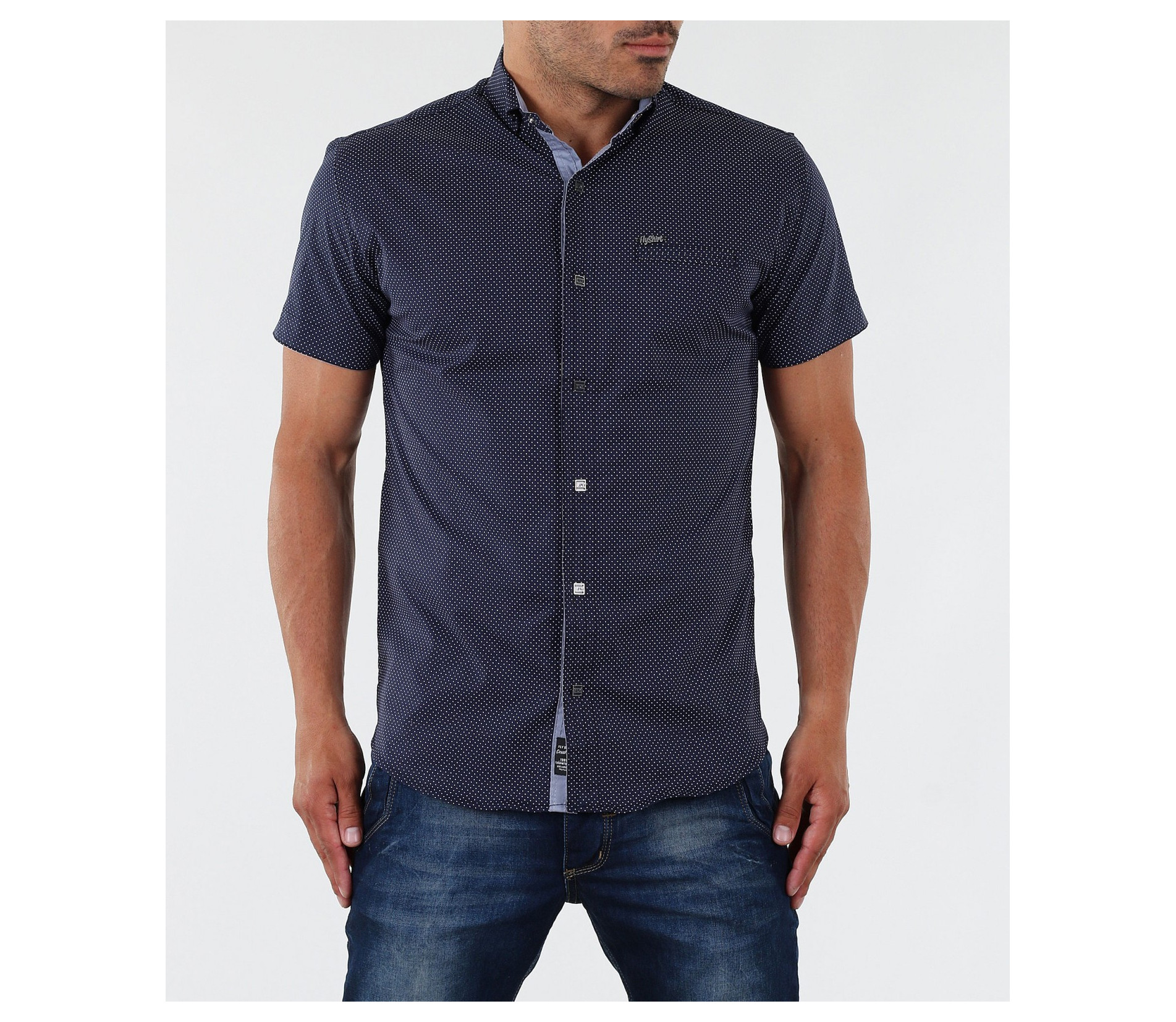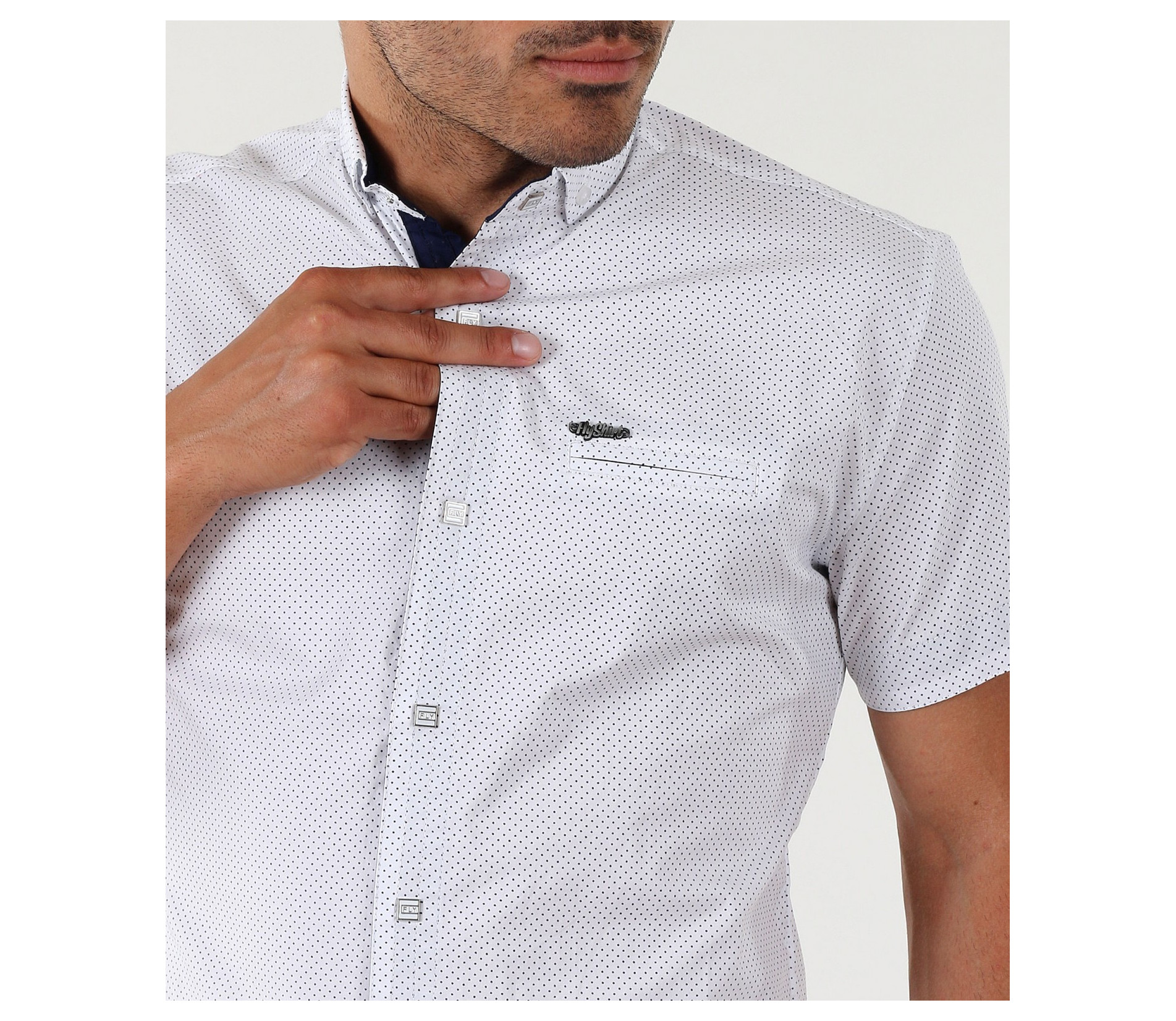 Описание на продукта: Свежа мъжка риза с къс ръкав. По цялата основа на ризата са поставени малки тъмни точки. В областта на гърдите има малък джоб, декориран с метално лого на марката. Закопчаването на този модел риза е с квадратни метални копчета като под тях е поставен тъмен кант. Яката на модела е ниска тип попска, с възможност за закопчаване. Този изключително свеж модел, в комбинация с дънки или спортен панталон, чифт кецове и стилен колан за завършек на визия, Ви осигурява перфектен вид, повдигнато самочувствие и 100% комфорт.