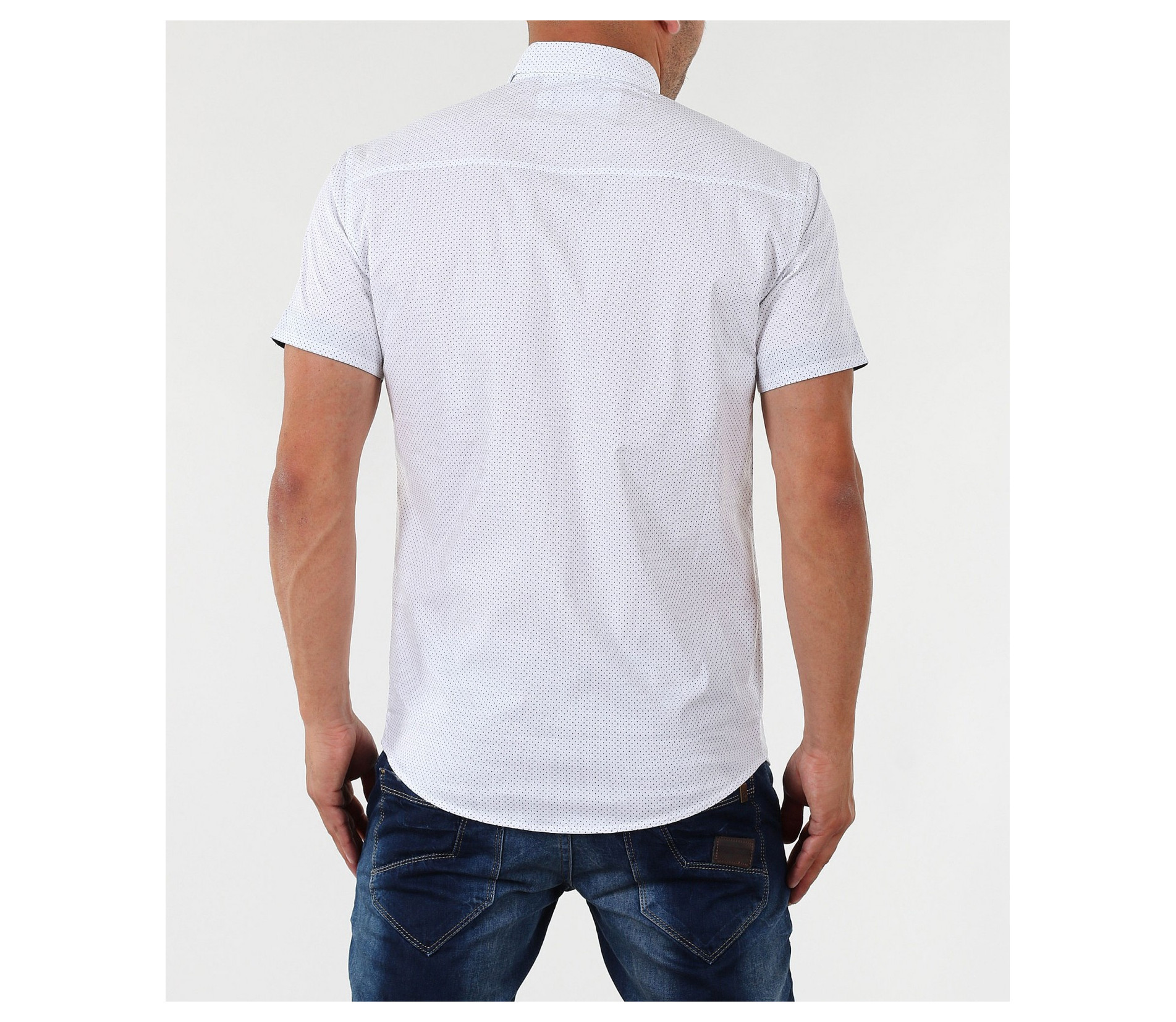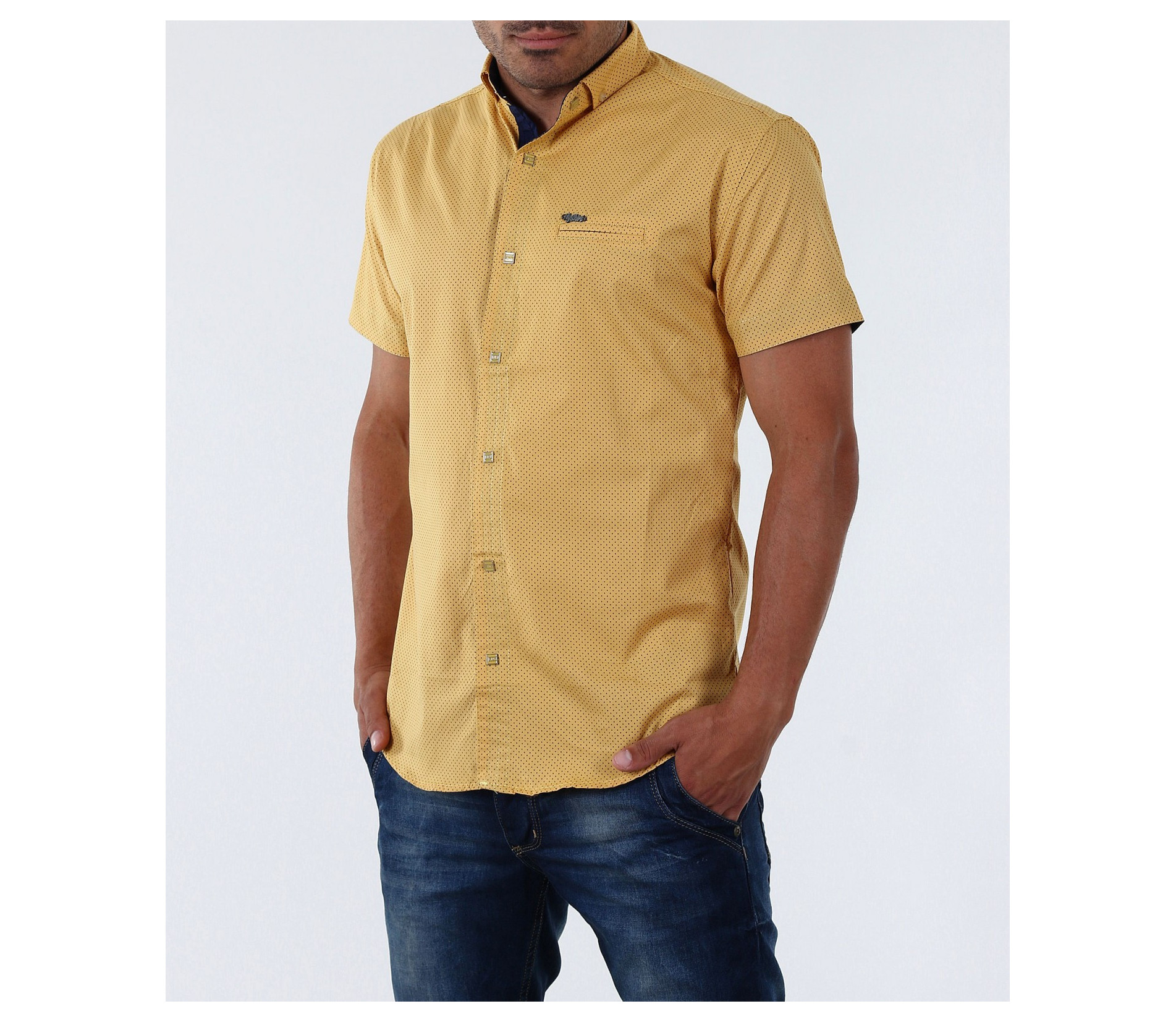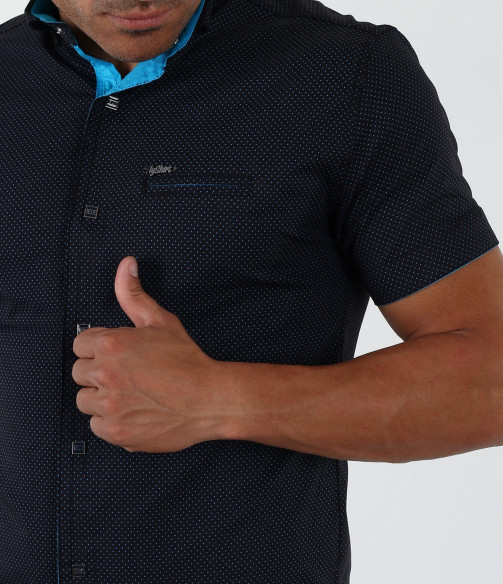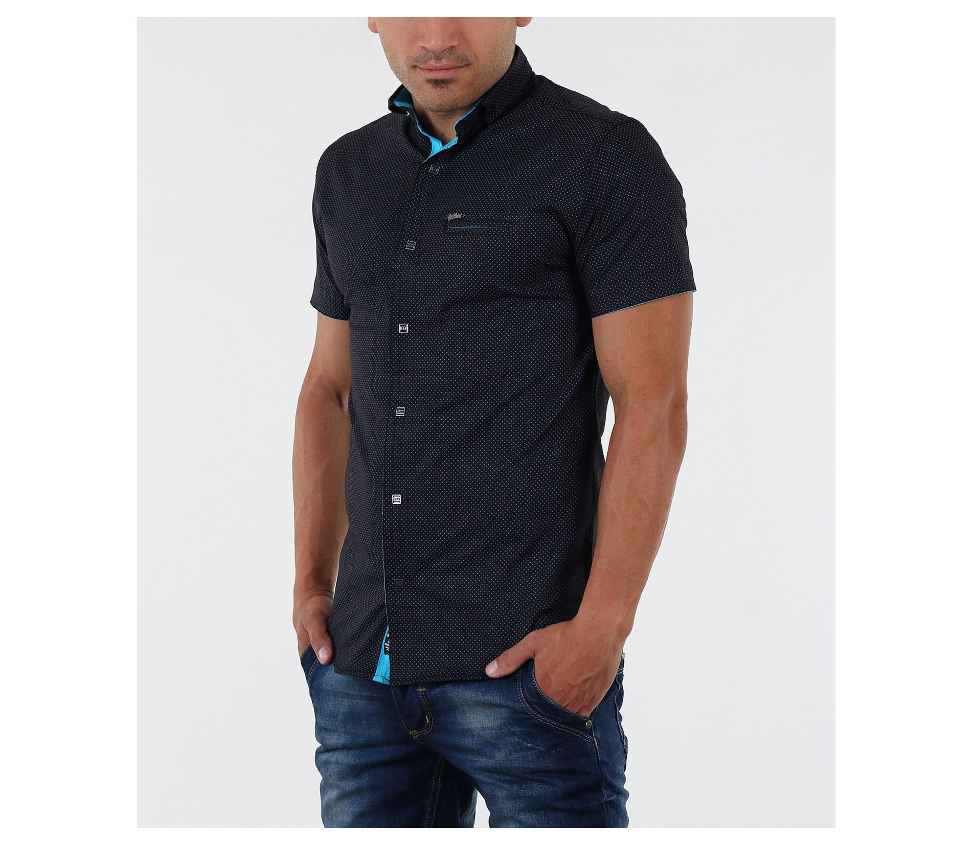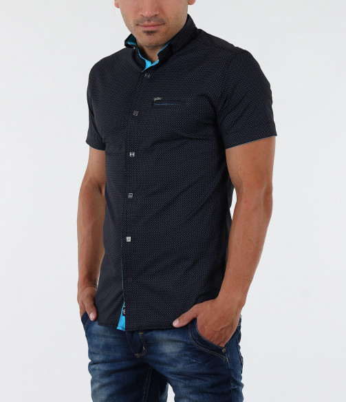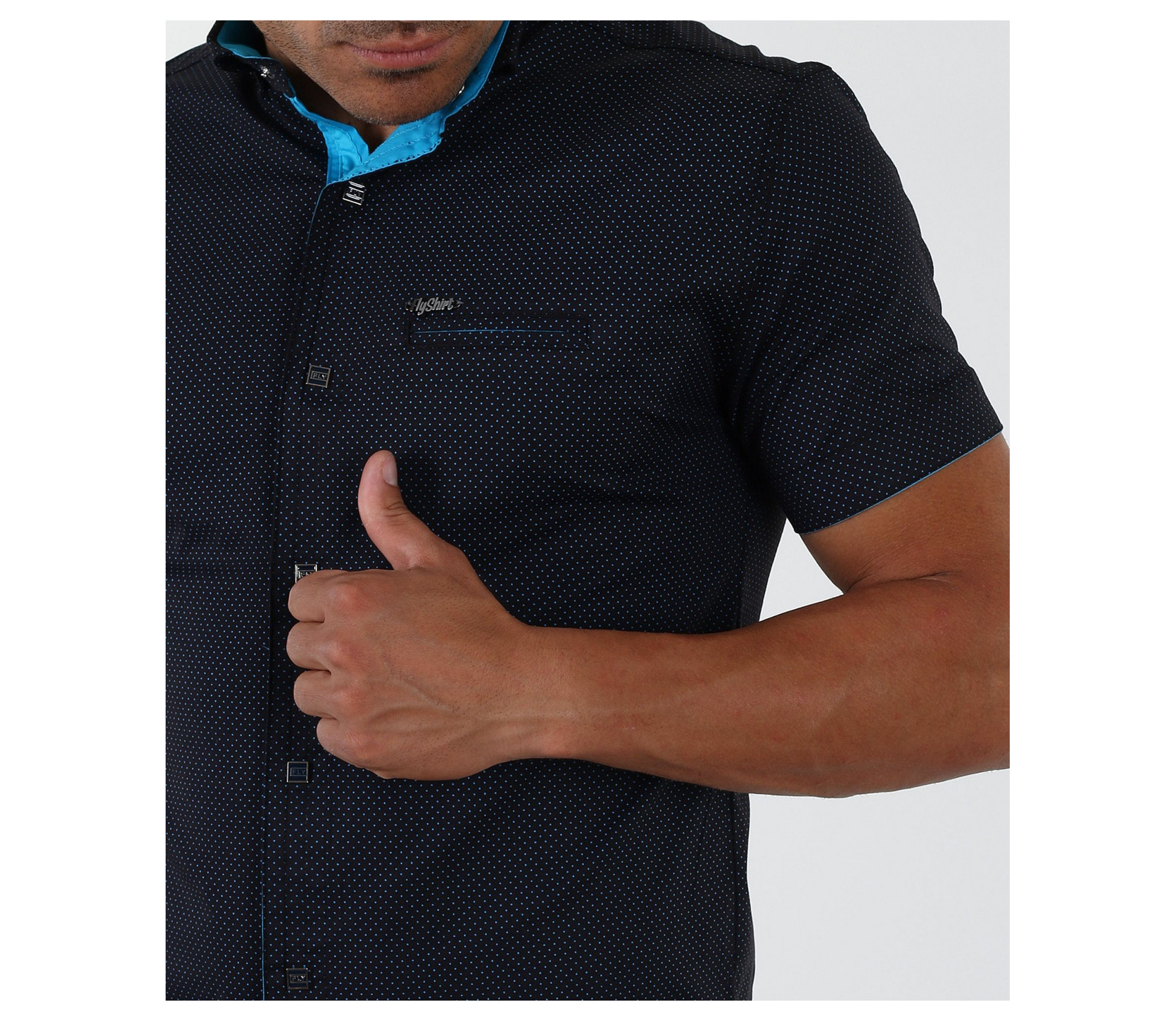 Описание на продукта: Свежа мъжка риза с къс ръкав. По цялата основа на ризата са поставени малки тъмни точки. В областта на гърдите има малък джоб, декориран с метално лого на марката. Закопчаването на този модел риза е с квадратни метални копчета като под тях е поставен тъмен кант. Яката на модела е ниска тип попска, с възможност за закопчаване. Този изключително свеж модел, в комбинация с дънки или спортен панталон, чифт кецове и стилен колан за завършек на визия, Ви осигурява перфектен вид, повдигнато самочувствие и 100% комфорт.