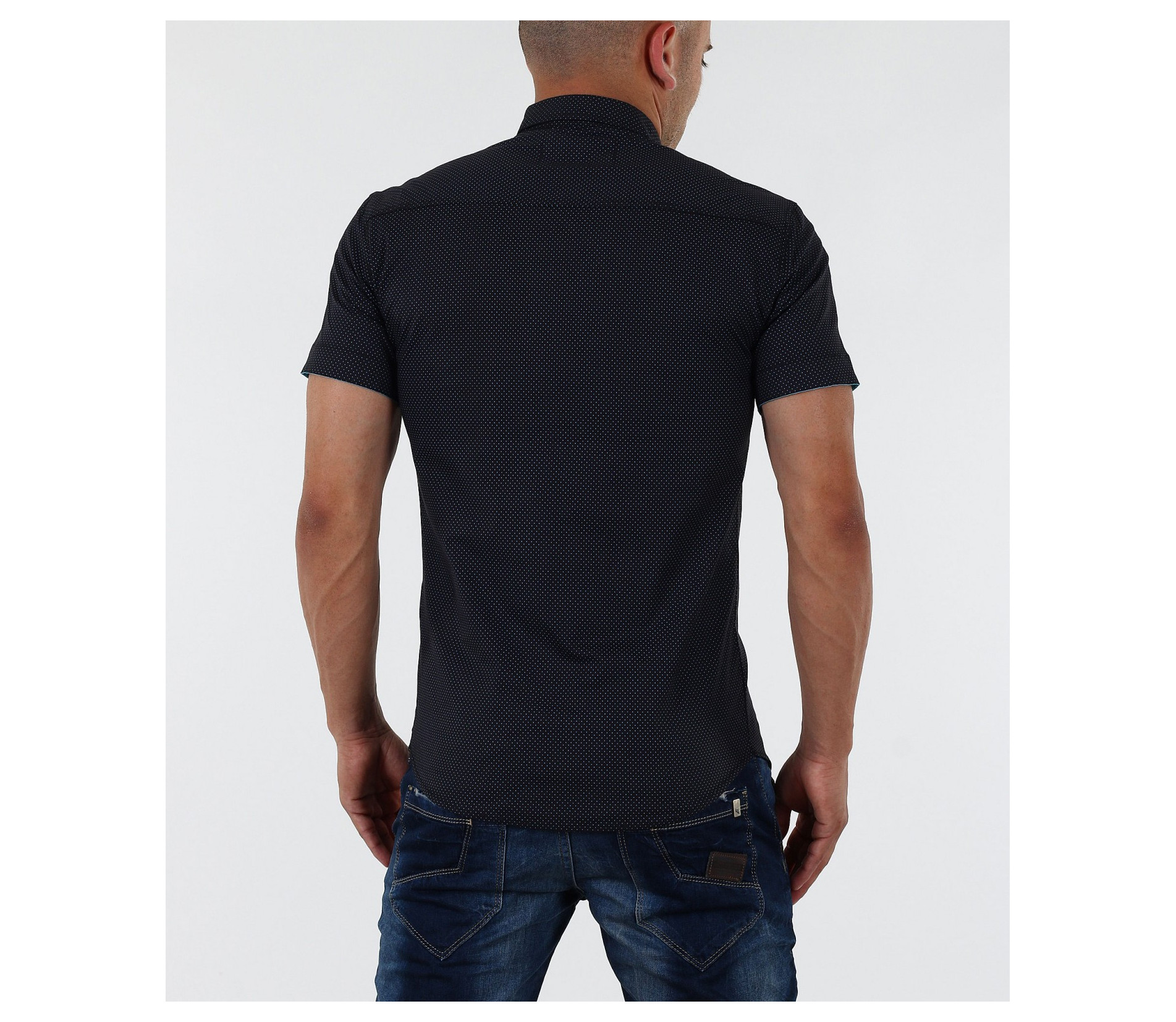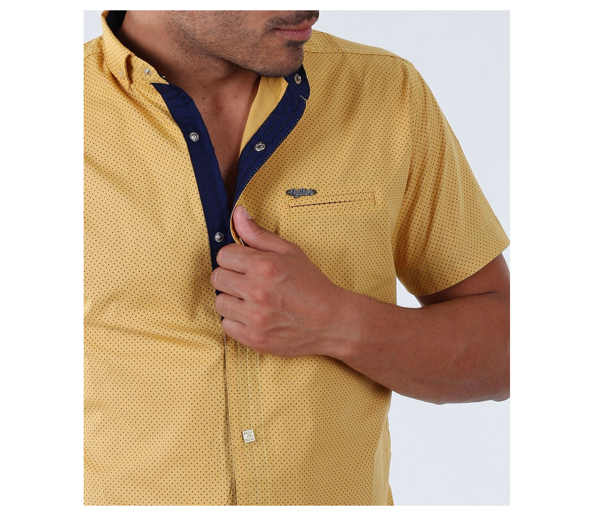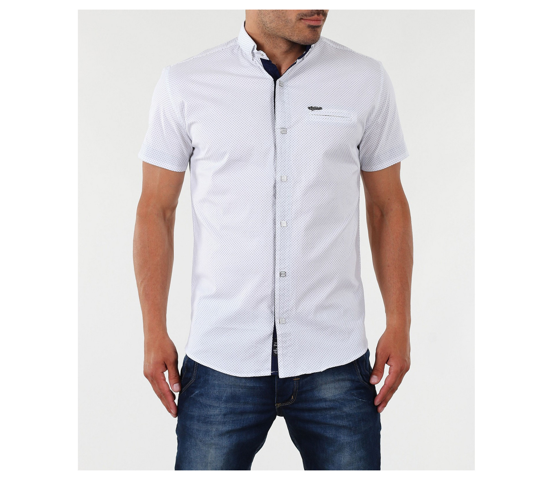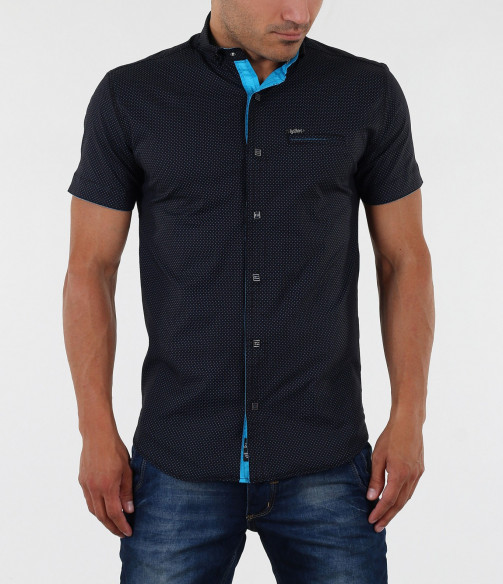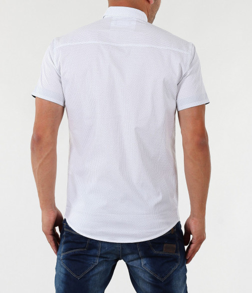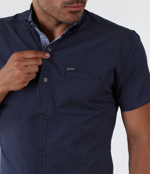 Описание на продукта: Свежа мъжка риза с къс ръкав. По цялата основа на ризата са поставени малки тъмни точки. В областта на гърдите има малък джоб, декориран с метално лого на марката. Закопчаването на този модел риза е с квадратни метални копчета като под тях е поставен тъмен кант. Яката на модела е ниска тип попска, с възможност за закопчаване. Този изключително свеж модел, в комбинация с дънки или спортен панталон, чифт кецове и стилен колан за завършек на визия, Ви осигурява перфектен вид, повдигнато самочувствие и 100% комфорт.