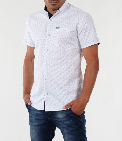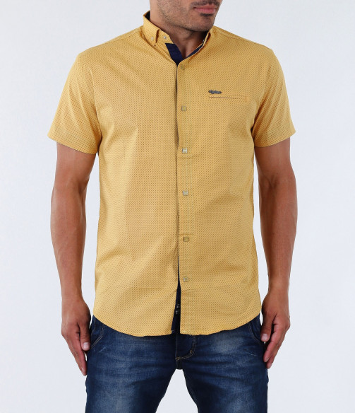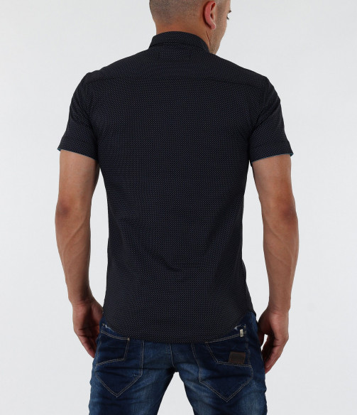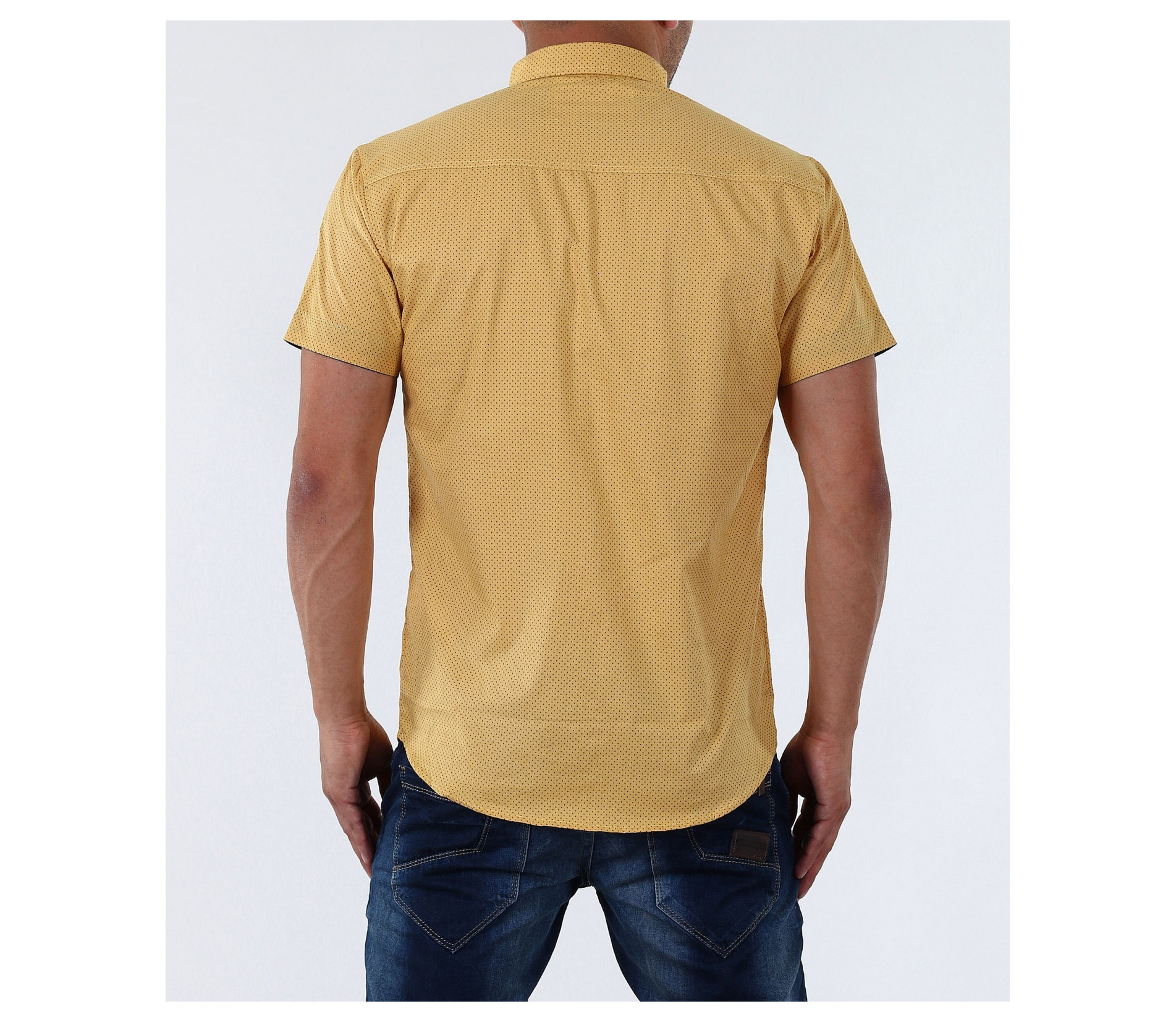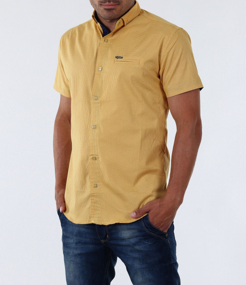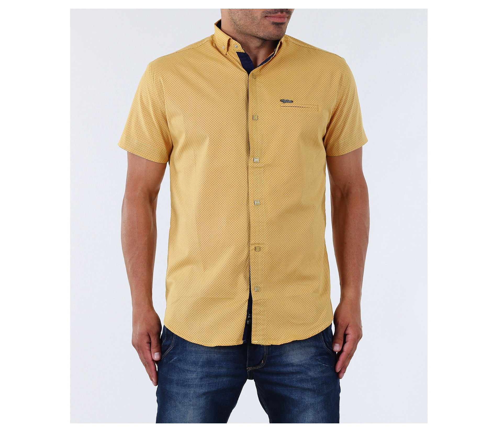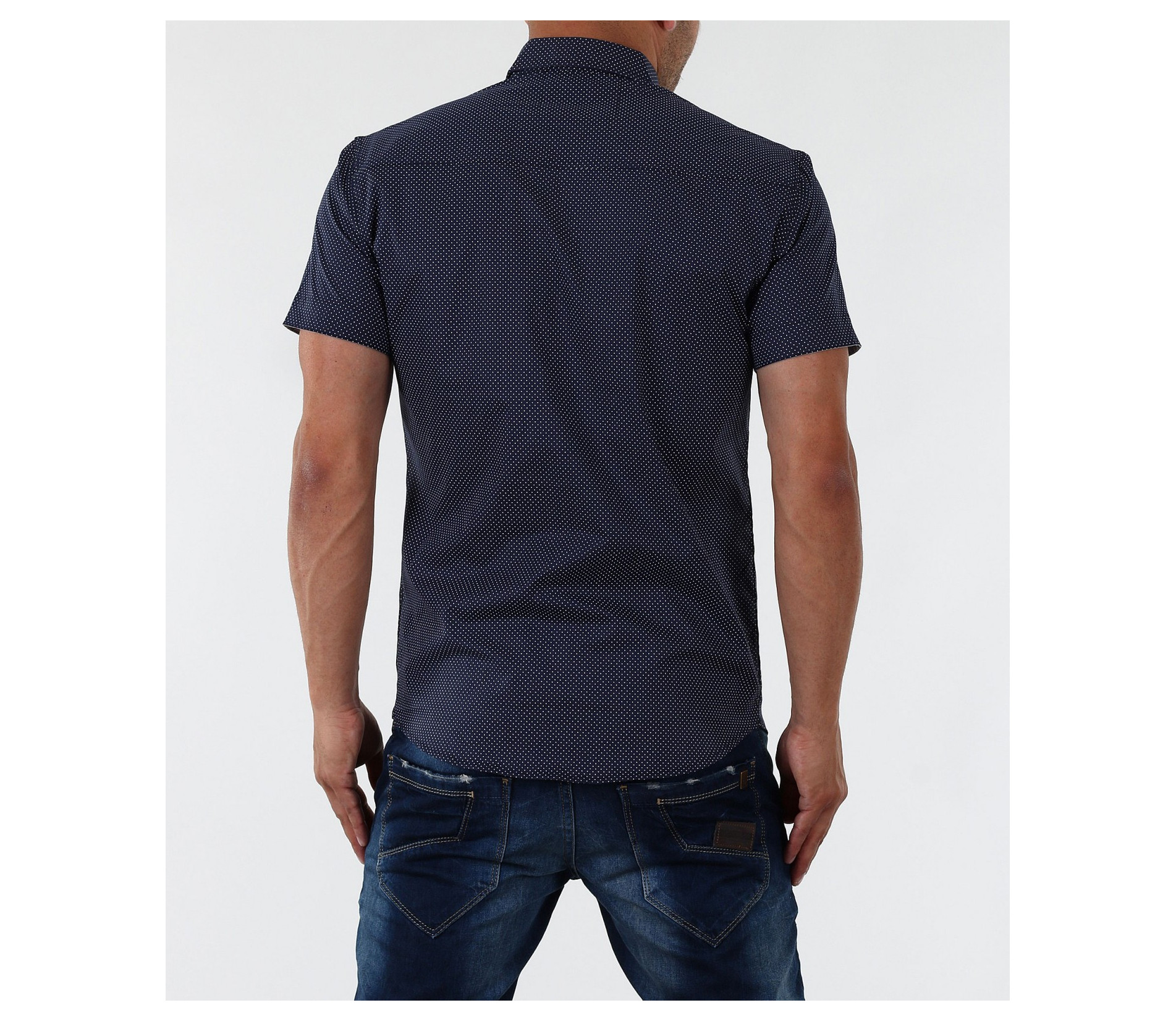 Описание на продукта: Свежа мъжка риза с къс ръкав. По цялата основа на ризата са поставени малки тъмни точки. В областта на гърдите има малък джоб, декориран с метално лого на марката. Закопчаването на този модел риза е с квадратни метални копчета като под тях е поставен тъмен кант. Яката на модела е ниска тип попска, с възможност за закопчаване. Този изключително свеж модел, в комбинация с дънки или спортен панталон, чифт кецове и стилен колан за завършек на визия, Ви осигурява перфектен вид, повдигнато самочувствие и 100% комфорт.