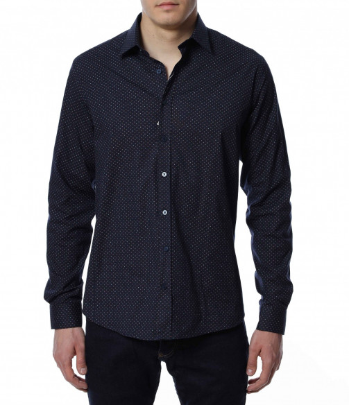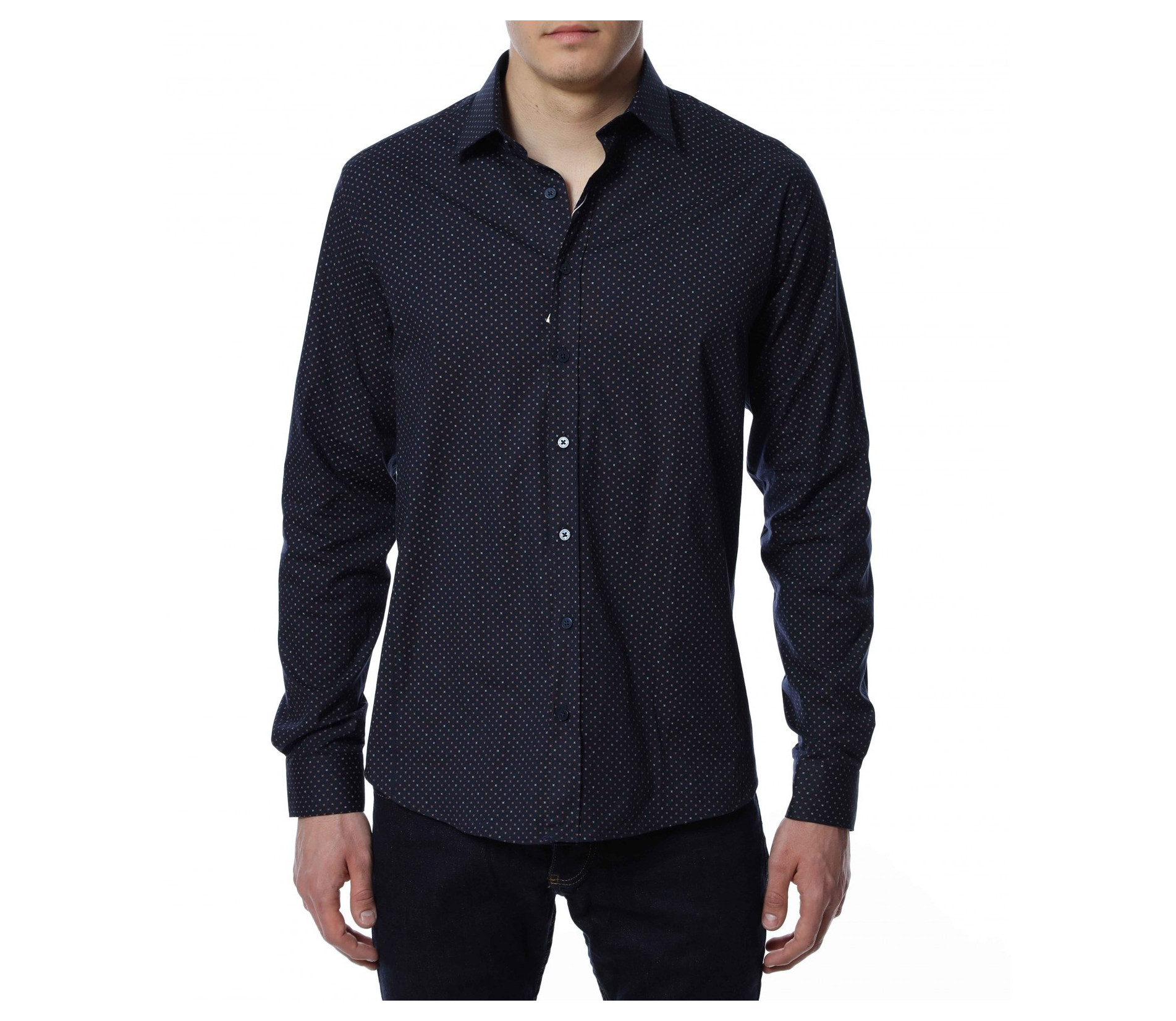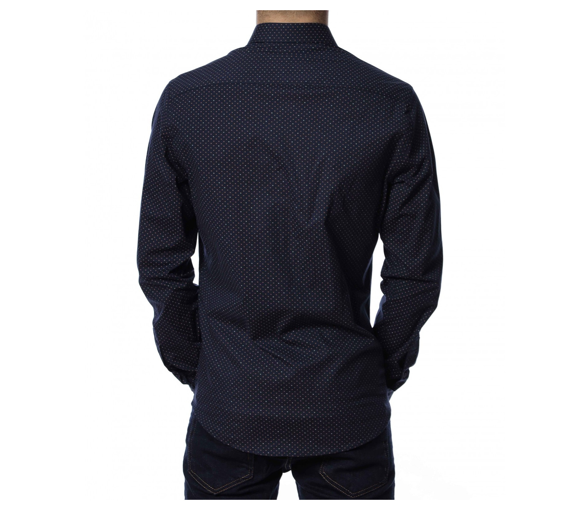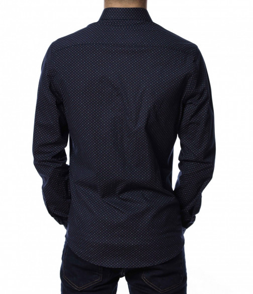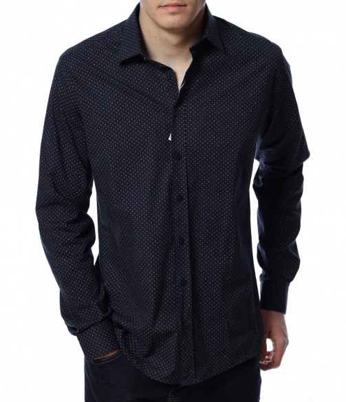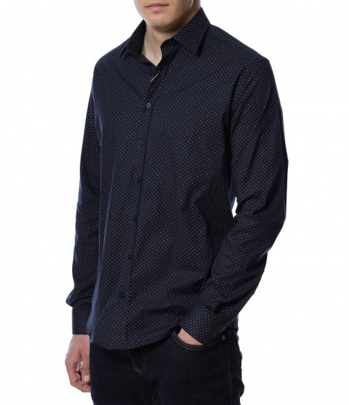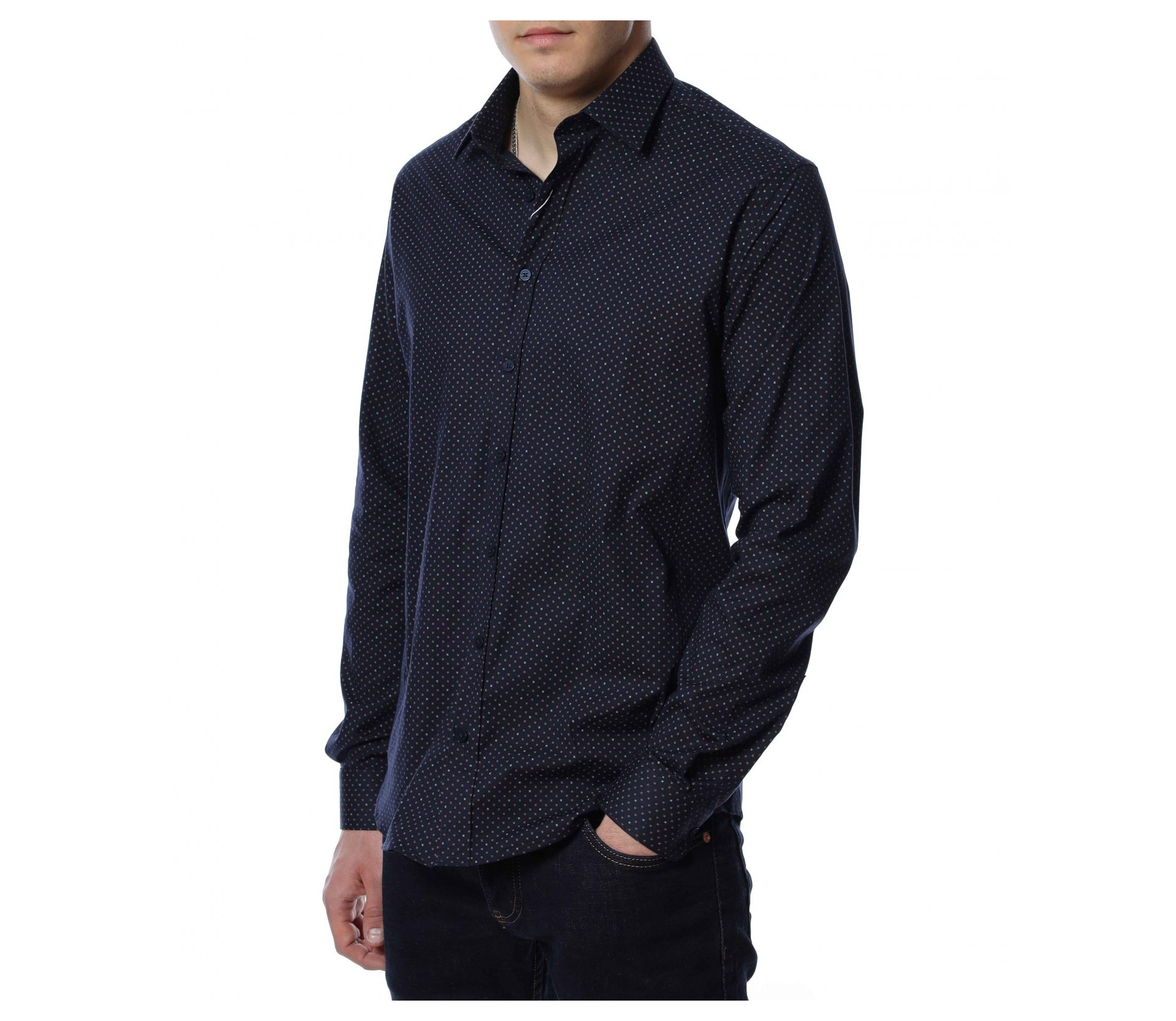 ОПИСАНИЕ НА ПРОДУКТА: Заредете се с емоция и настроение за настъпващите празници и събития и бъдите подготвени с перфектна визия. Представяме на вашето внимание качествена памучна риза в черен или тъмносин цвят, която е разчупена по много модерен и нестандартен начин. По цялата основа са разположени ситни фигури, които, внасят разчупен ефект. Самата кройка на модела мъжка риза е вталена, а дължината позволява както външна, така и вътрешна употреба. Яката е стилно прибрана около врата, а закопчаването е поверено на стандартни копчета, разположени по дължината на ризата. Смело комбинирай с панталон или изчистени дънки за една изискана и модерна визия. Чифт обувки и аксесоари ще индивидуализират твоя стайлинг, поставяйки финалния акцент на твоята празнична визия.