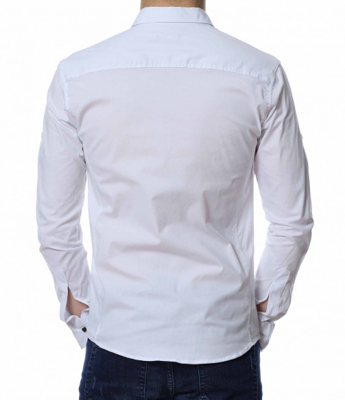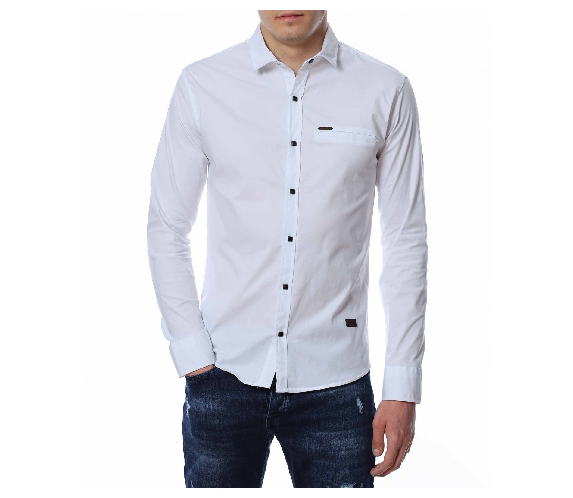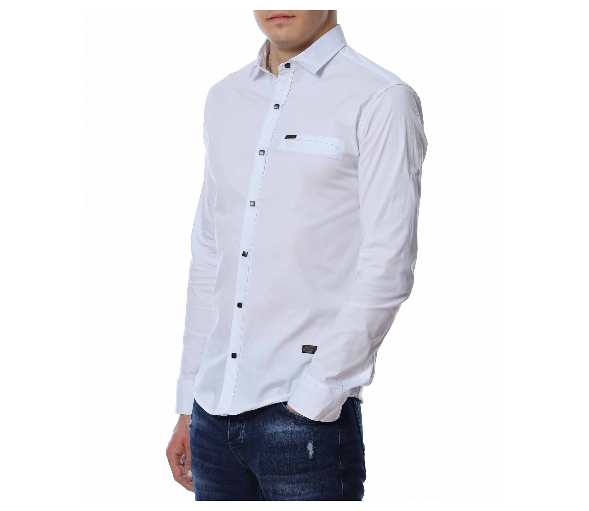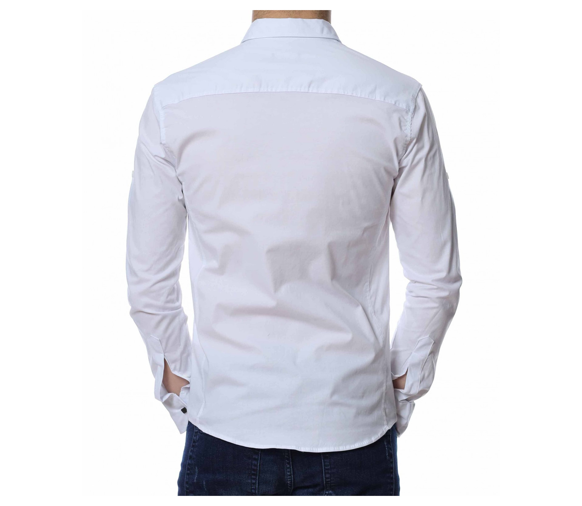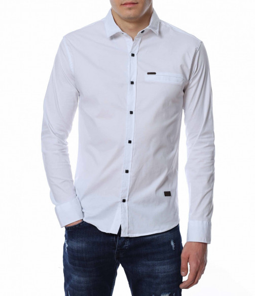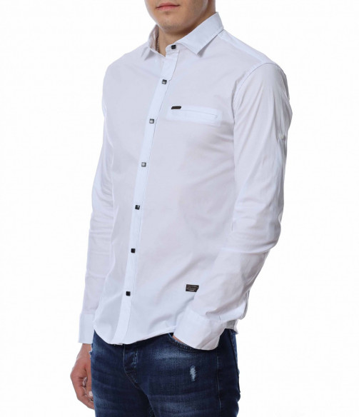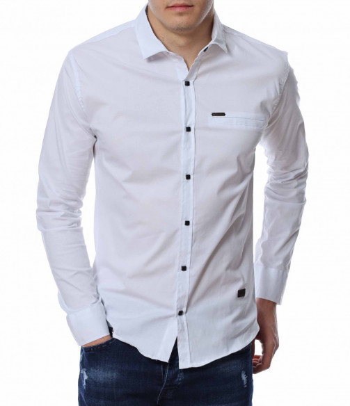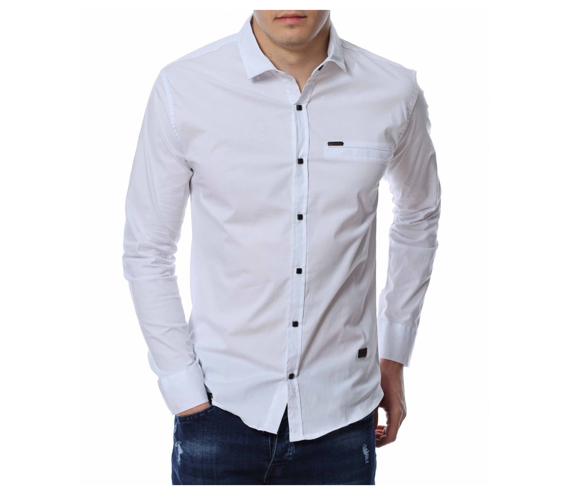 ОПИСАНИЕ НА ПРОДУКТА: Всеки мъжки гардероб има нужда от бяла стилна риза. Предлагаме Ви перфектно решение за Вашата, като не правим компромис с качество и визия. Кройката на мъжката риза е вталена, с дължина с възможност да се носи вътрешно и външно, за да задоволи всеки каприз. Яката на ризата е ниска тип „попска“, което придава едно fashion излъчване. Закопчаването се състои от черни квадрати капси, разположени вертикално по цялата дължина. В долната лява част, като завършващ елемент, е поставена малка ненатрапчива кожена плочка с логото на марката. За модерна и елегантна визия, заложете на този модел риза в два класически цвята, в комбинация с изчистени дънки или спортен панталон, заедно със стилни обувки и спортно-елегантно сако.