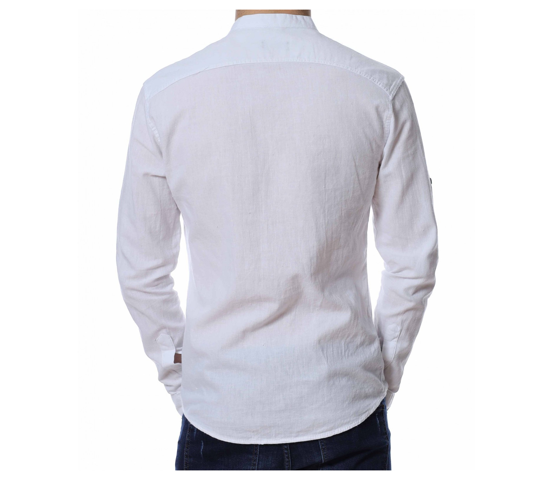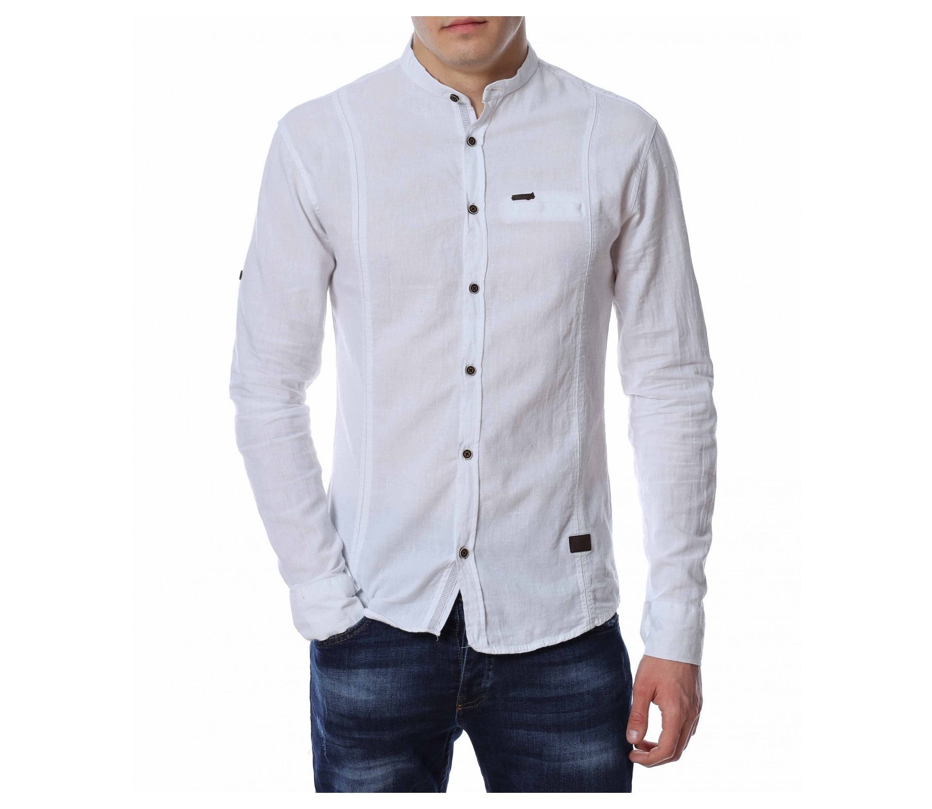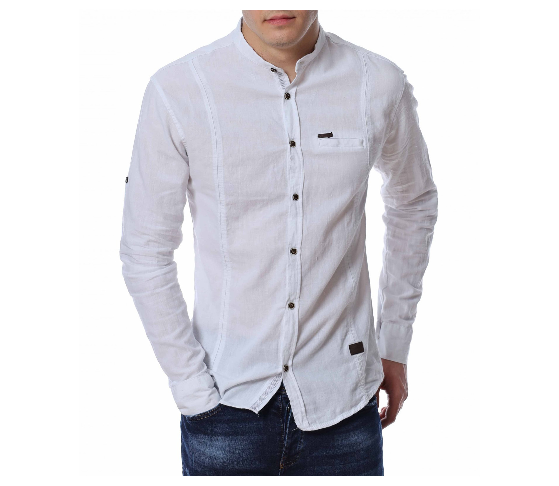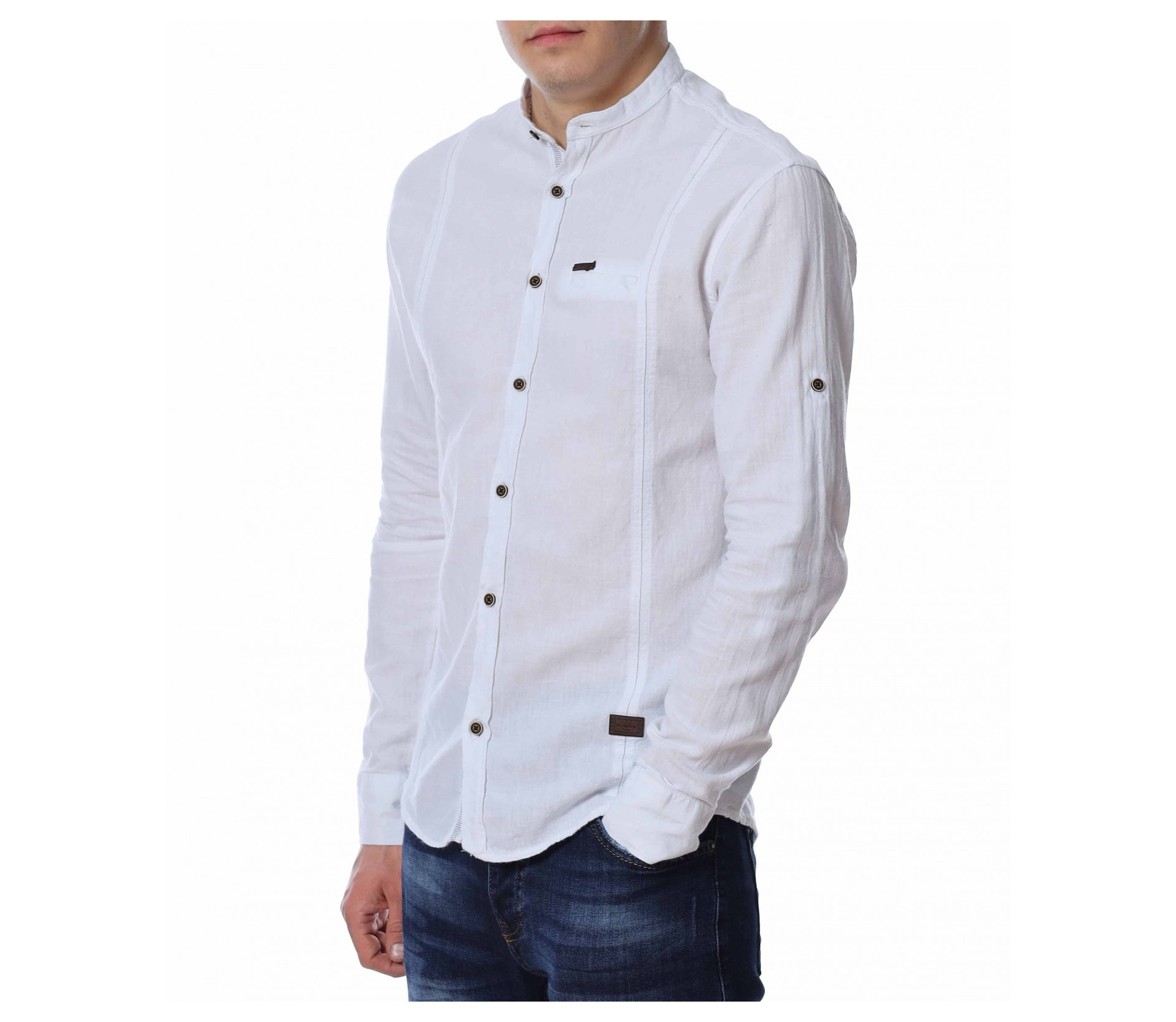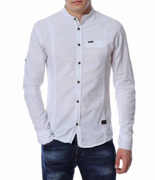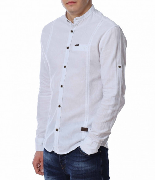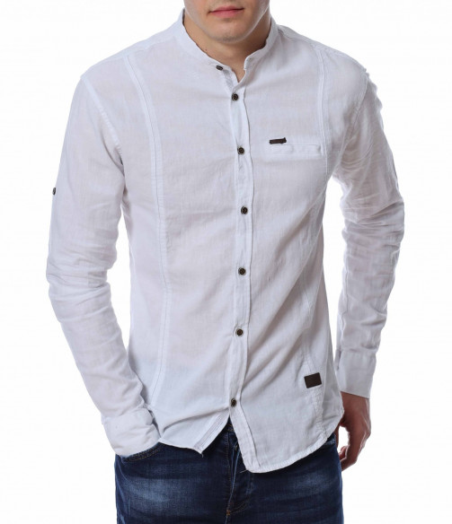 ОПИСАНИЕ НА ПРОДУКТА: Представяме Ви един страхотен модел мъжка риза в две цветови разновидности с уникален акцент. Кройката на моделa е вталена със стандартна дължина, подходяща за външно и вътрешно носене. В областта на гърдите е поставена малка кожена емблема с логото на марката. Яката на ризата е ниска, тип \"попска\". Като най-силен акцент са ръкавите , които са с възможност за навиване, което я прави изключително практична. Перфектно изработен модел в детайли, от 100% висококачествен памук, който на визия имитира лен. Този модел риза Ви дава  зелена светлина, при съчетаването и с дънки, панталони, обувки и аксесоари, за постигане на перфектен сет с cool-излъчване.