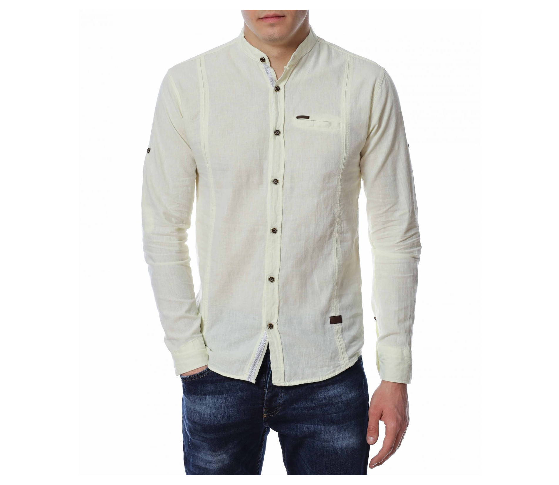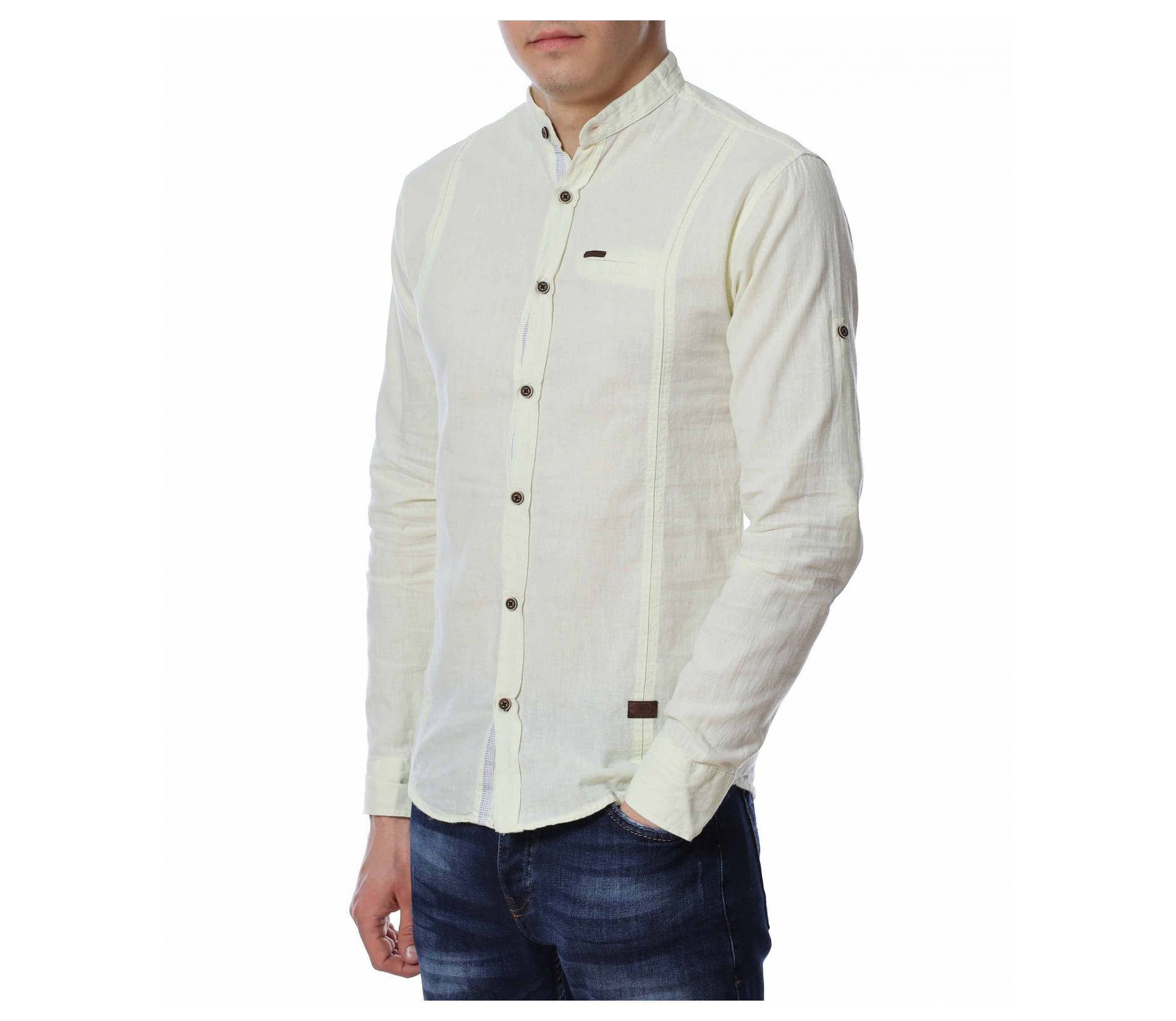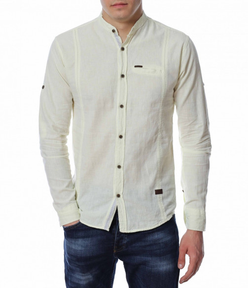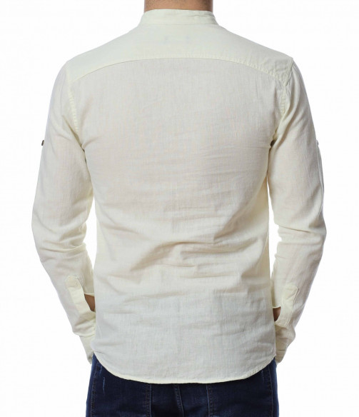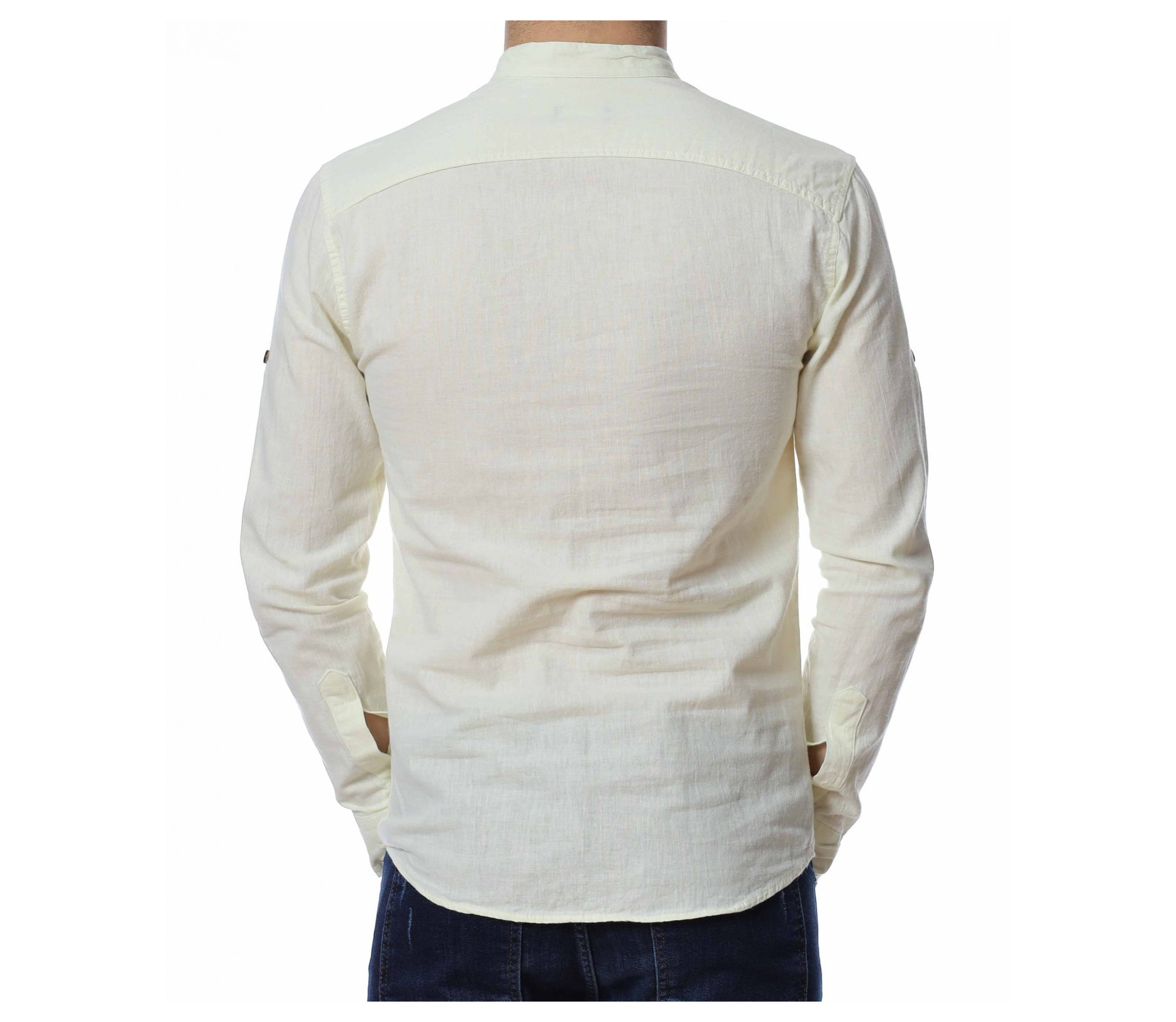 ОПИСАНИЕ НА ПРОДУКТА: Представяме Ви един страхотен модел мъжка риза в две цветови разновидности с уникален акцент. Кройката на моделa е вталена със стандартна дължина, подходяща за външно и вътрешно носене. В областта на гърдите е поставена малка кожена емблема с логото на марката. Яката на ризата е ниска, тип \"попска\". Като най-силен акцент са ръкавите , които са с възможност за навиване, което я прави изключително практична. Перфектно изработен модел в детайли, от 100% висококачествен памук, който на визия имитира лен. Този модел риза Ви дава  зелена светлина, при съчетаването и с дънки, панталони, обувки и аксесоари, за постигане на перфектен сет с cool-излъчване.