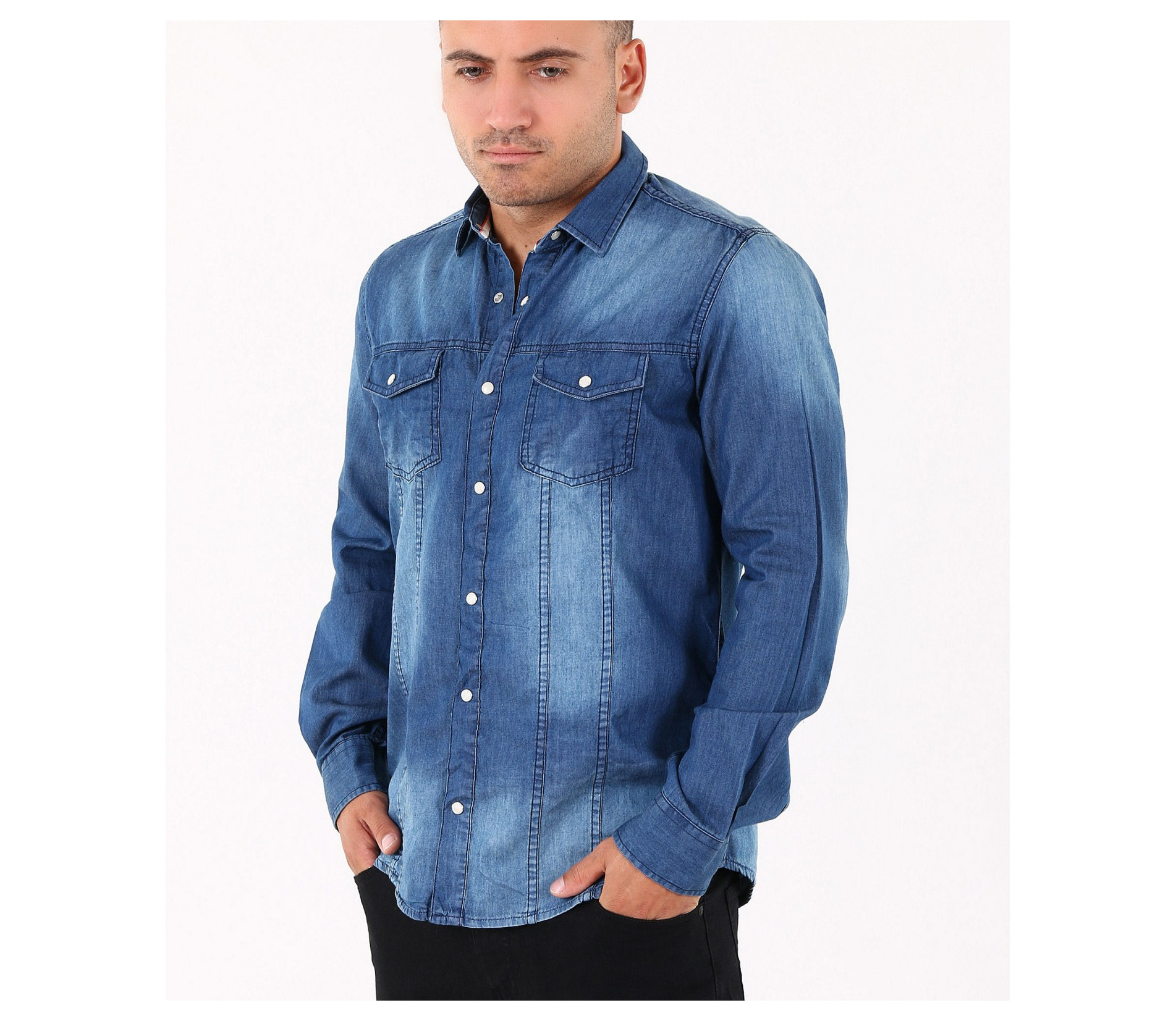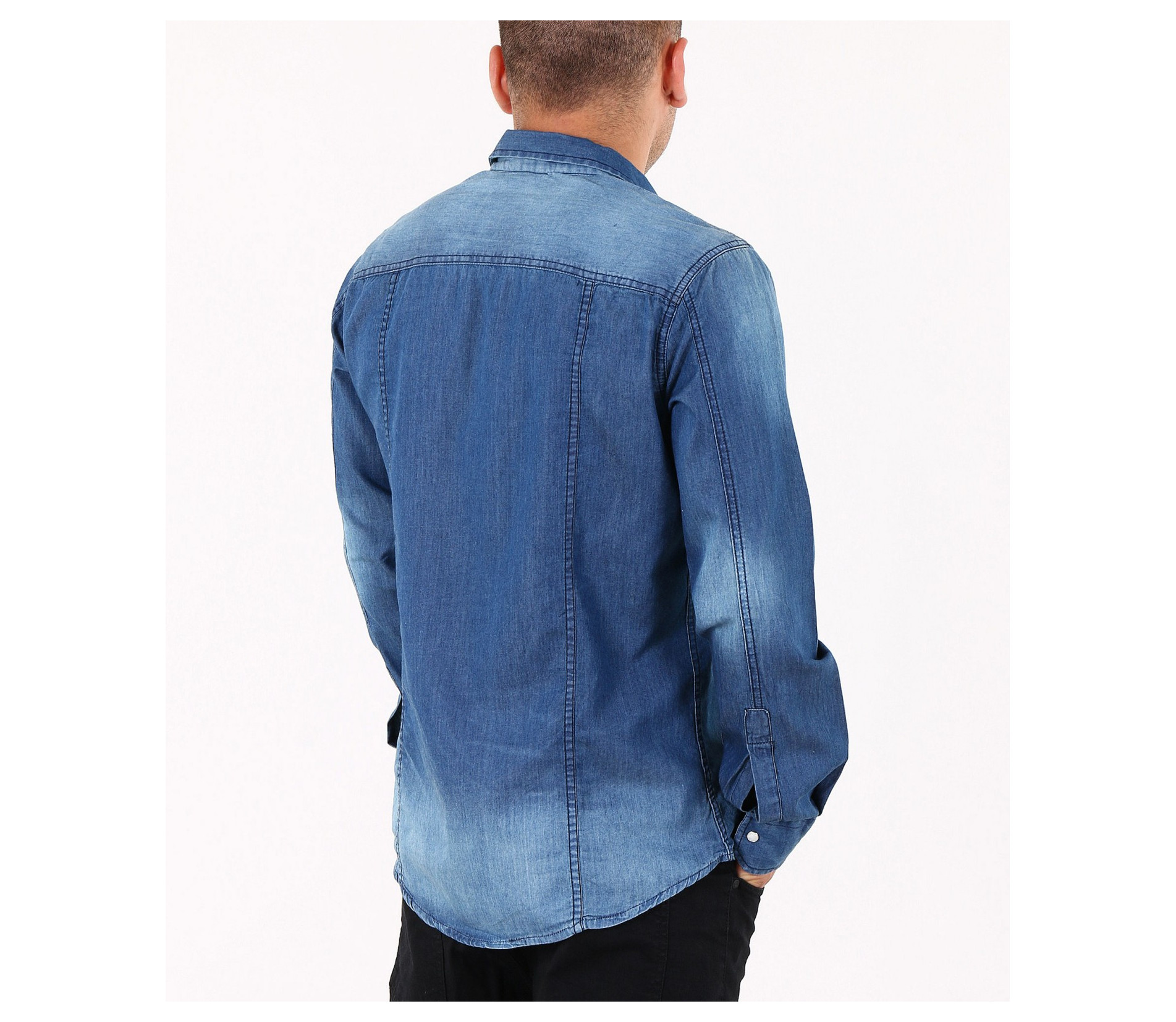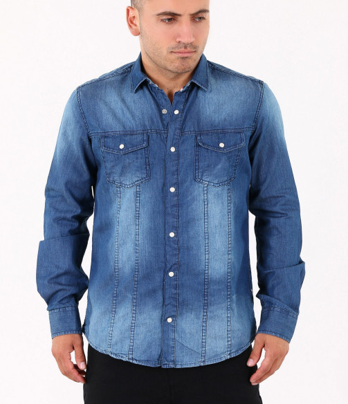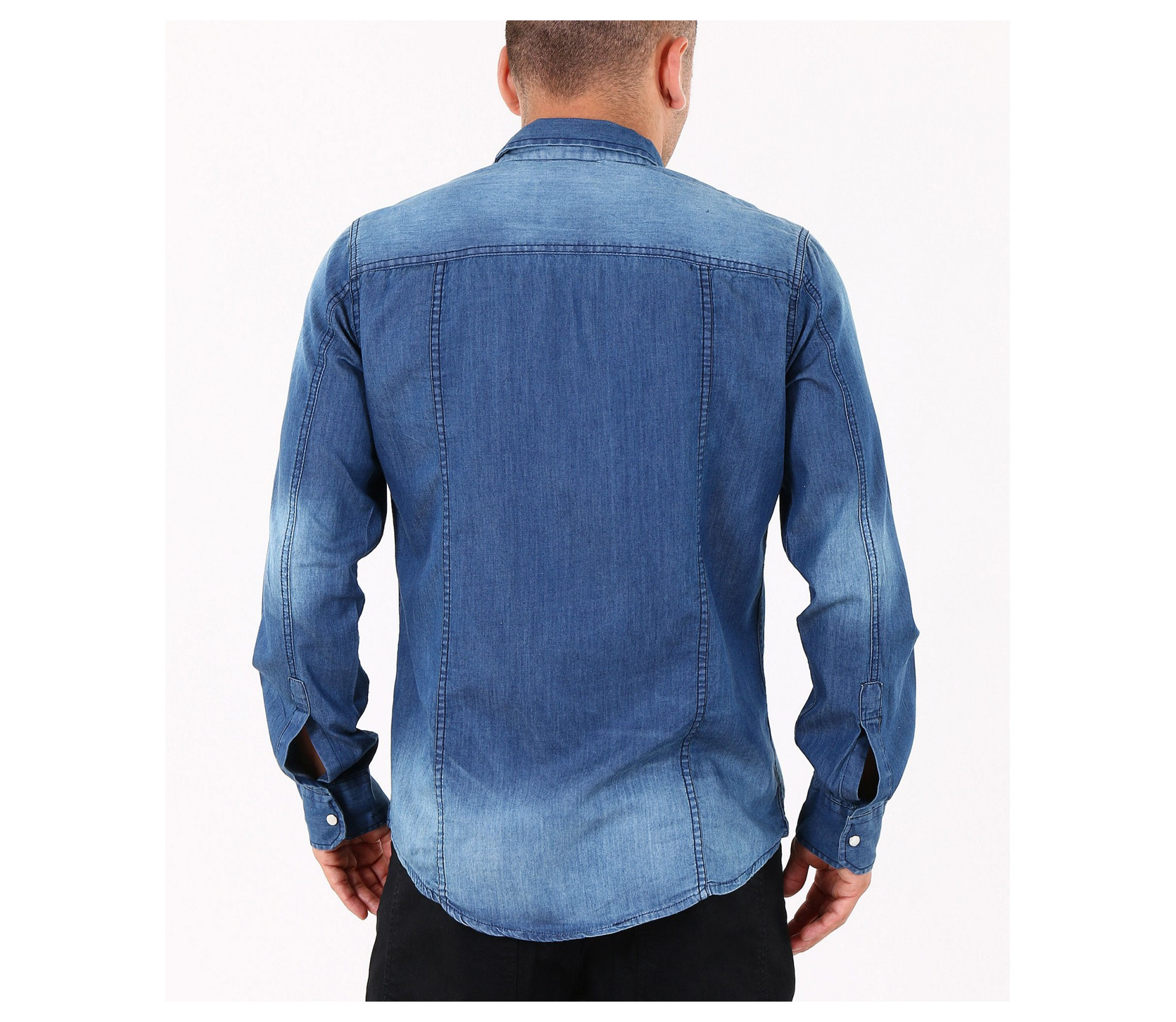 Описание на продукта: Мъжка актуална дънкова риза с дълъг ръкав. Интересното при този модел риза е смесването на иначе изчистения син цвят с леко изсветлели отенъци, създавайки така наречения избеял ефект. В предната част в областта на гърдите са поставени две джобчета с капаци, закопчаващи се с копче. Основното закопчаване е с капси. По цялата дължина на ризата са поставени няколко вертикални шева, които допълнително разчупват модела и му придават интересно излъчване. Кройката е леко свободна. Яката е семпла, прибрана около врата. Комбинирай с деним и обувки по твой вкус и създай своя собствен сет.