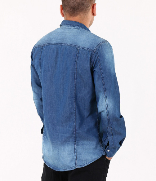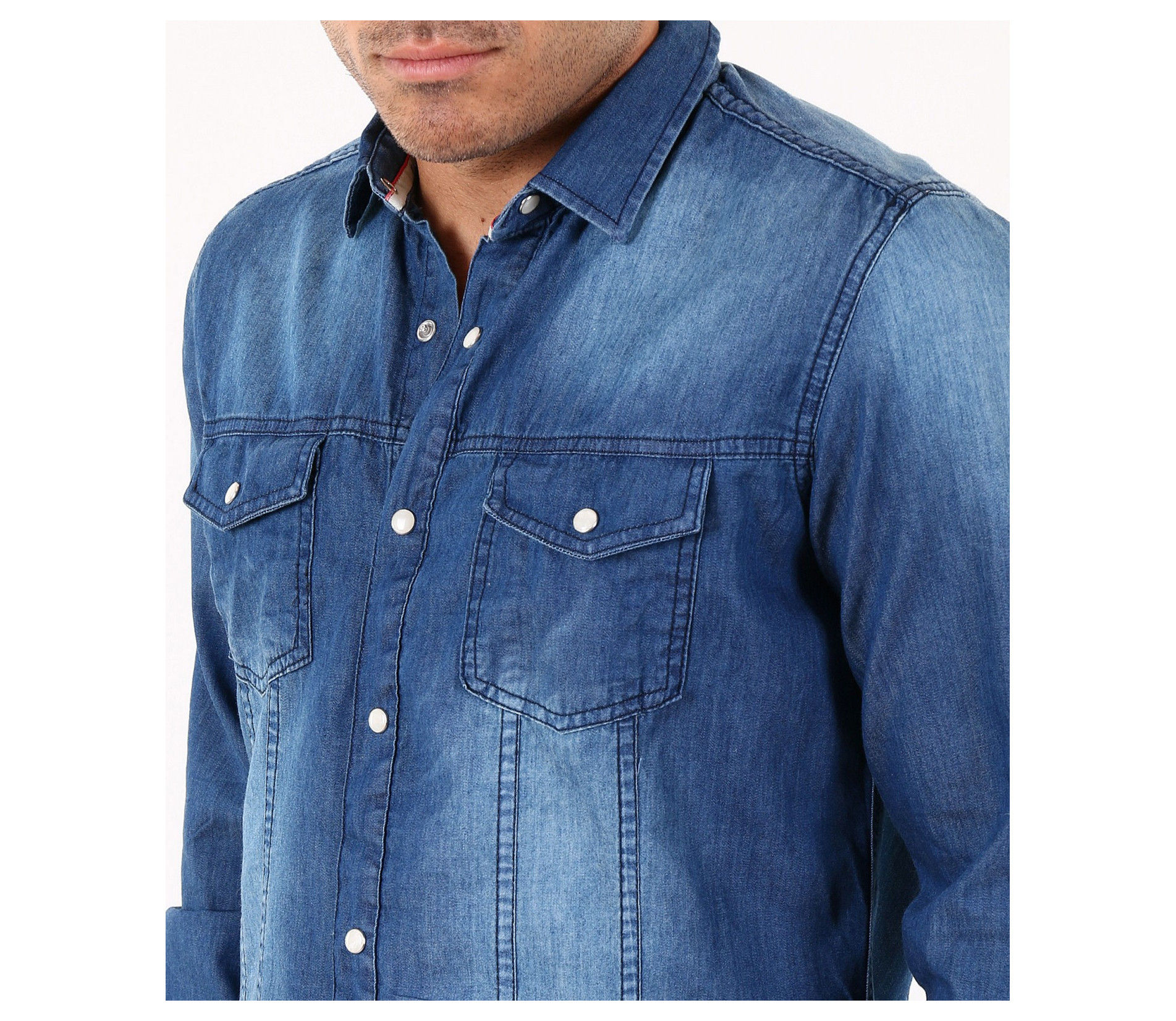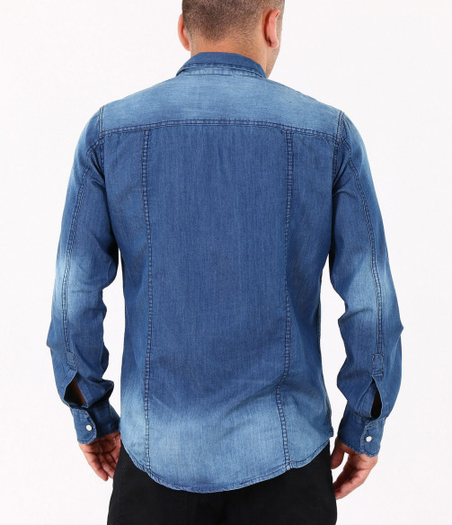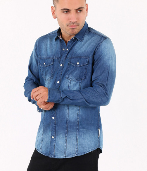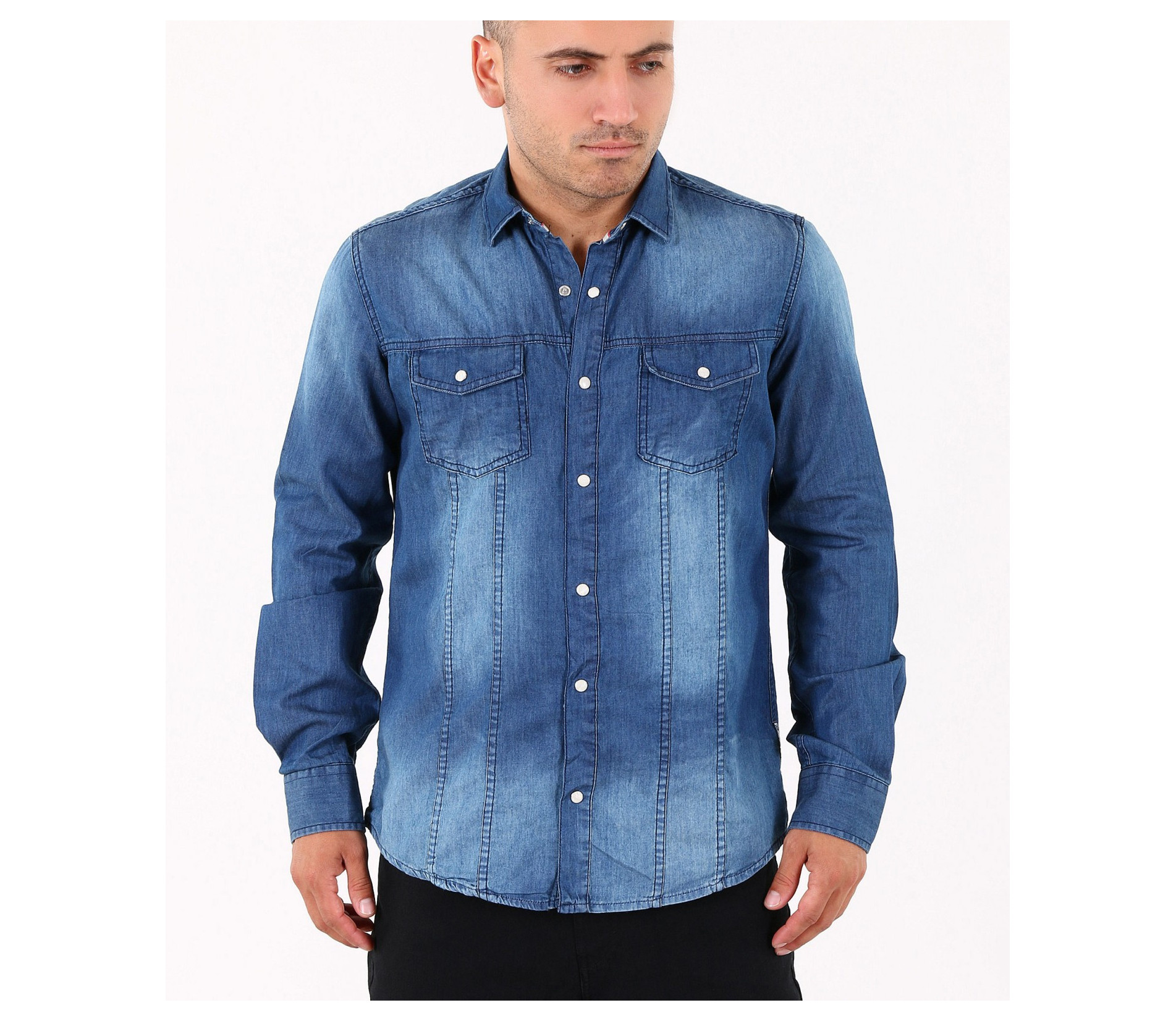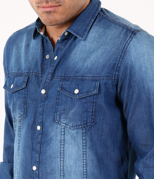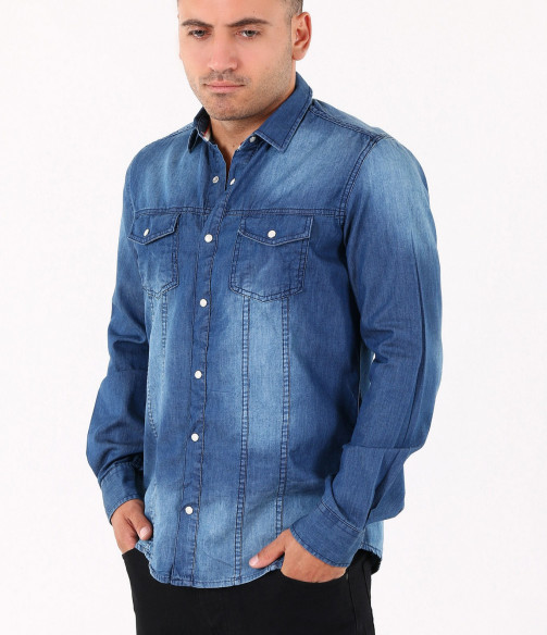 Описание на продукта: Мъжка актуална дънкова риза с дълъг ръкав. Интересното при този модел риза е смесването на иначе изчистения син цвят с леко изсветлели отенъци, създавайки така наречения избеял ефект. В предната част в областта на гърдите са поставени две джобчета с капаци, закопчаващи се с копче. Основното закопчаване е с капси. По цялата дължина на ризата са поставени няколко вертикални шева, които допълнително разчупват модела и му придават интересно излъчване. Кройката е леко свободна. Яката е семпла, прибрана около врата. Комбинирай с деним и обувки по твой вкус и създай своя собствен сет.