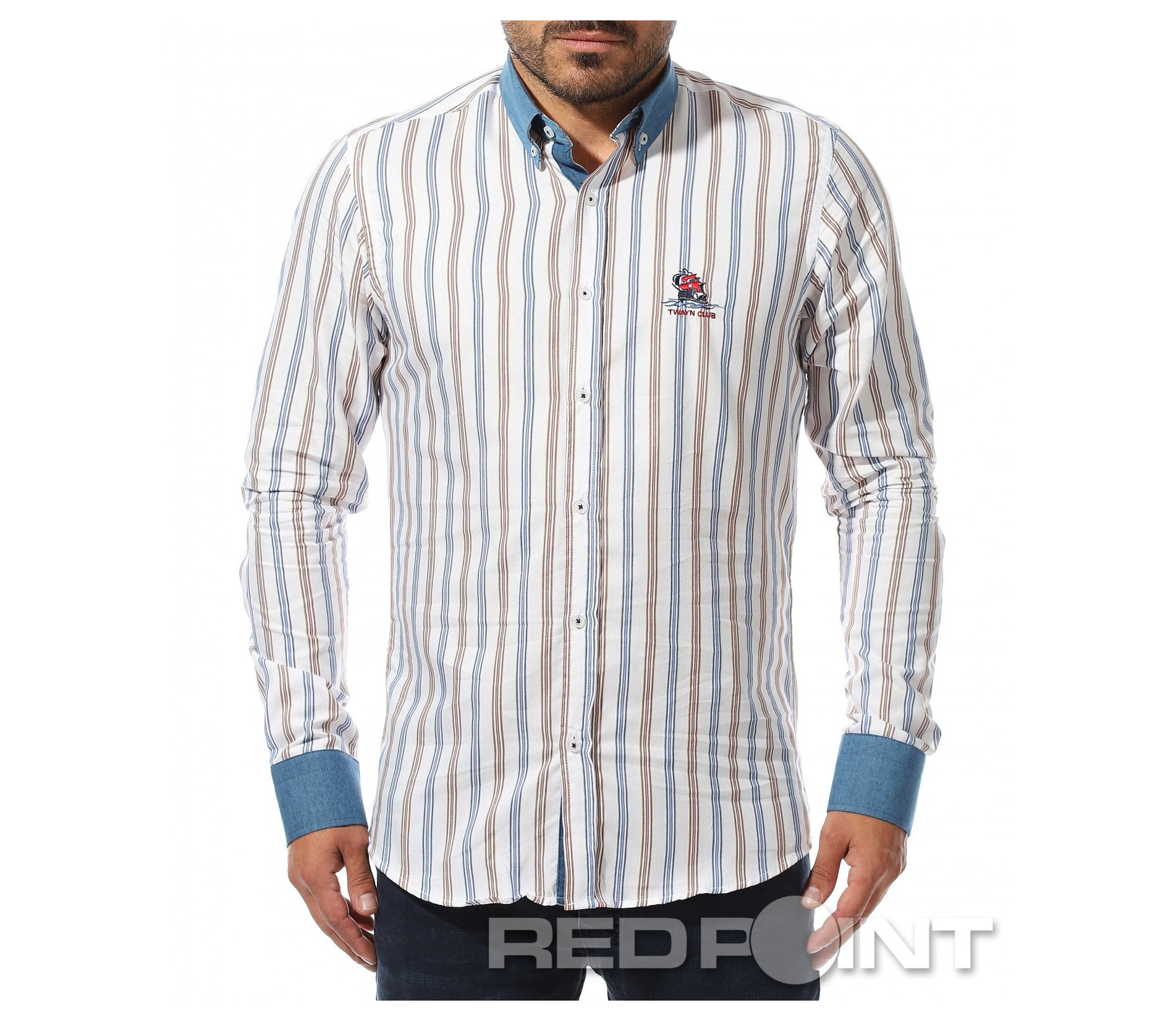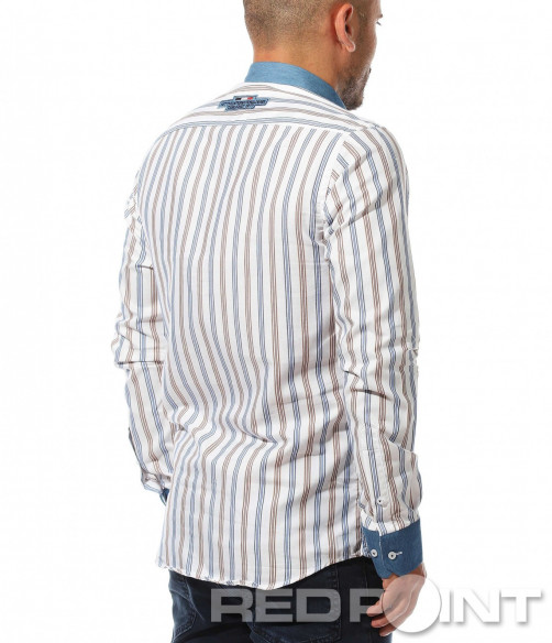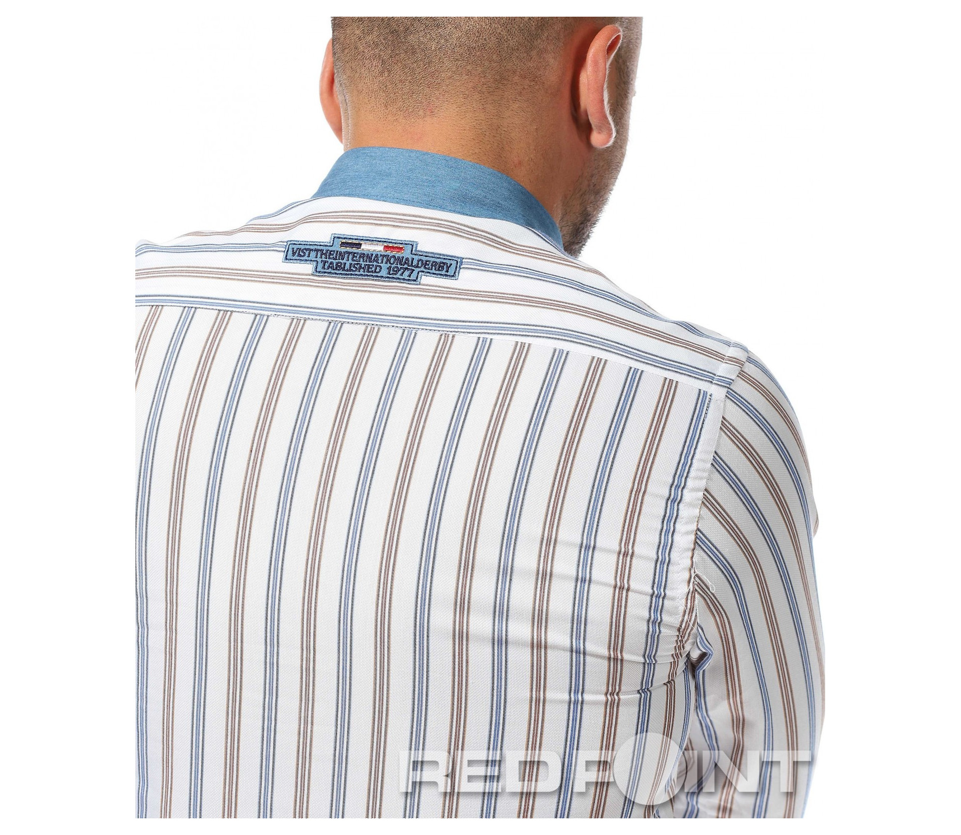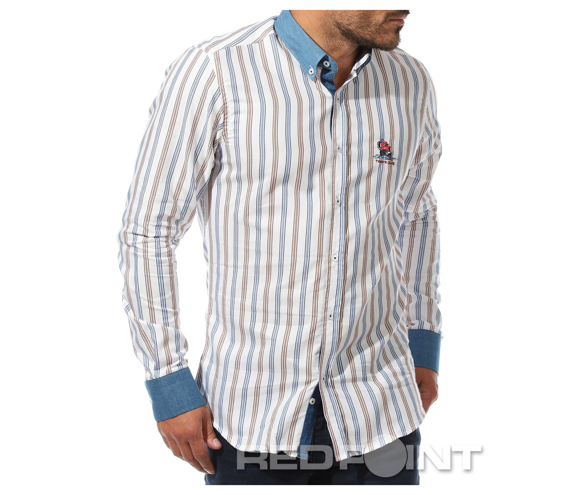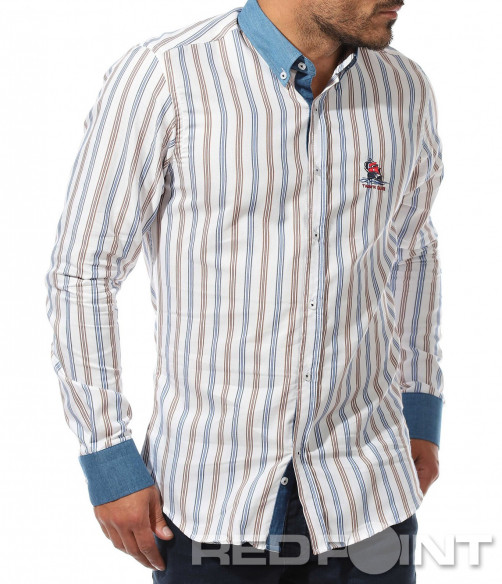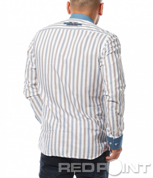 Описание на продукта: Традициония дизайн на мъжката риза е вече мит, а още по-голям мит е че ризата е подходяща само за официален аутфит. Представяме Ви един модел, който преобръща представи с нетипичния и щур десен, в който е облечен. Тази риза е изградена в с помощта на пъстро вертикално райе, поверено на едри ленти, поставени върху светла основа. За контраст са изпослвани ръкавите и яката, които са изработени от син деним плат, който перфектно приляг към цялостната визия на дрехата. За черешка на тортата са подбрани два орнамента под формата на бродерия, единият разположен като лого при гърдите, а другия на гърба впод формата на ръкописен надпис. Всички тези части съединени в едно играждат най-вдъхновяващия модел мъжка риза.