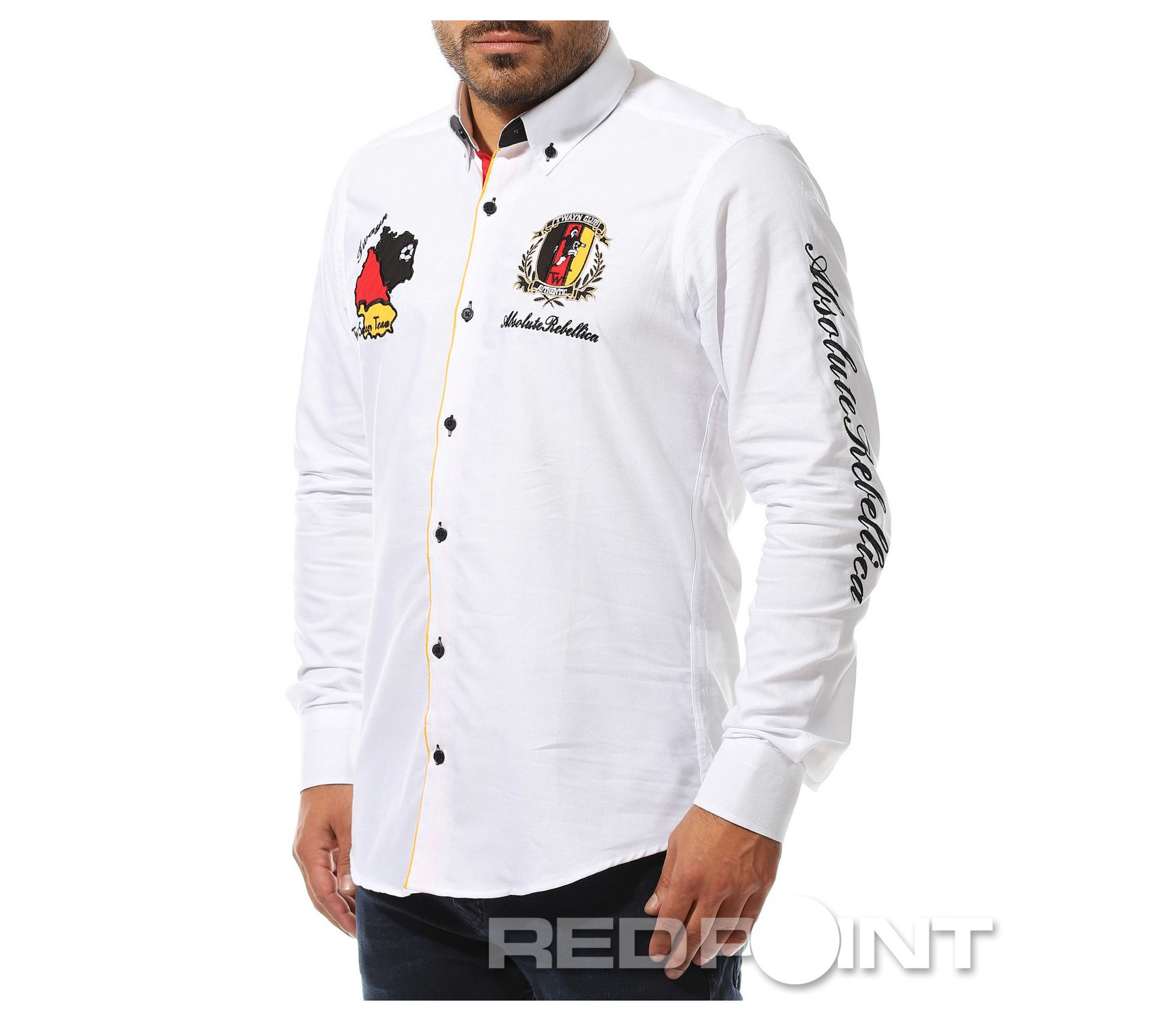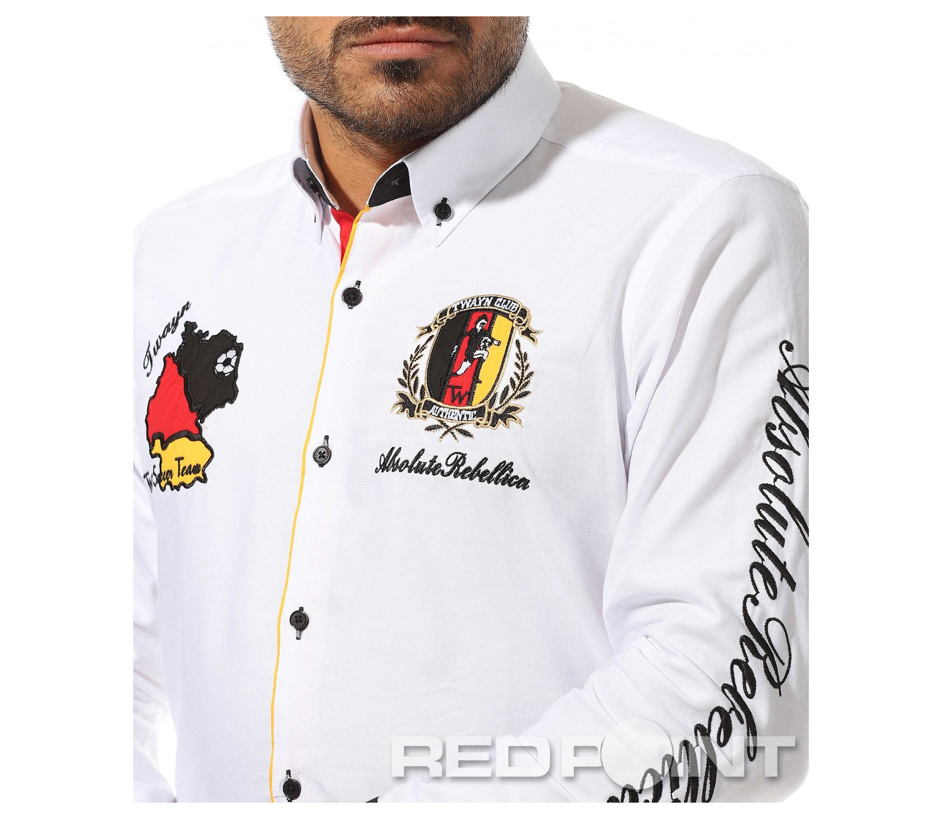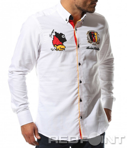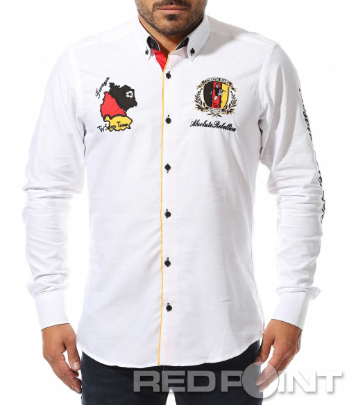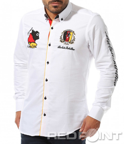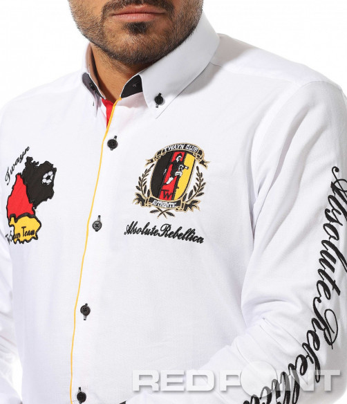 Описание на продукта: Представяме Ви един модел мъжка риза, поверена на бялата основа, която успява да създаде напълно нов облик на ежедневния и клубен имидж. Върху иначе класическата основа са поставени няколко много едри и пъстри декоративни елемента, които създеават напълно ново виждане за ризата като официална дреха. При гърдите са поставени две големи продерии, в които се преплитат черно жълти нюанси. В продължението на закопчаването, под формата на кант, също откриваме акцентът. Последния мотив е поставени при ръкава, като е подбран ръкописен черен надпис, също изграден под формата на бродерия. Задължителния елемент от всяка риза е яката, тъй като именно тя определеня и подчертава стила на дрехата. Тук е подбрана в пълен унисон с цялостната визия, а именно в ниска форма тип попска яка.