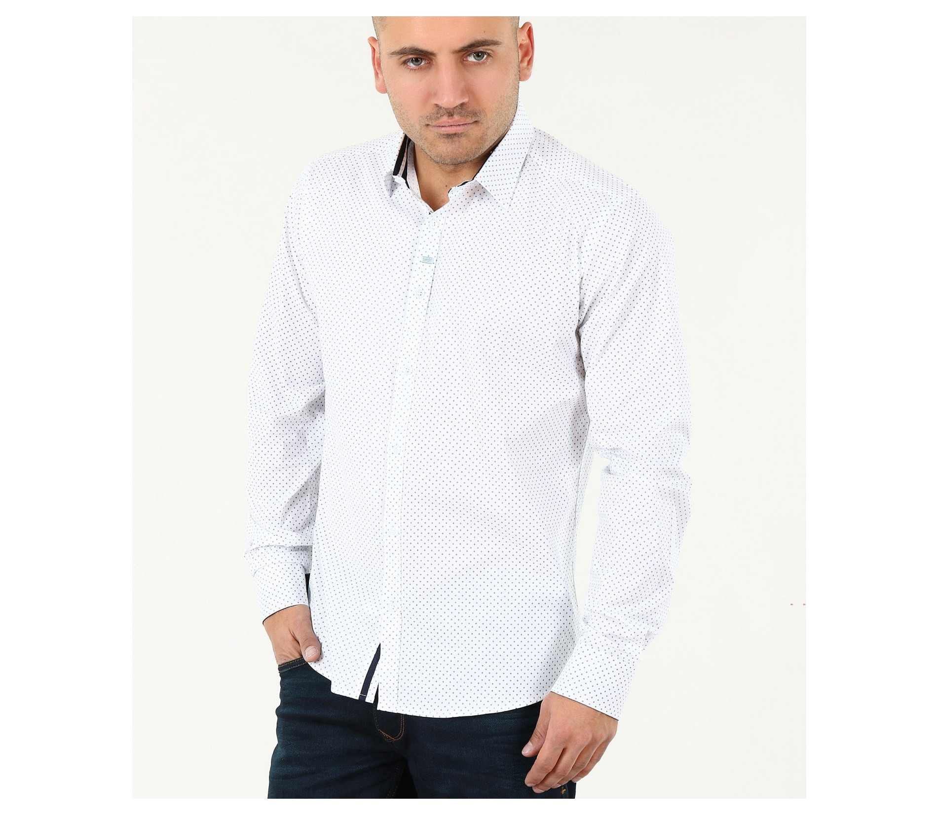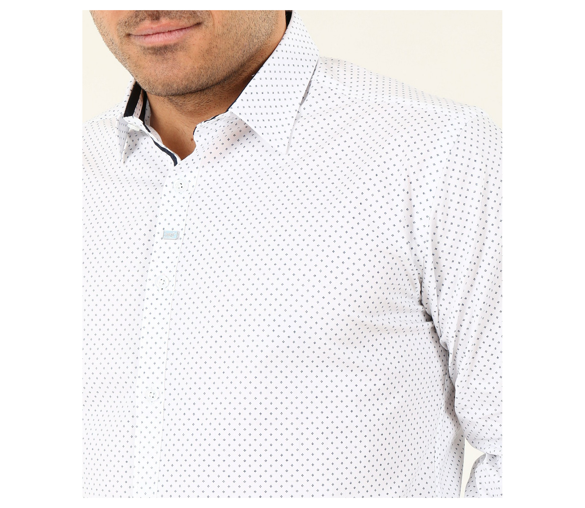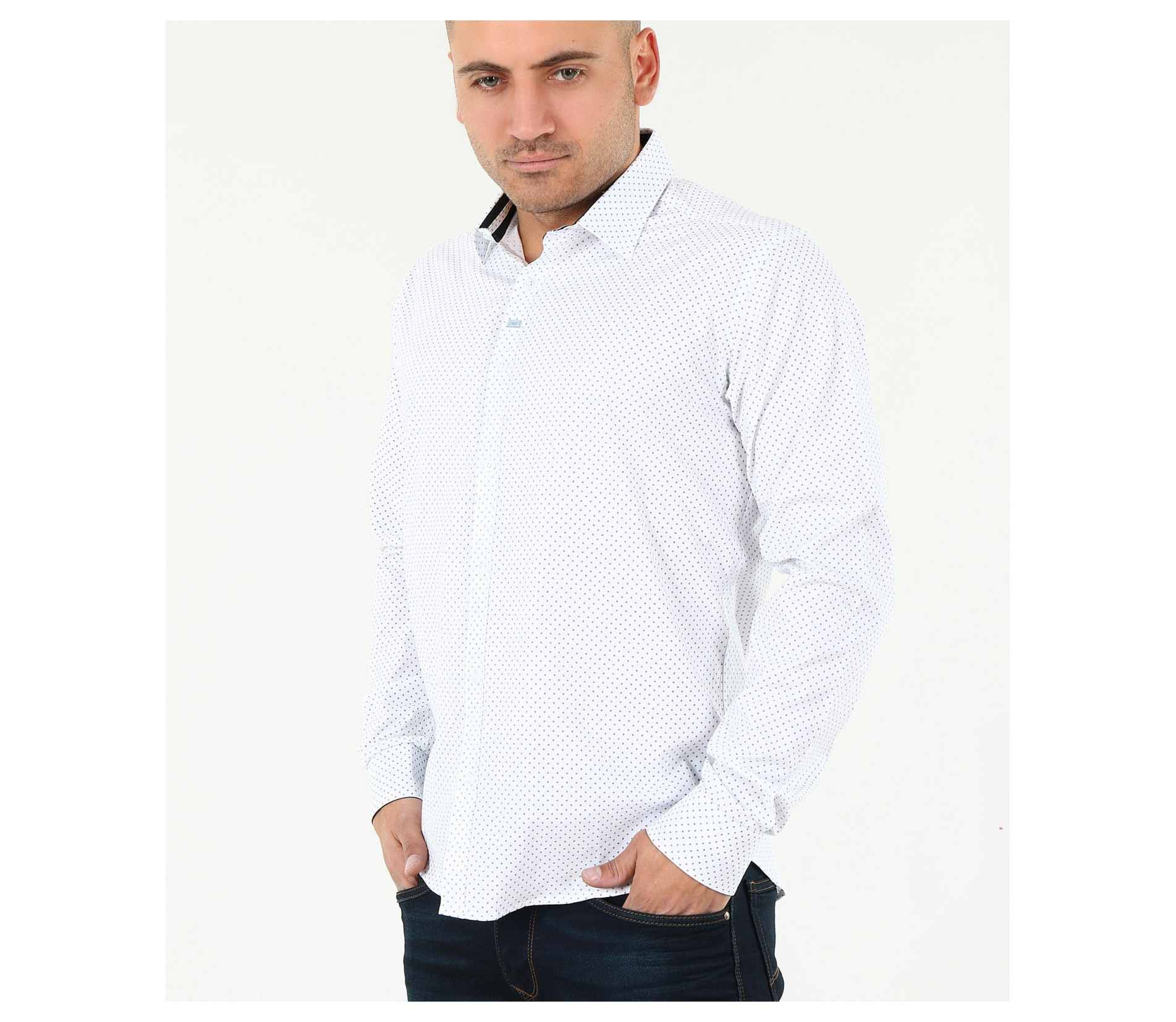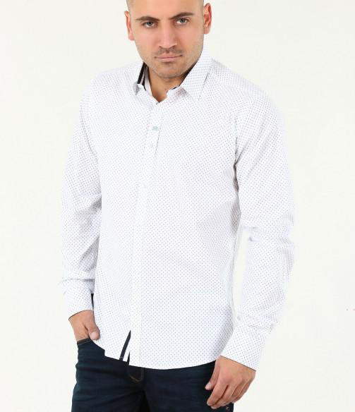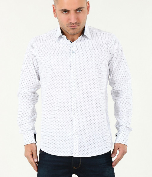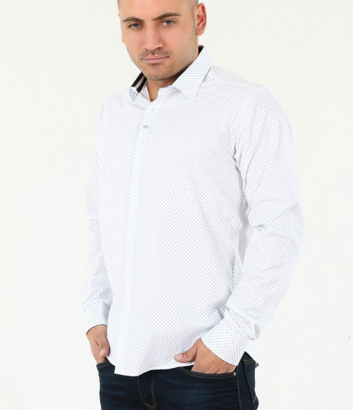 Описание на продукта: Супер стилна мъжка спортно-елегантна риза, която предлагаме в два свежи цвята: бял и син. Върху изситеният десен на ризата са поставени дребни орнаменти превръщащи ризата в една свежа стилна и любима дреха. Основният акцент на ризата се пада цветния кант, поставен под копчетата за закопчаване. Кройката на този модел риза е вталена със стандартна дължина, позволяваща Ви да я носите както външно така и вътрешно, като акцентирате върху стилен колан. Смело я комбинирайте с модерен деним, чифт елегантни обувки и стилно сако и получавайте всеки път, различна и модерна визия.