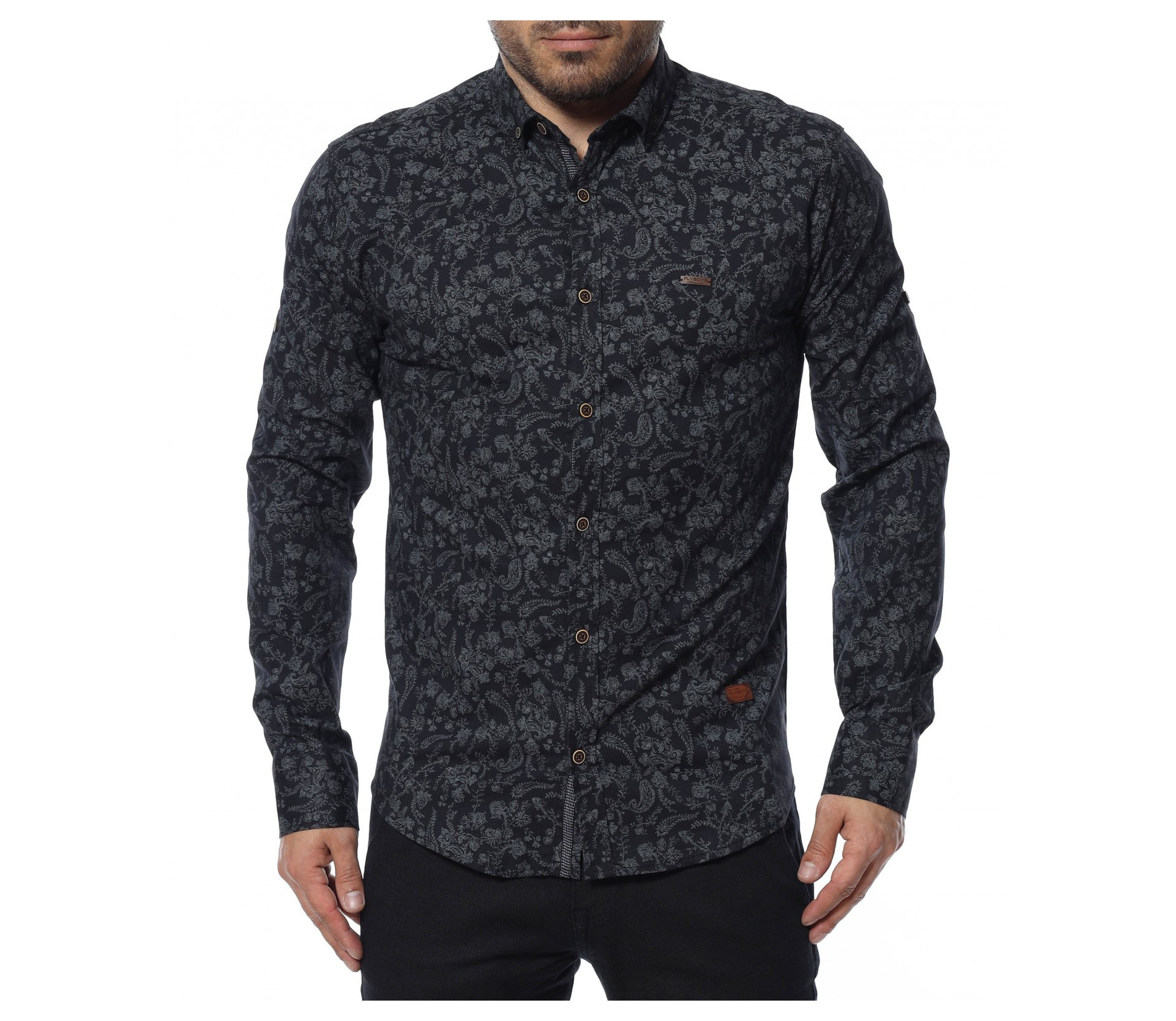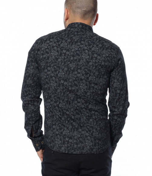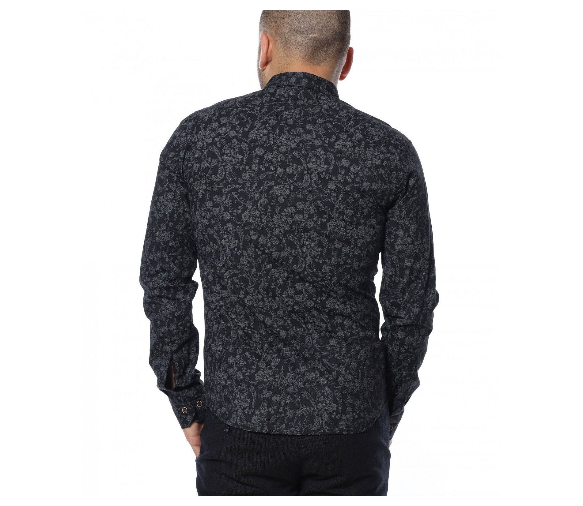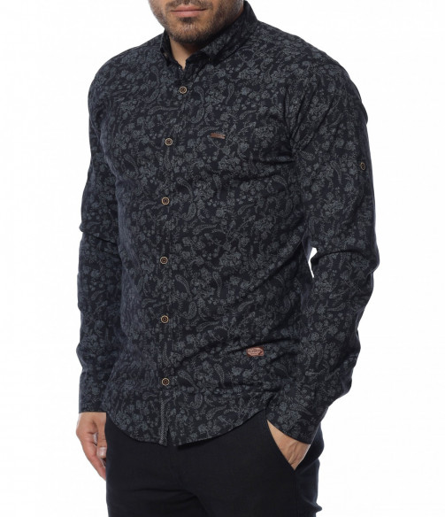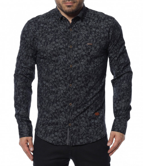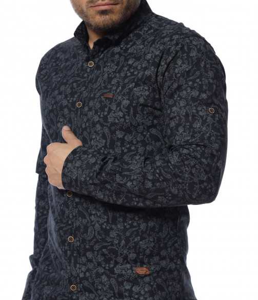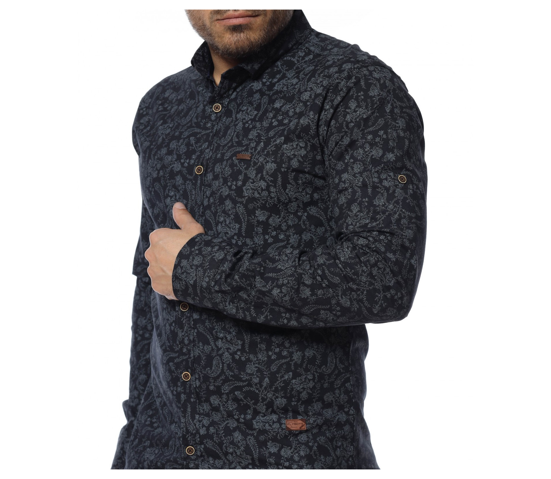 Попълнете гардеробът си с официална риза с флорален принт и дълъг ръкав. Кройката е следваща линиите на тялото, а комбинацията от памук и еластант, прави моделът изключително комфортен и удобен за носене. Закопчаването се състои в копчета, които са позиционирани и в горната част на ръкава, за прилежно подгъване при нужда. Основата е едноцветна в тъмната гама. Създайте вашият стилен имидж като комбинирате с подходящи дънки, панталони и обувки.