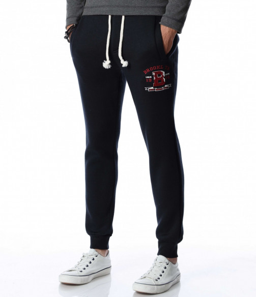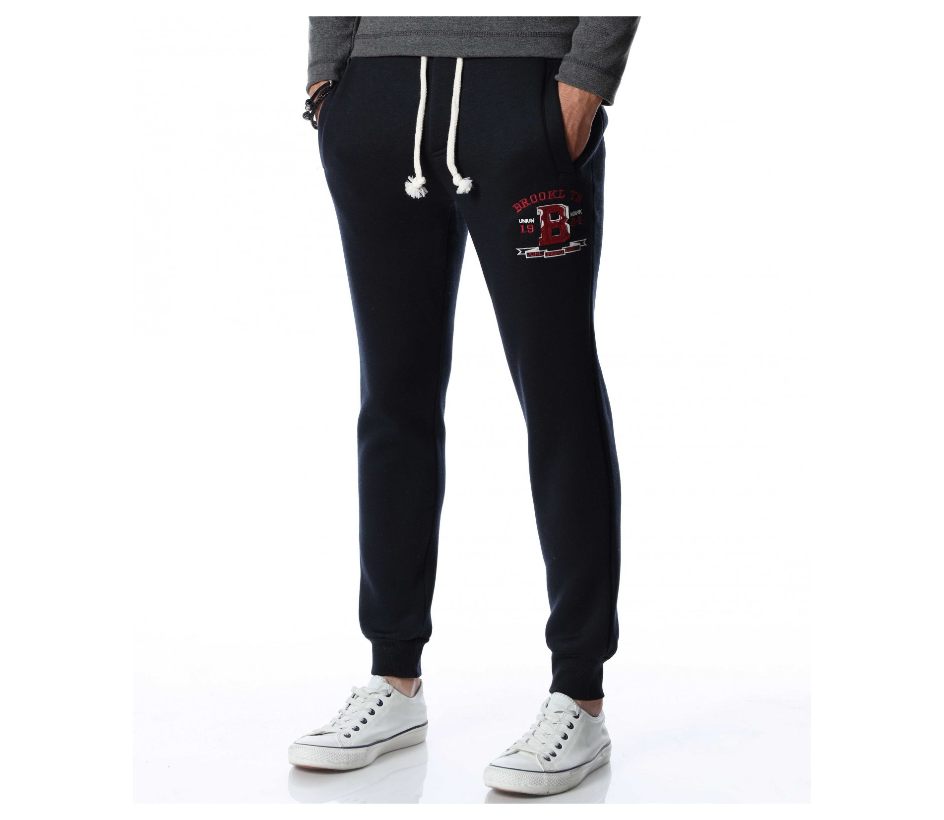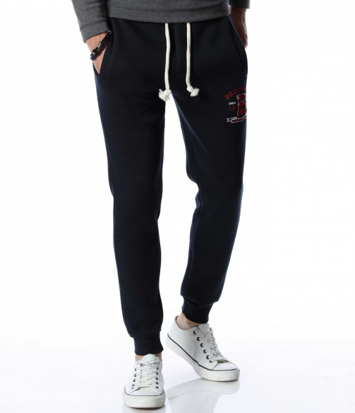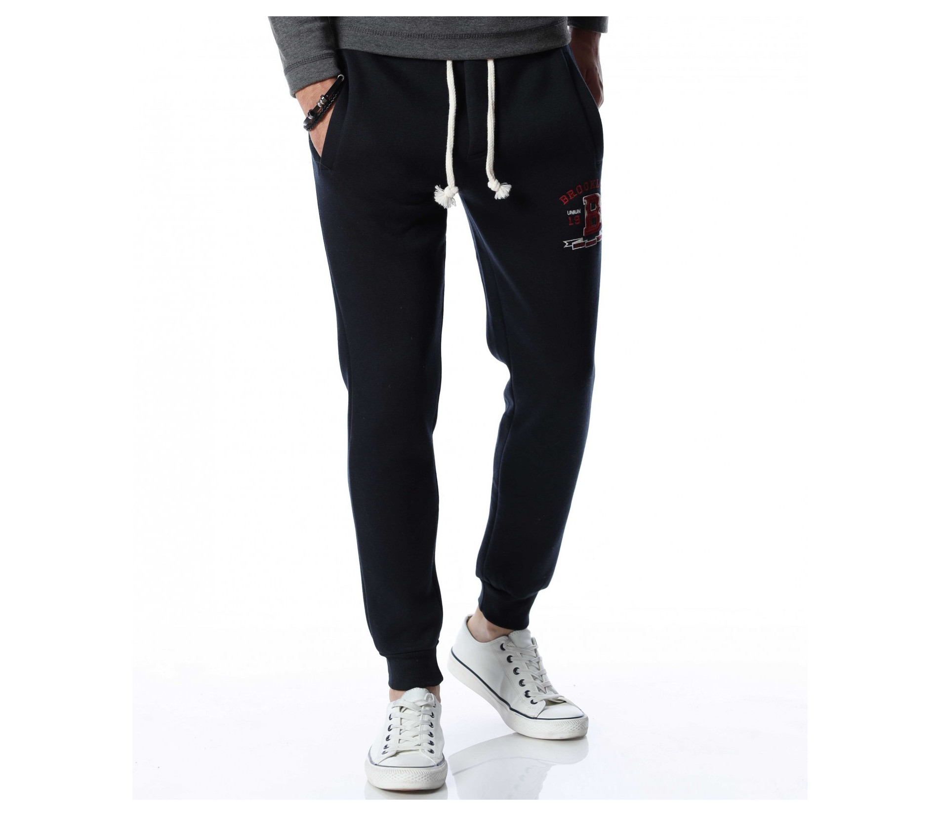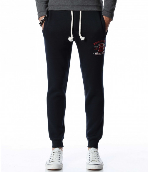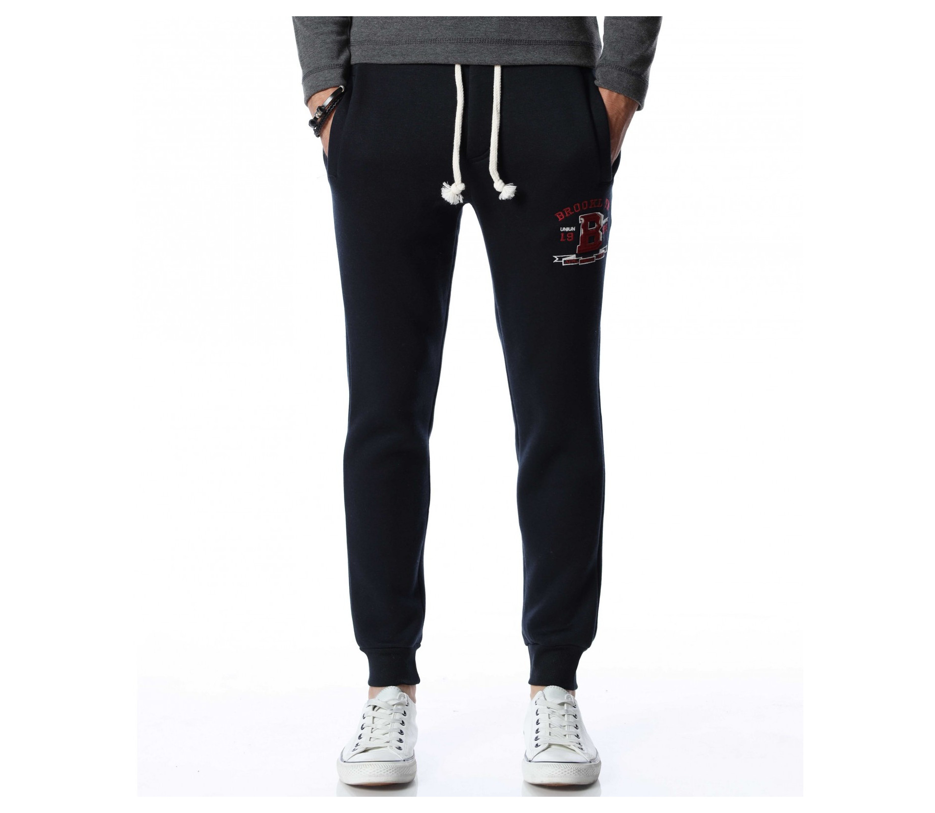 Мъжко, спортно долнище. Цялата основа е изчистена от декорации, само в предната част забелязваме бродиран елемент за акцент. Моделът разполага с два, отворени джоба в предната част и един в задната, дясна част. Кройката дава достатъчна свобода на движение. На талията са поставени връзки за регулиране на ширината. При глезените откриваме ластични маншети, които прибират крачола и дават завършен вид на модела. Комбинирайте с високи кецове и блуза.