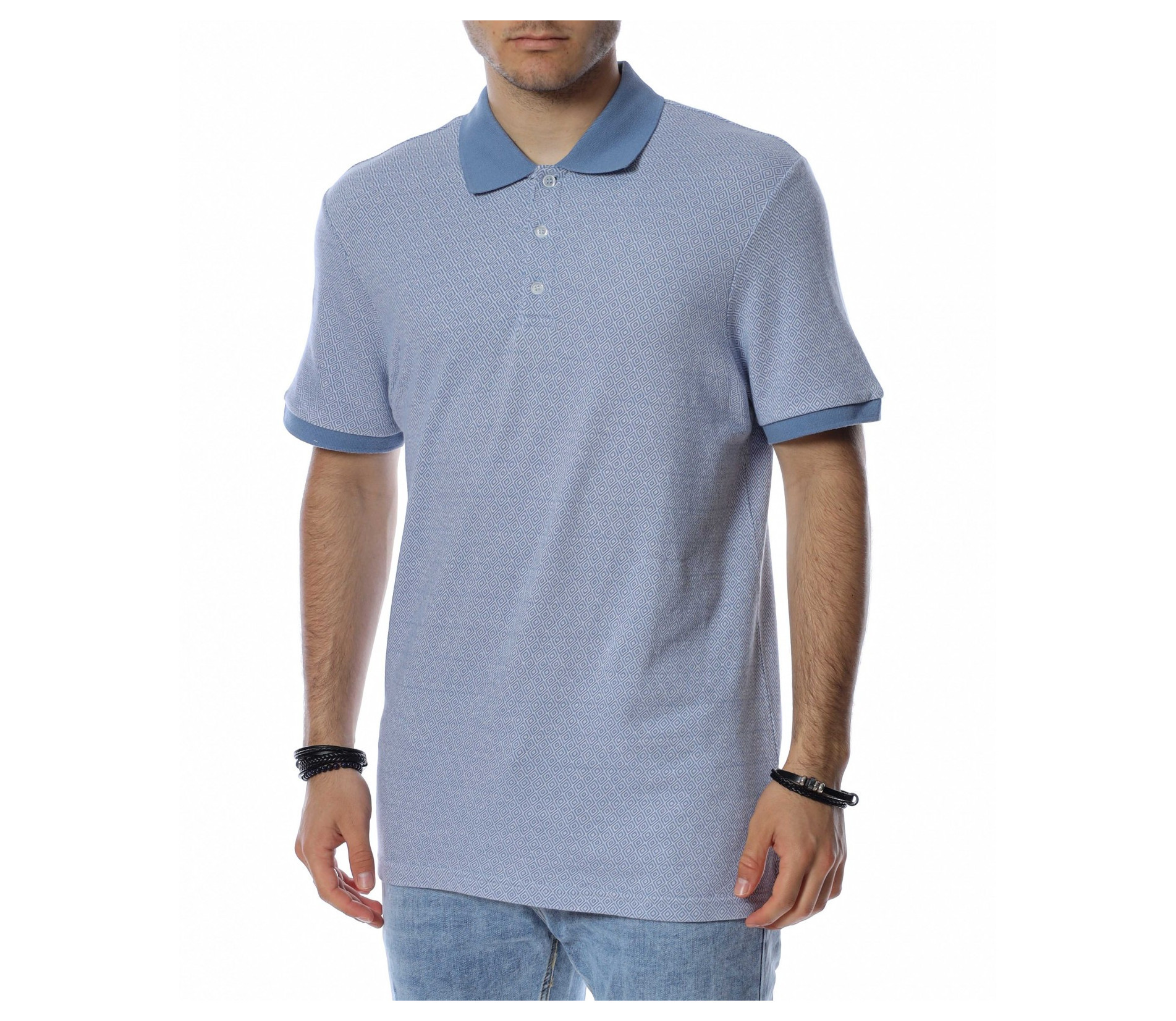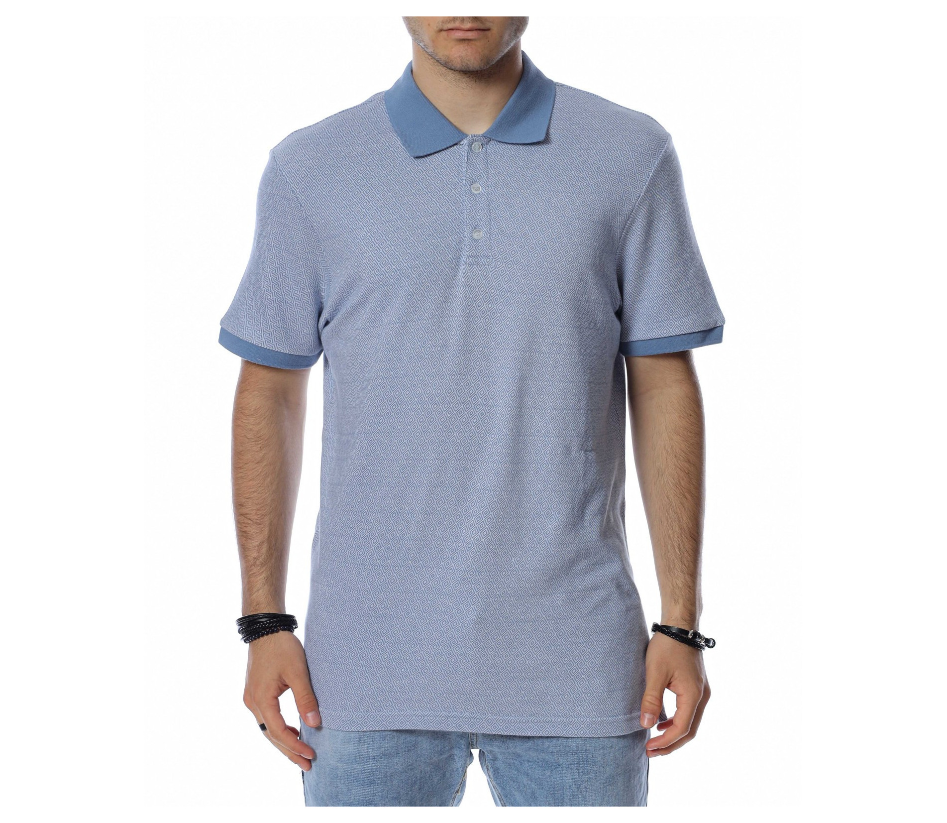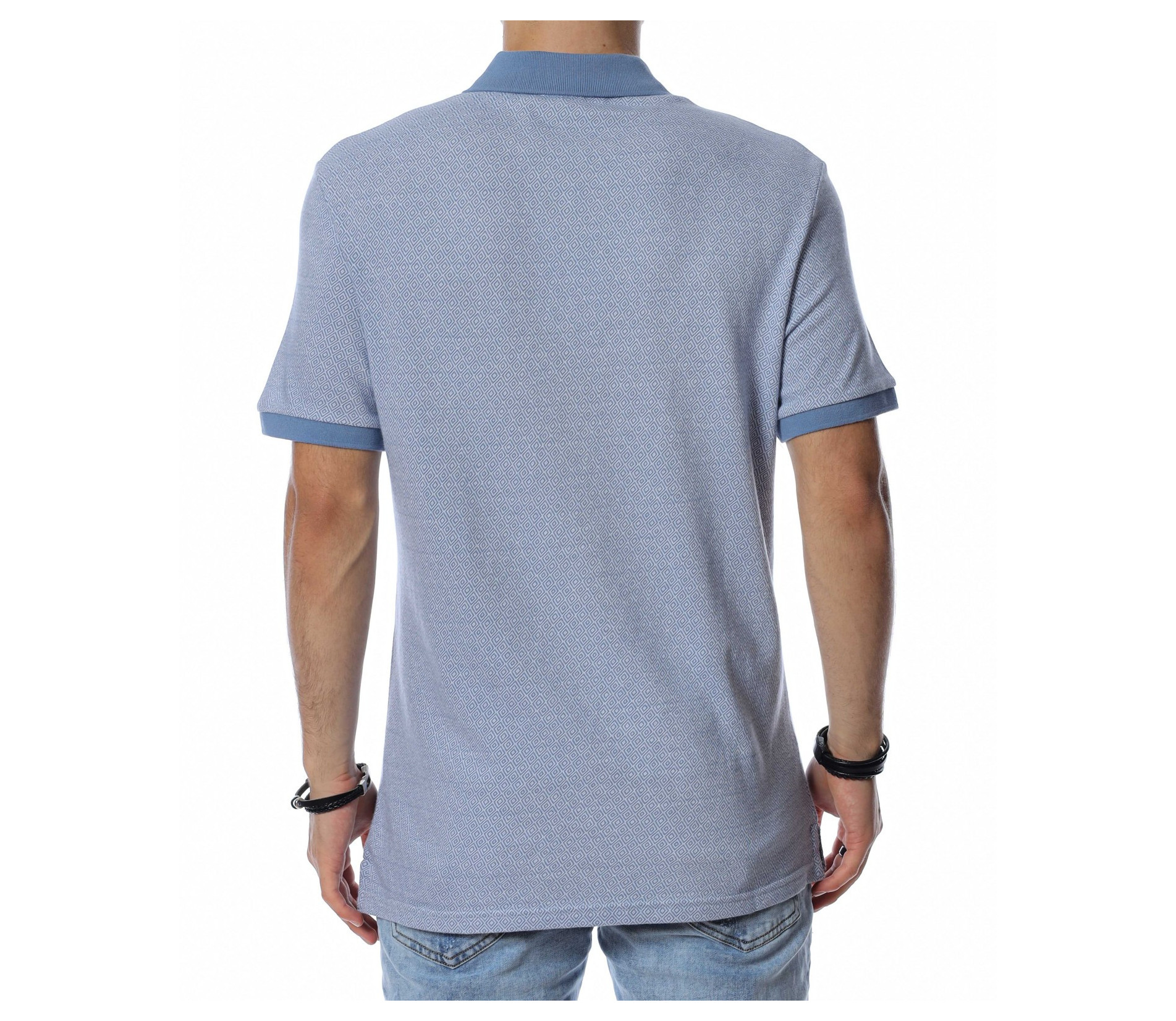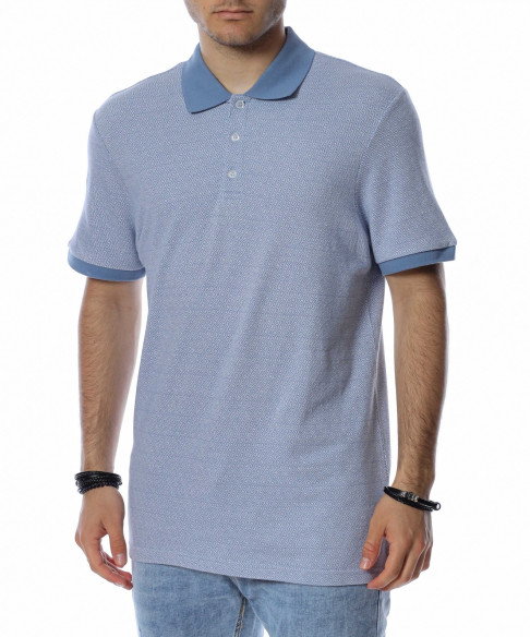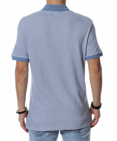 ОПИСАНИЕ НА ПРОДУКТА: Ефектна мъжка спортно-елегантна тениска с яка. Цялостния принт на моделът е изпъстрен в светлосин цвят, а като контрастен елемент е поставена яка в по-наситено синьо. Ефектът от този нюанс е пренесен и в областта на ръкавите, където са поставени ластици, прибиращи ги към ръката. В областта на яката са поставени и три малки копчета, ефектно оформящи деколтето. Кройката на фланелката е леко вталена, като дължината е стандартна, перфектно прилягаща по всяко тяло. Бъдете стилни дори и в ежедневието, като комбинирате тениската с модерни къси или дълги дънки, спортно-елегантни обувки и подходящ аксесоар.