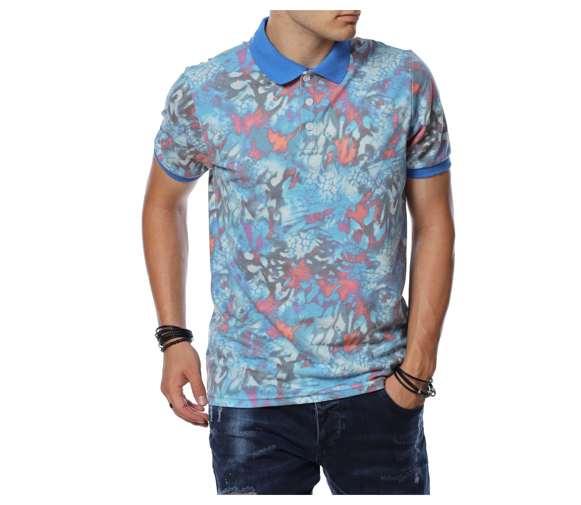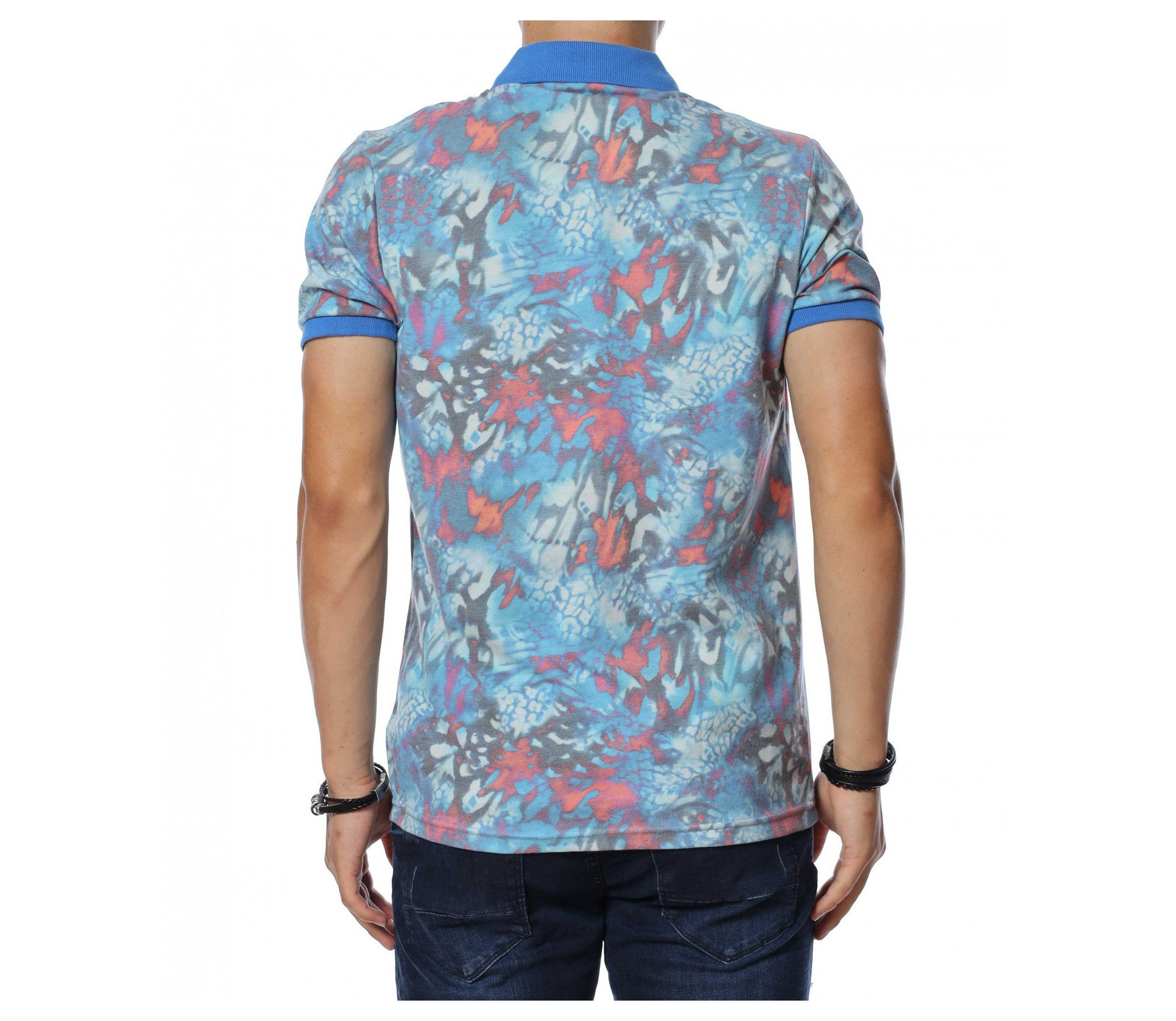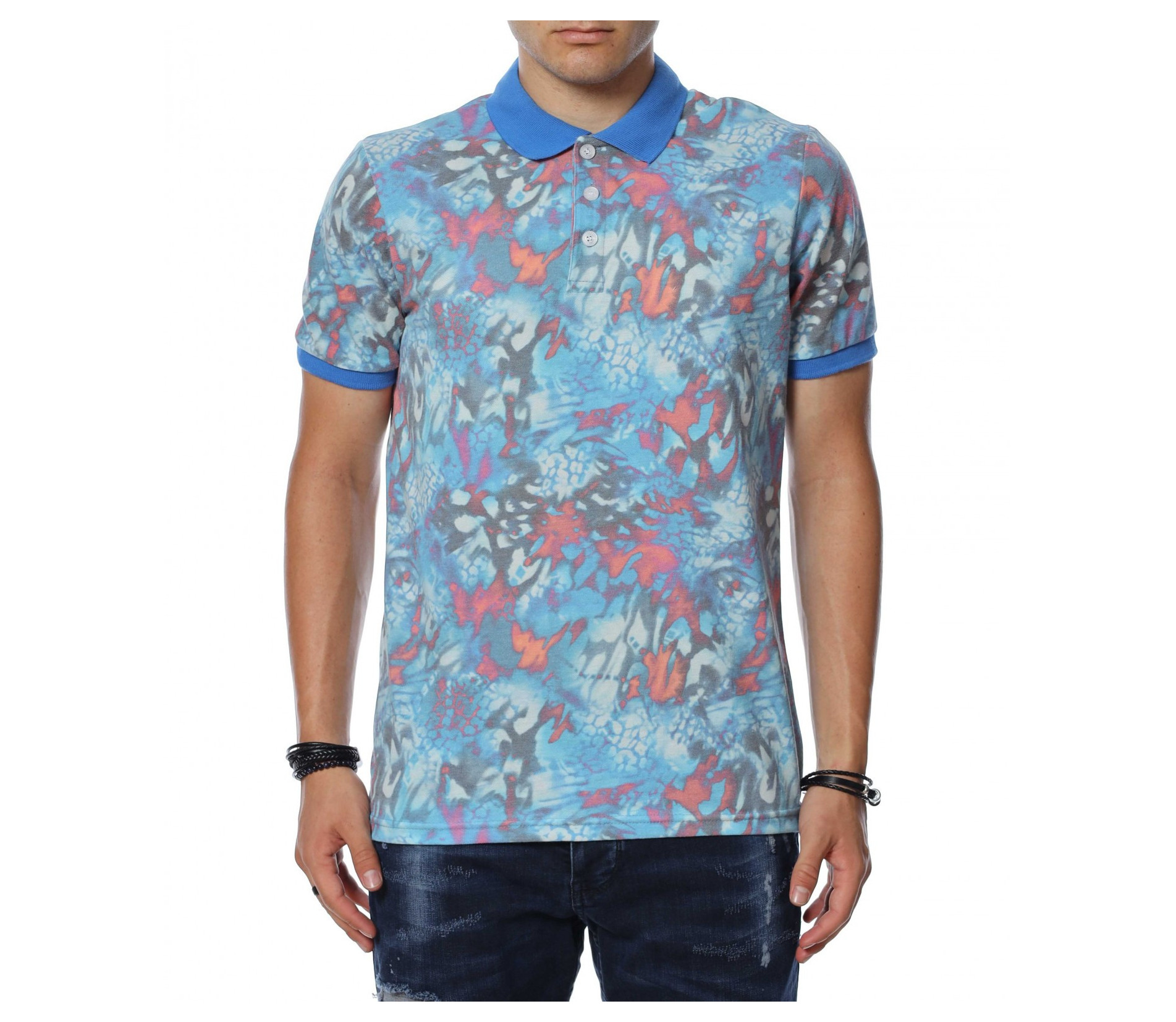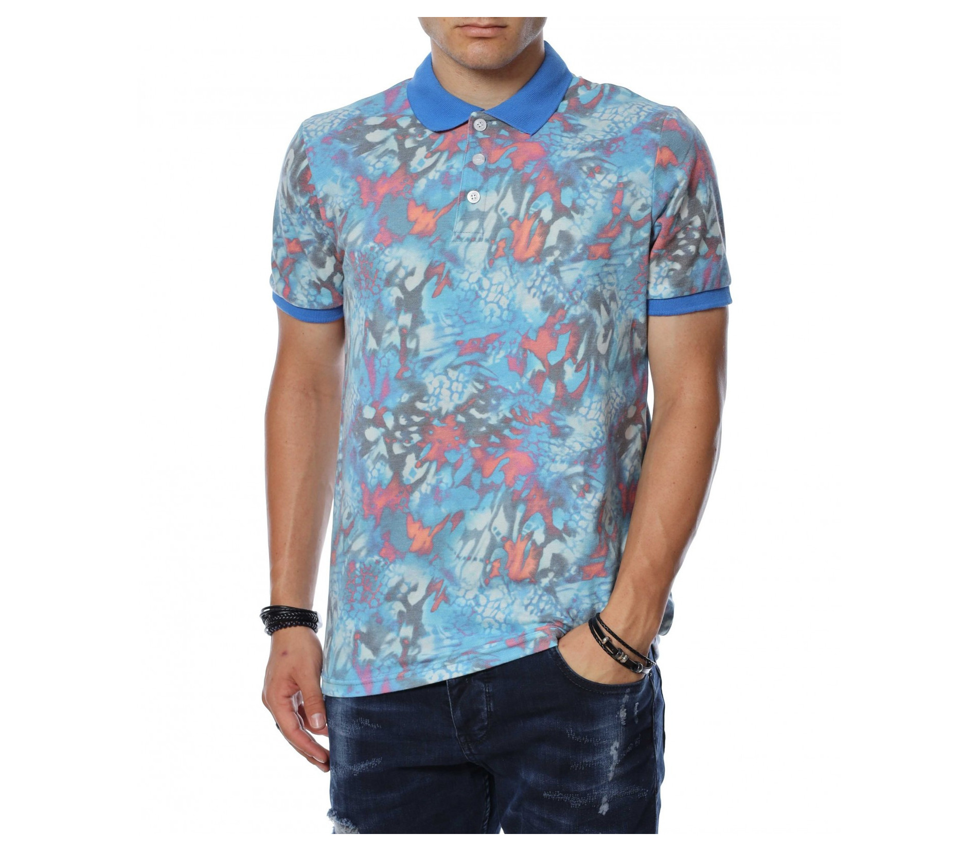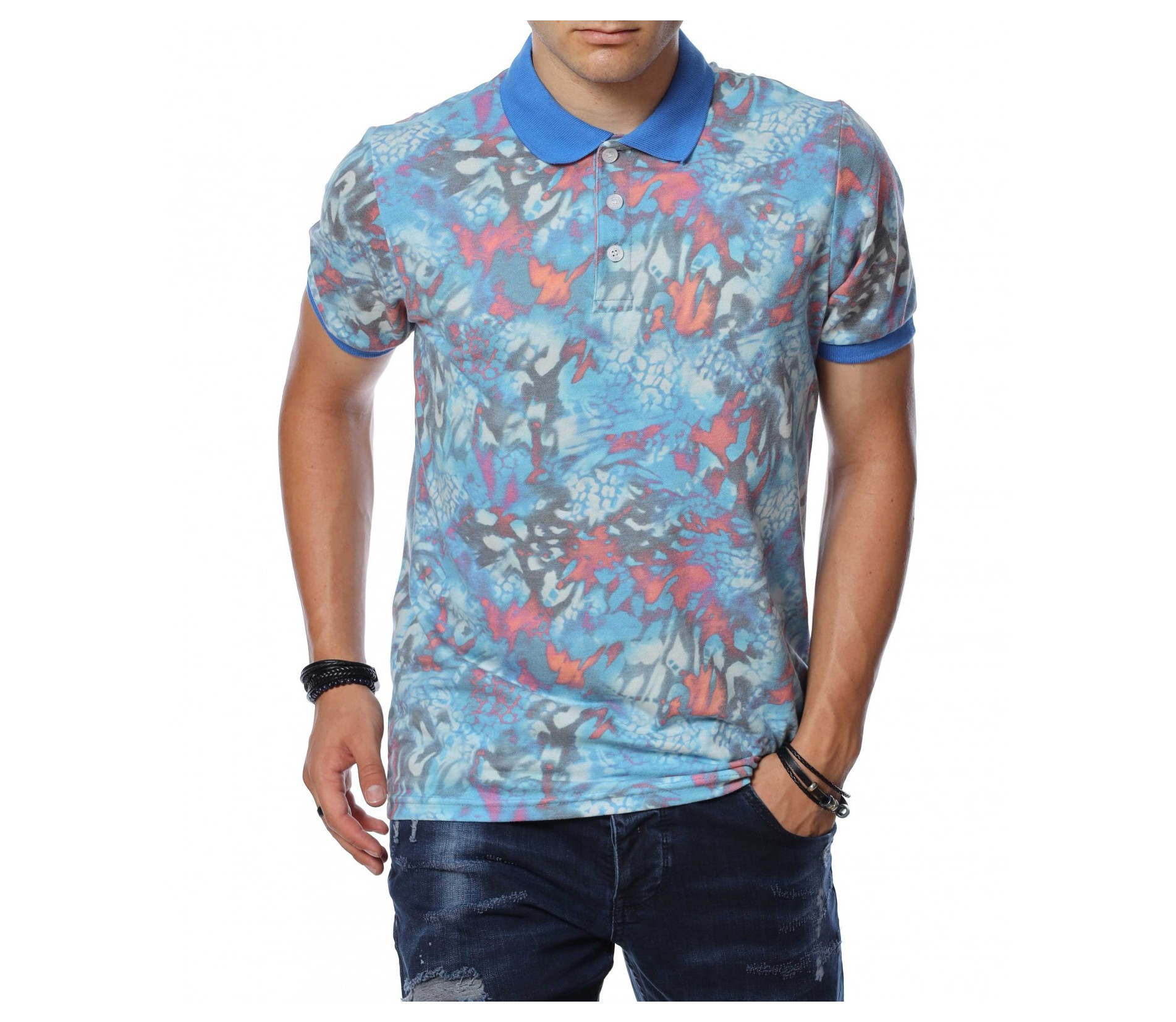 ОПИСАНИЕ НА ПРОДУКТА: Мъжка интересна тениска с къс ръкав с яка. Моделът е изключително привлекателен за всички, които са любители на цветния стайлинг. Принта на тази блуза с къс ръкав е съставен от множество малки фигурки и орнаменти, които са разпръснати по цялата основа и създават едно много закачливо излъчване. Яката и ластика покрай ръкавите неслучайно е в контрастиращ цвят, създавайки един атрактивен акцент и завършващ изцяло визията на тениската. В областта на деколтето са разположени няколко копчета, които регулират неговата дълбочина. Кройката на тишърта е вталена и леко еластична, създаваща свобода при движението и чувство на комфорт. Стилно съчетай с любимите си къси панталонки от дънков плат или памучна спортна долница, кецове в актуален десен и любим аксесоар за една безупречен fresh имидж.
