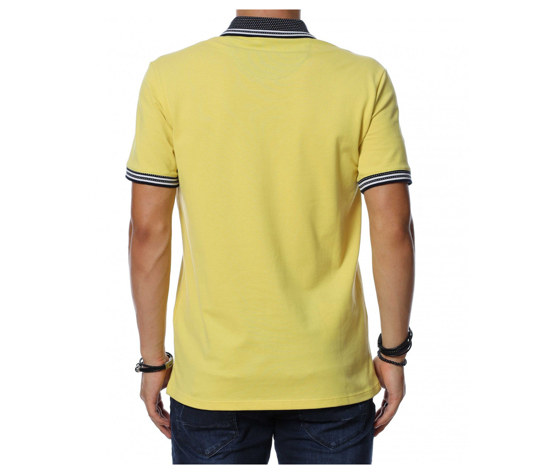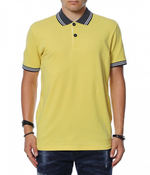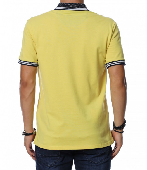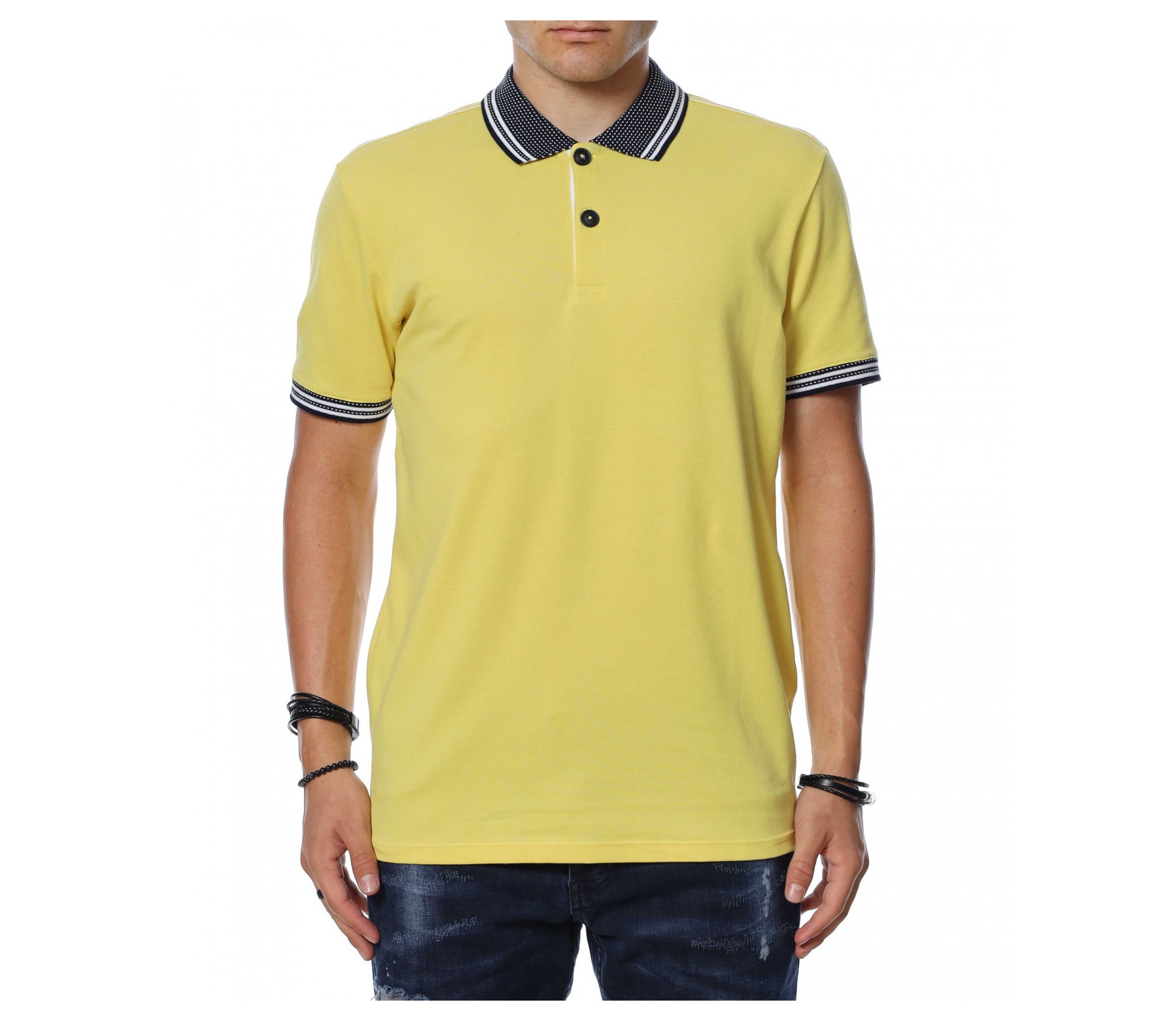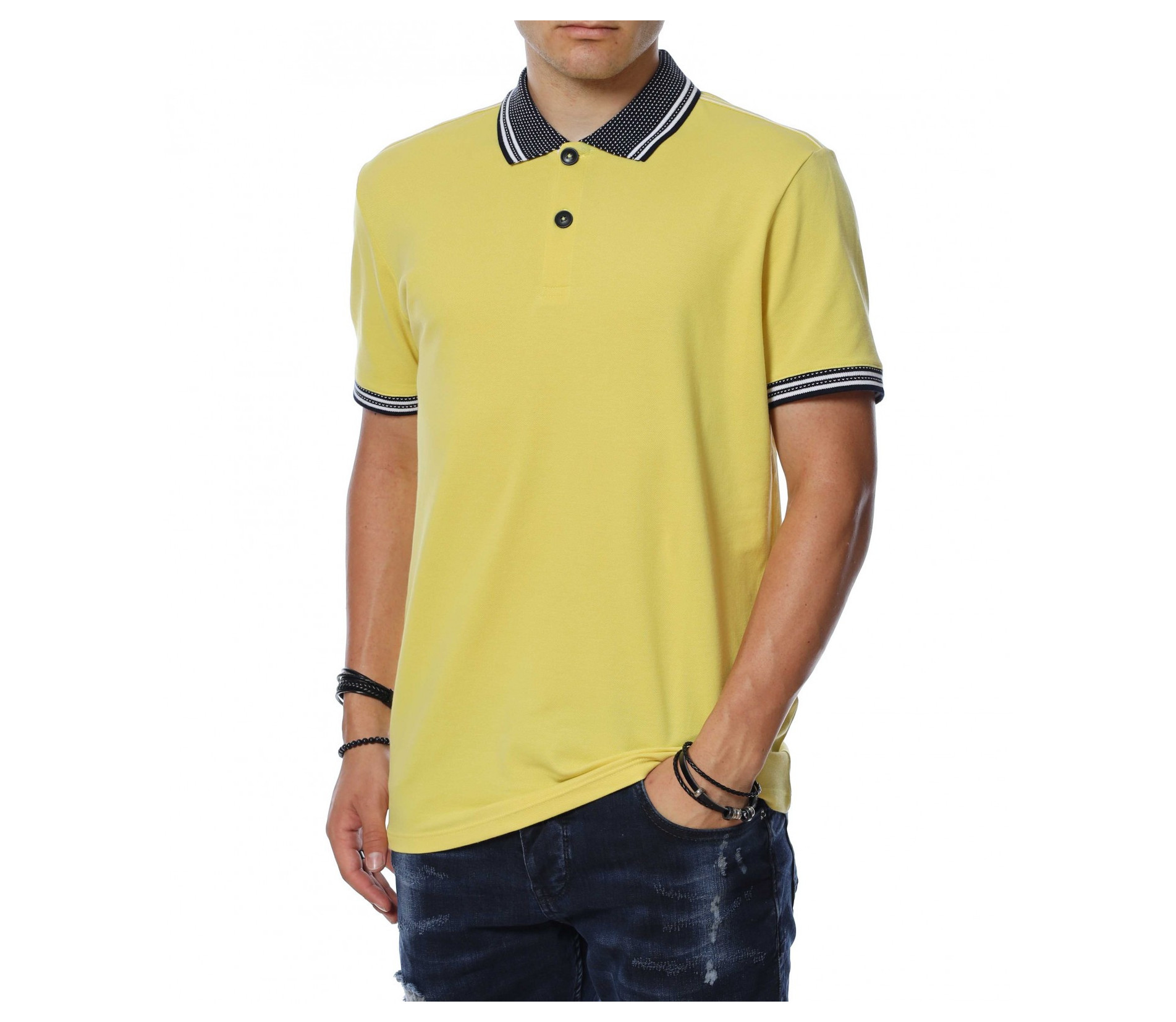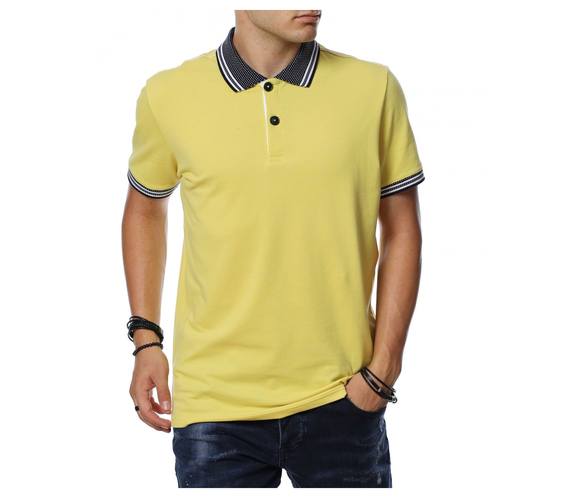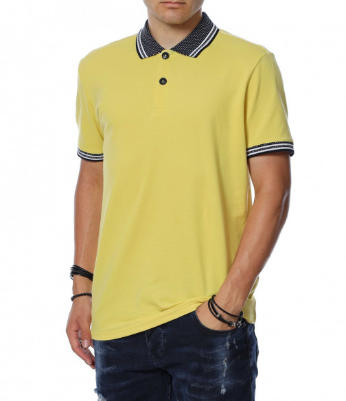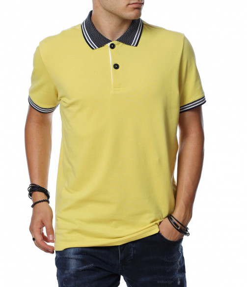 ОПИСАНИЕ НА ПРОДУКТА: Мъжка, цветна блуза с къс ръкав и контрастна яка. Основата на тениската е едноцветна. Предната и задната чат са изчистени от декорации и елементи. Деколтето е прибрано с две тъмни копчета и яка, а дължината е покриваща колана. В края на ръкавите е добавен маншет в същия десен като яката за подсилване на стилната визия. Кройката на моделът е по-свободна и е изработена от мека, памучна материя и еластан. Изключително подходяща е както за разходка в свободното време, така и за натоварен ден в офиса. Комбинирайте с дънки, панталони, кецове и любим аксесоар.