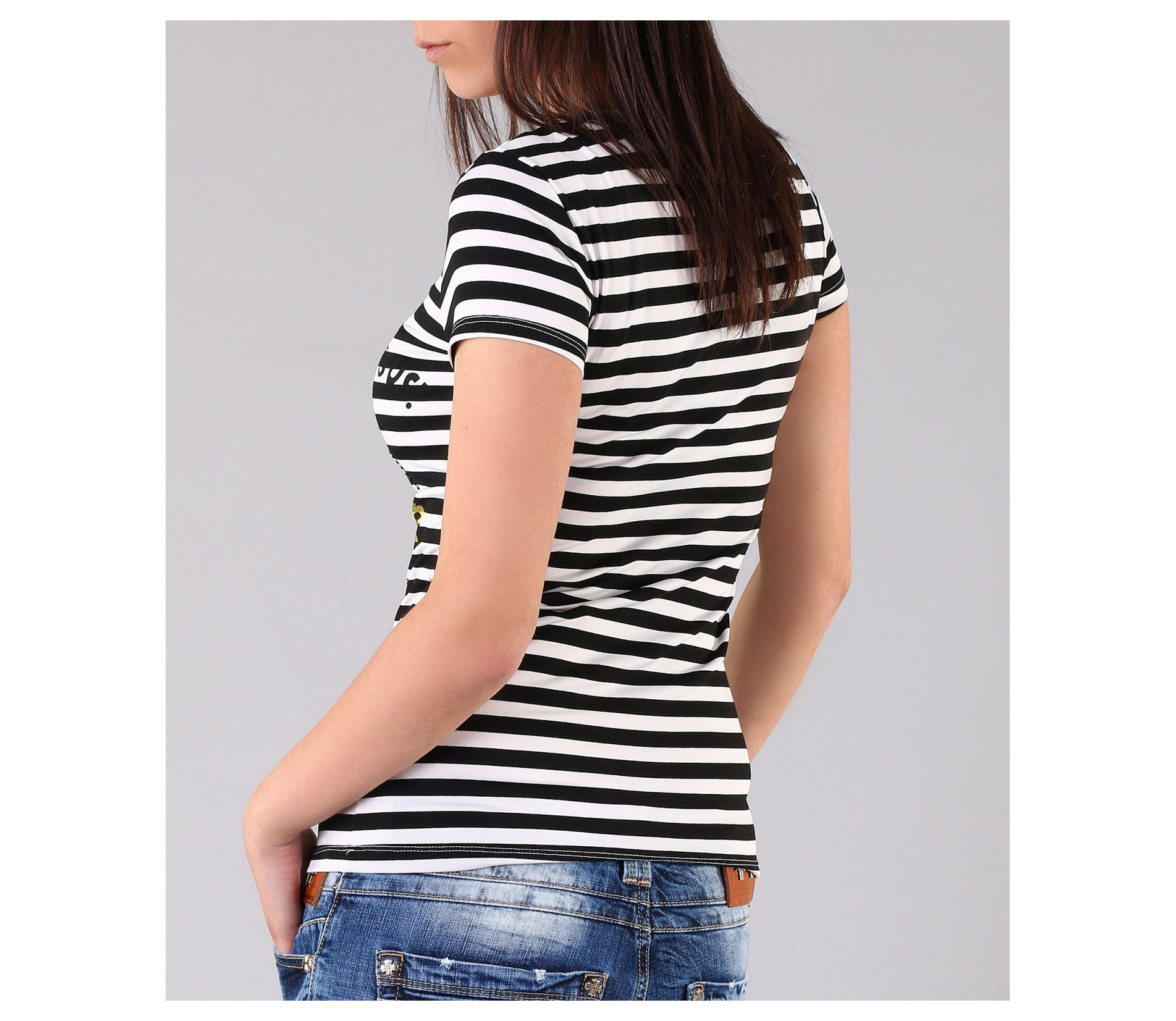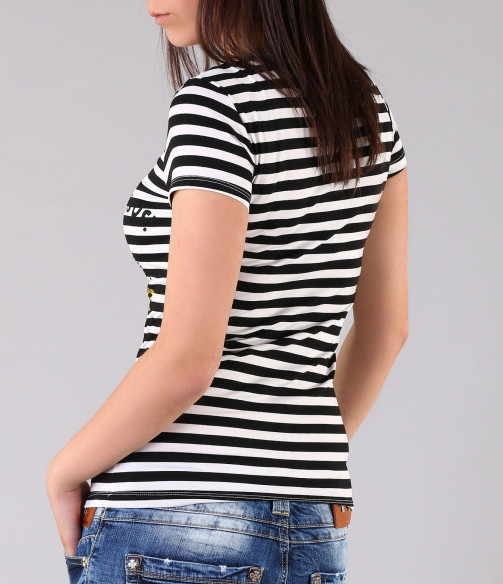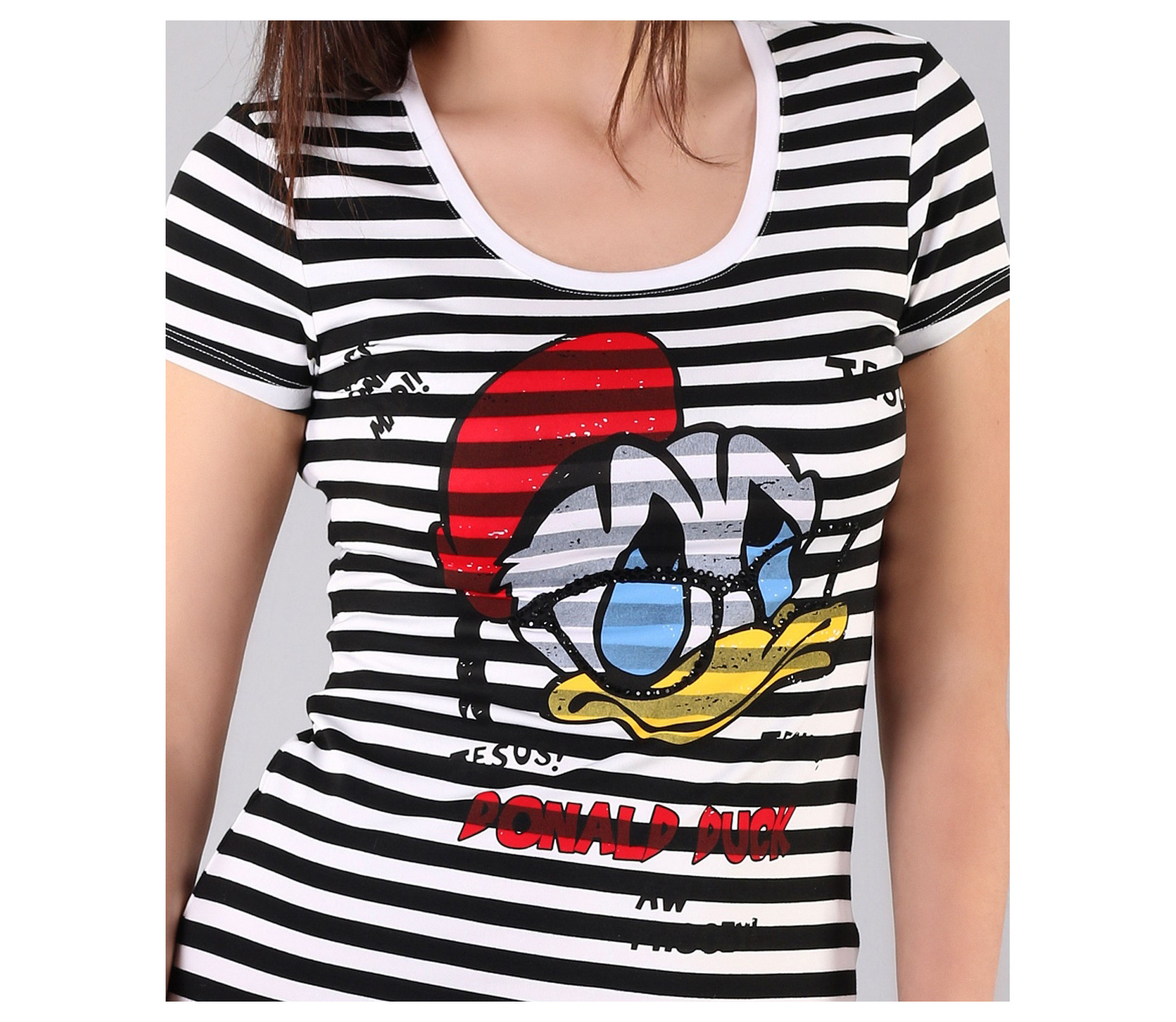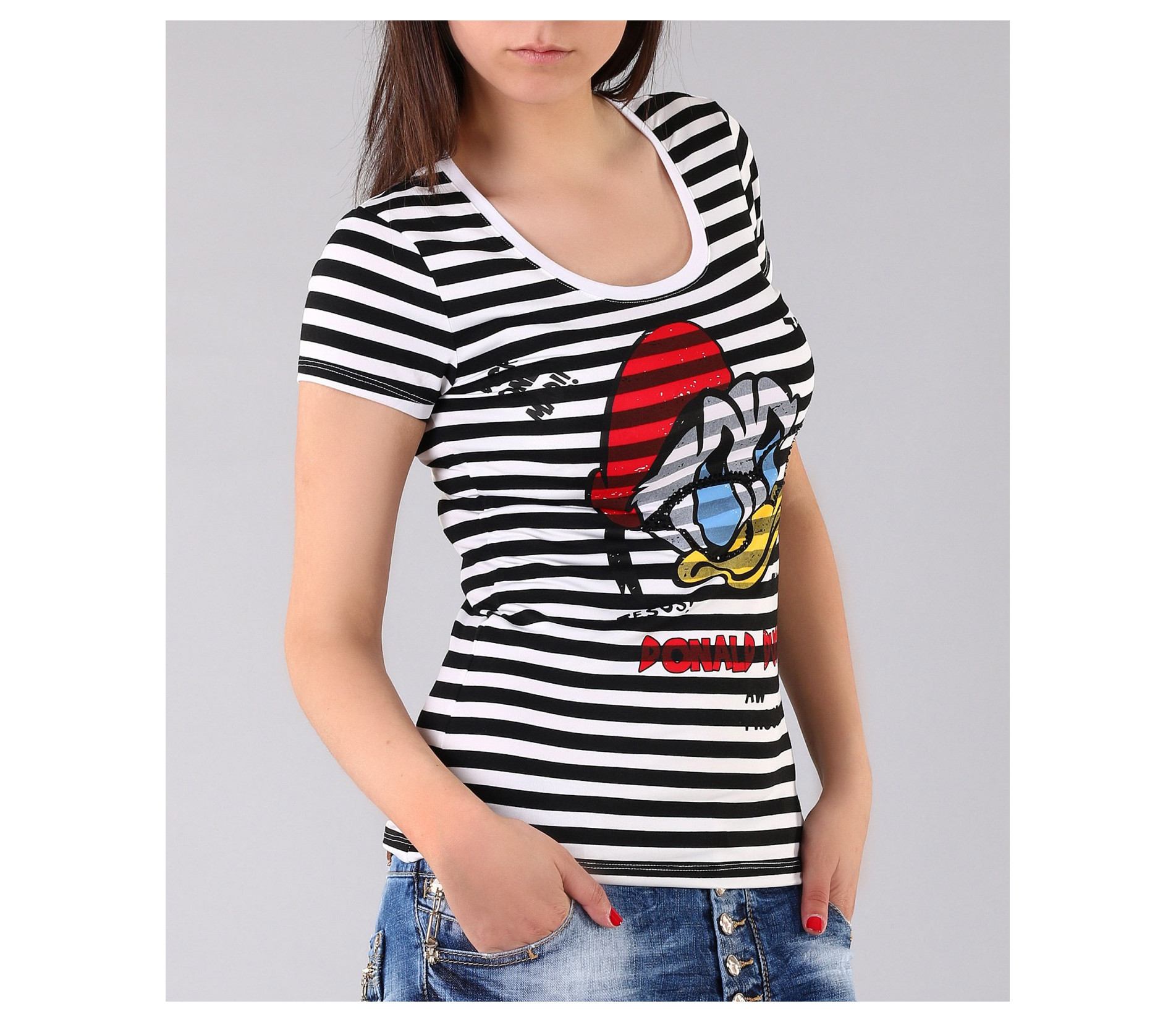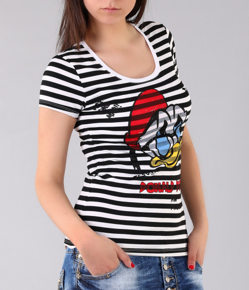 Страхотна дамска тениска на рае и модерен принт. Целият модел е рае черно и бяло, като в предната част е поставена апликация на Доналд Дък. Около щампата са поставени леки надписи, с интересен ефект под раето. Гърба на моделът е напълно изчистен и така се акцентира върху лицето на тениската. Този модел е с вталена кройка, стандартна дължина и дълбоко овално деколте. Свежа, стилна, актуална.. част от описанието на тази тениска. Предложение което не е за изпускане. В съчетание със спортни дънки, стилни обувки или сандали и актуланото за сезона дънково късо яке, получавате модерната визия към която се стремите. С изработката си от 100% висококачествени продукти, ние Ви гарантираме комфорт и качество в едно.