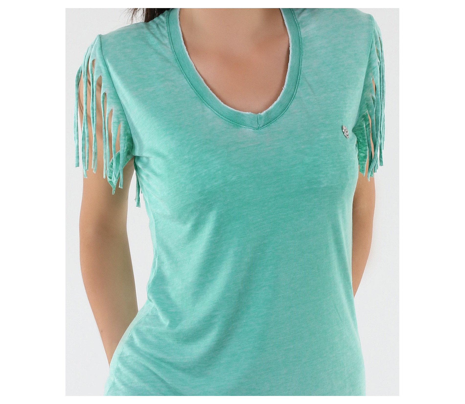 Спортна тениска в бледо зелен цвят с ресни на ръкавите. Стилен и интересен модел, подходящ за съчетаване както с дълги, така и с къси дънки. Моделът е от колекция лято 2015 година и изработен висококачествени материали.