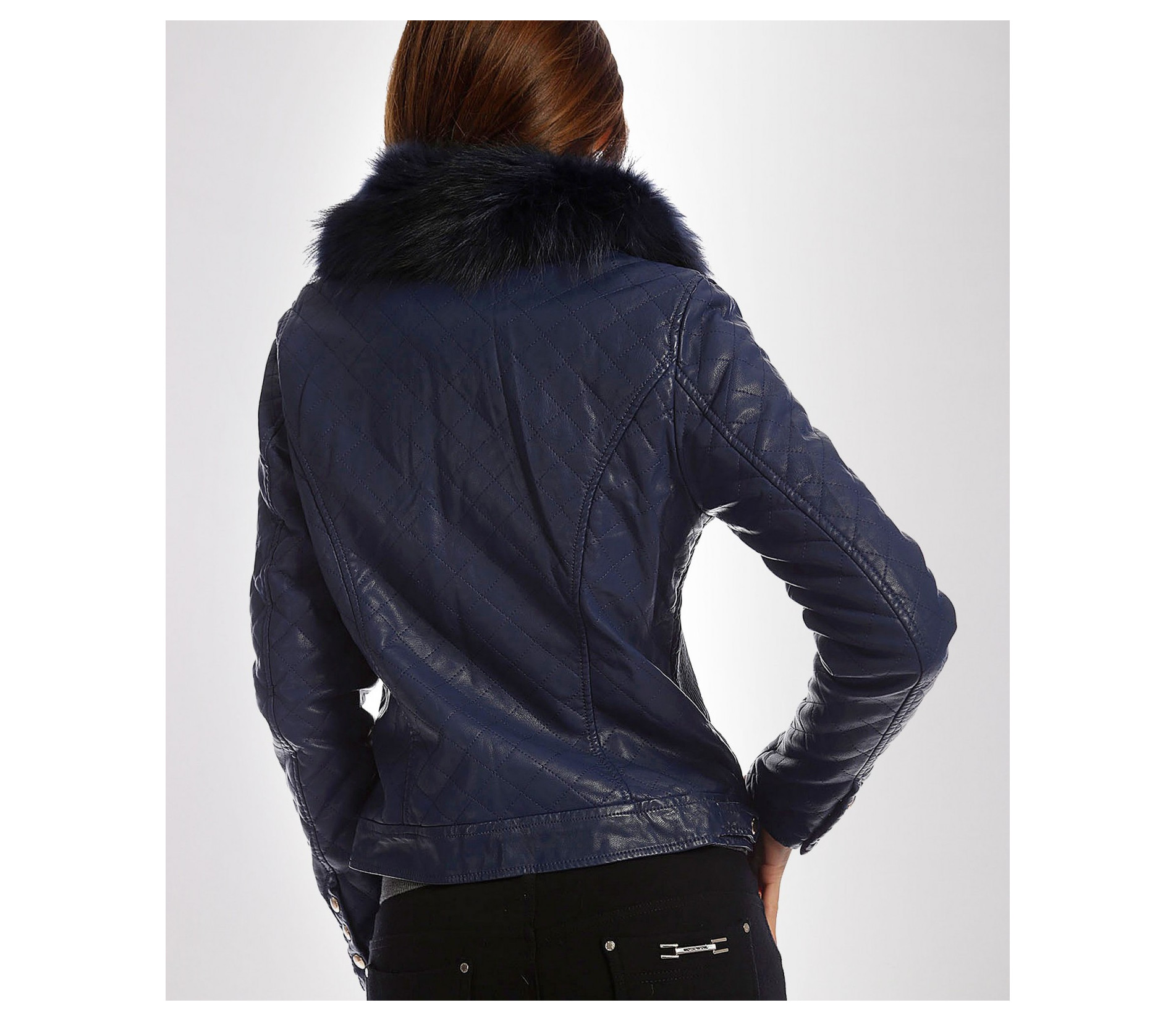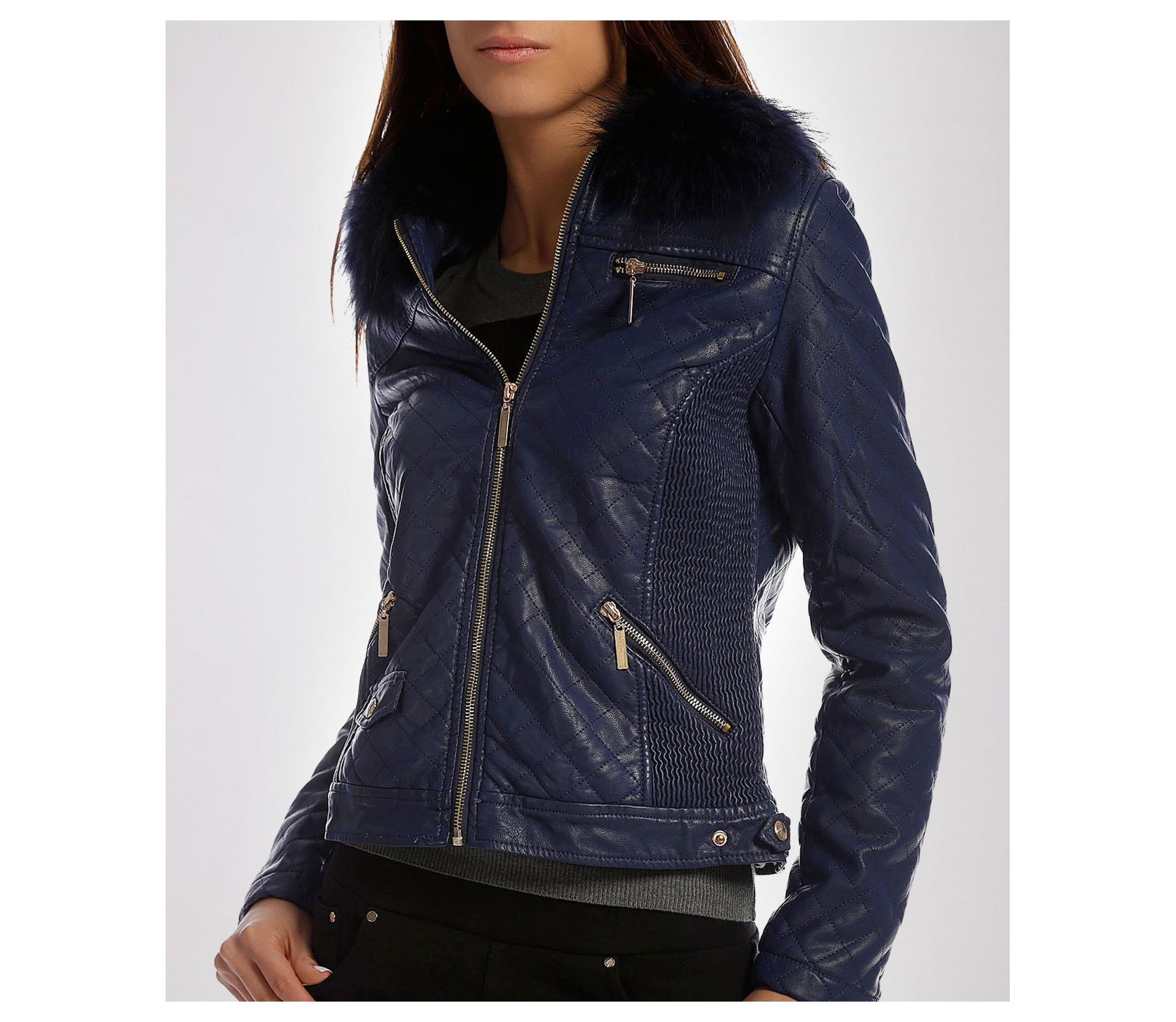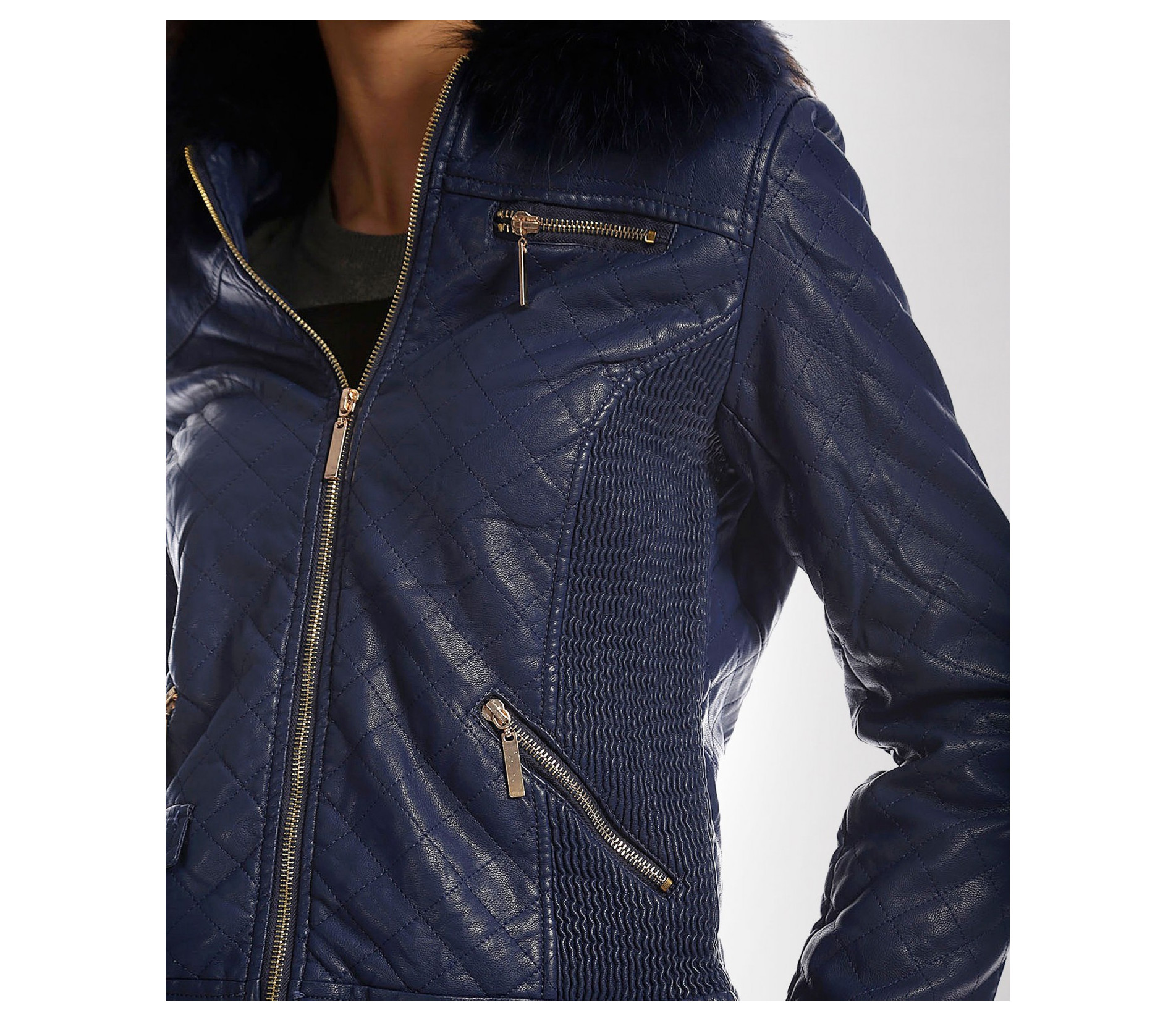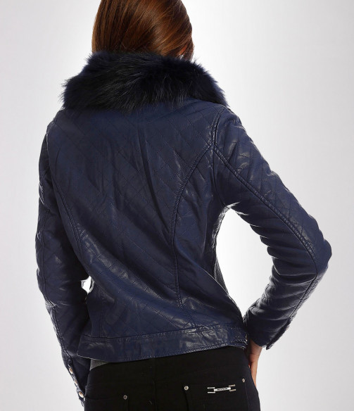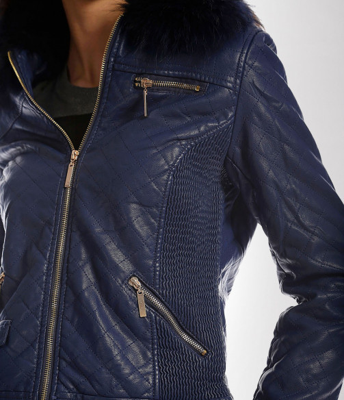Описание на продукта: Дамско кожено яке в тъмносин цвят с подплата от вътрешната страна. Този модел е с подвижна пухена яка, която е закачена с копчета за основната яка. Уникалната вталена кройка на якето, Ви осигурява перфектна линия на цялостната Ви модерна визия. Якето има златни ципове и копчета, поставени като силни акцентиращи елементи. Заложете на спортно-елегантния стайлинг, като съчетаете якето със стилен деним, атрактивни обувки и любим аксесоар.