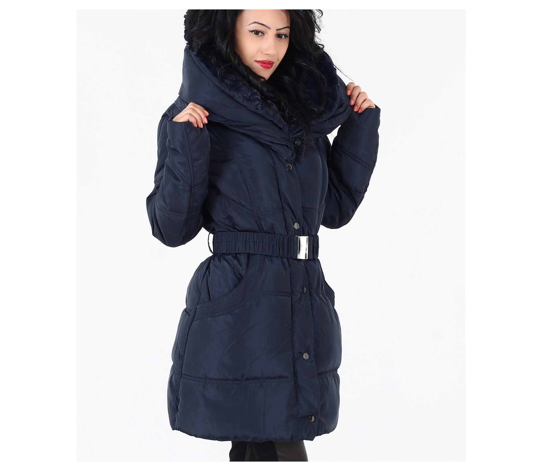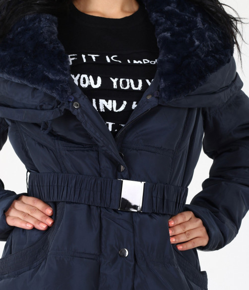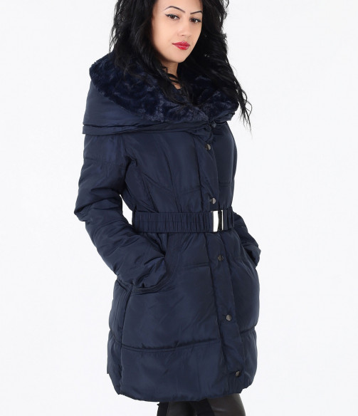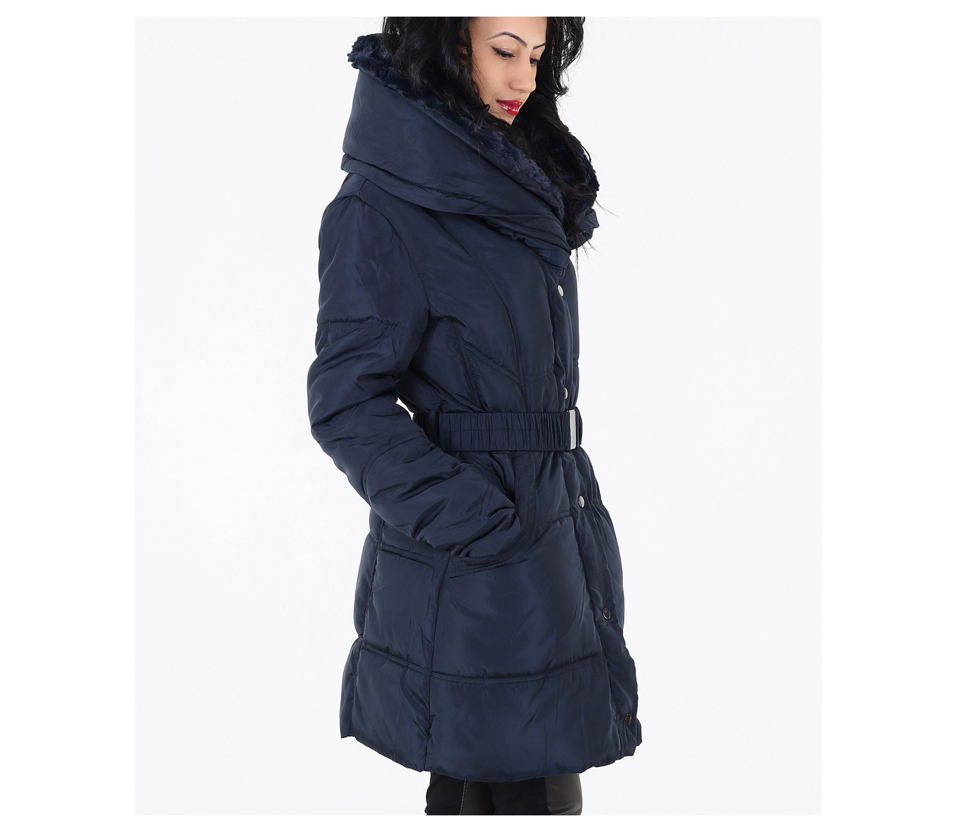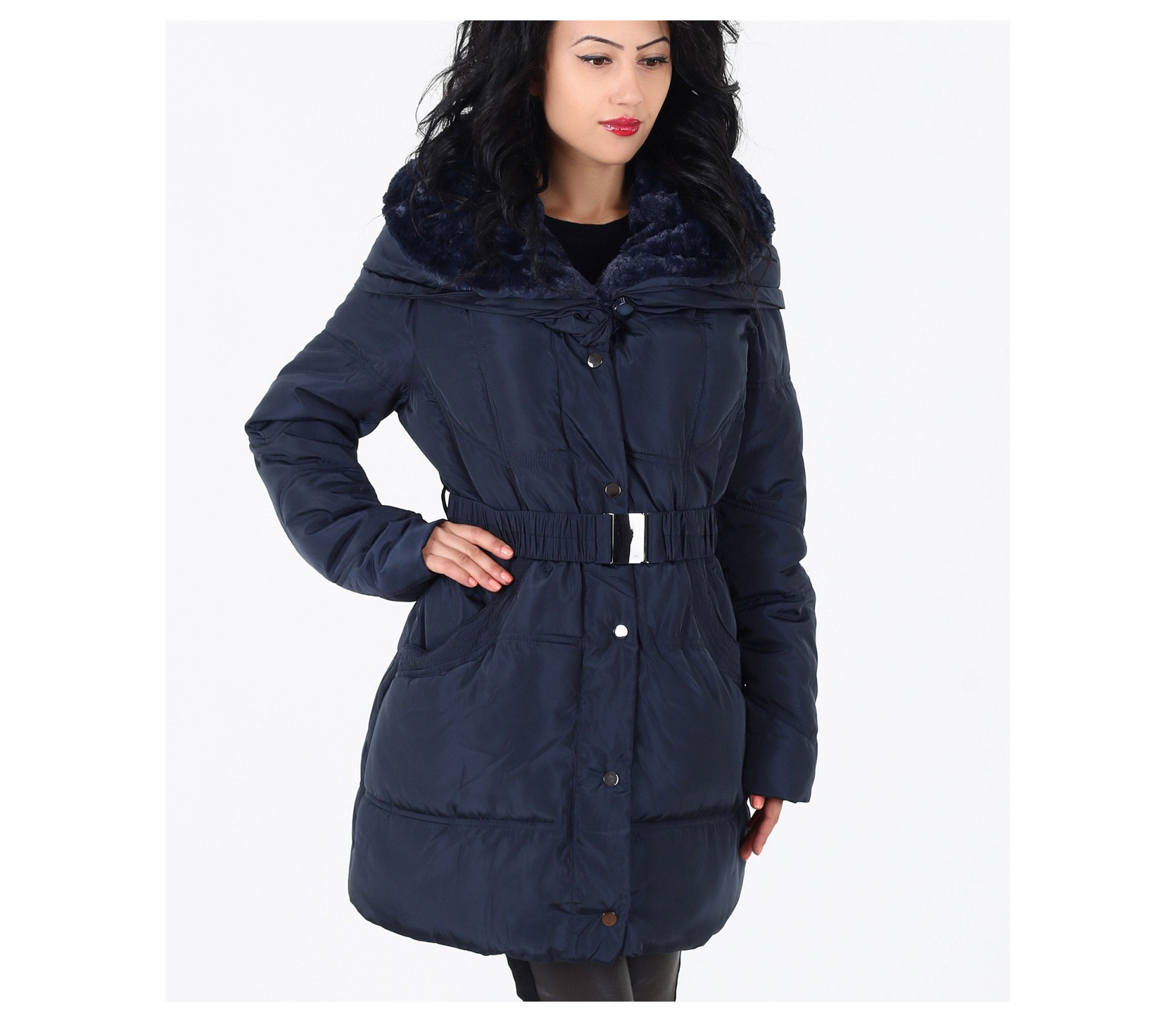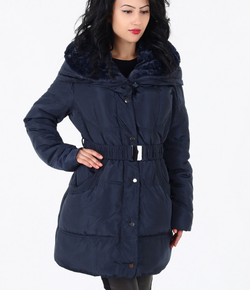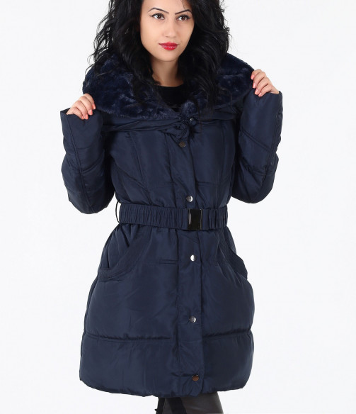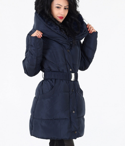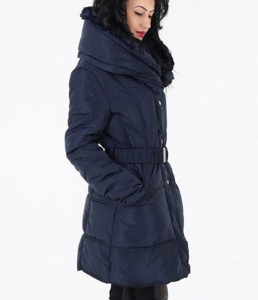 Модерно дамско зимно яке. Този модел яке е в тъмно син цвят - характерен за експериментиращите със своята визия. Моделът е удължен, като е перфектен за студената зима. Има топла и мека подплата, гарантираща топлина и комфорт. В областта на кръста има еластичен колан. Той прибира якето по тялото и оформя талията. Има голяма яка с прикачена пухена от вътрешната страна, предпазваща от вятър. Има два удобно разположени джоба без цип. Закопчаването е с помощта на цип и копчета, следващи цялата дължина на якето.