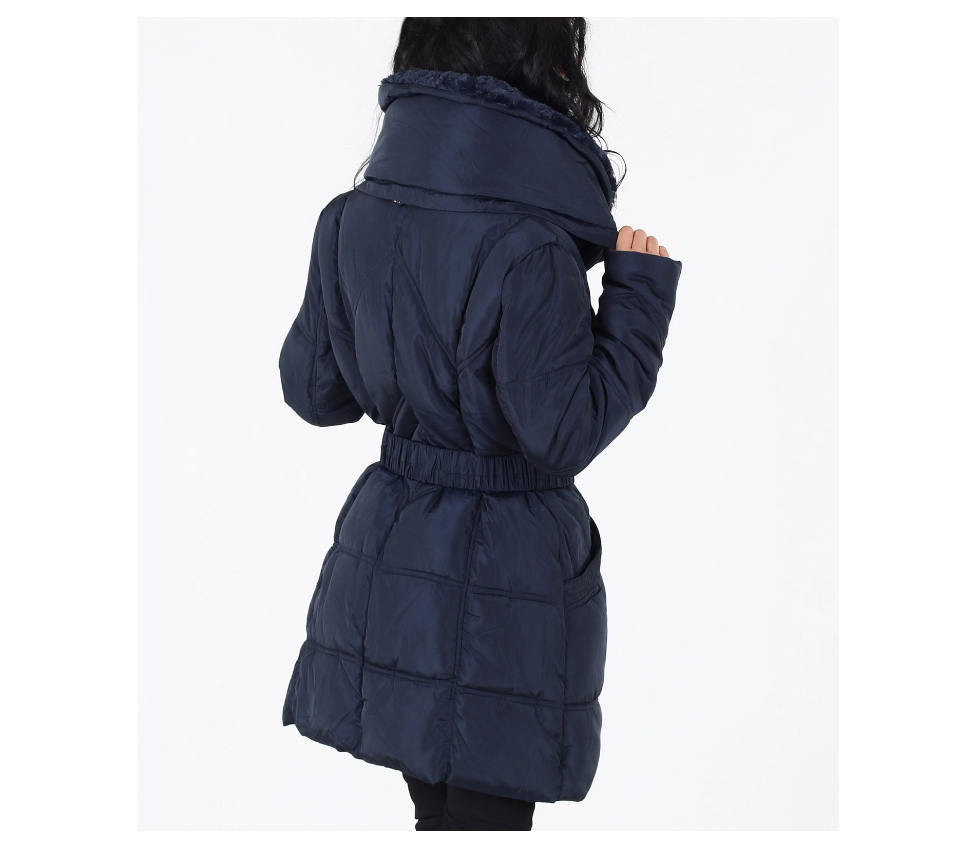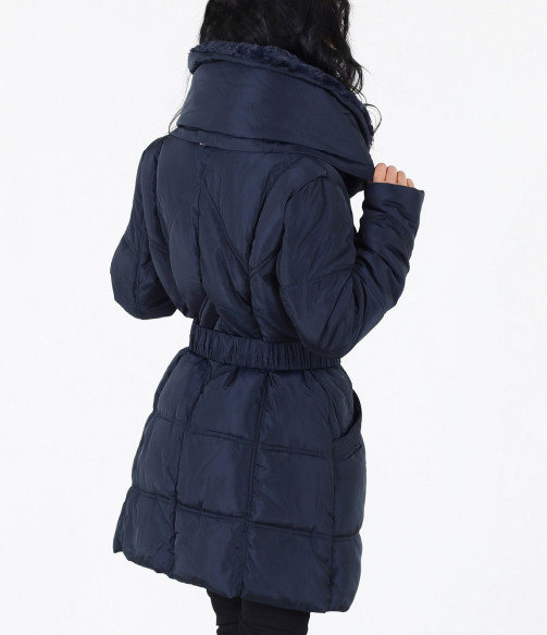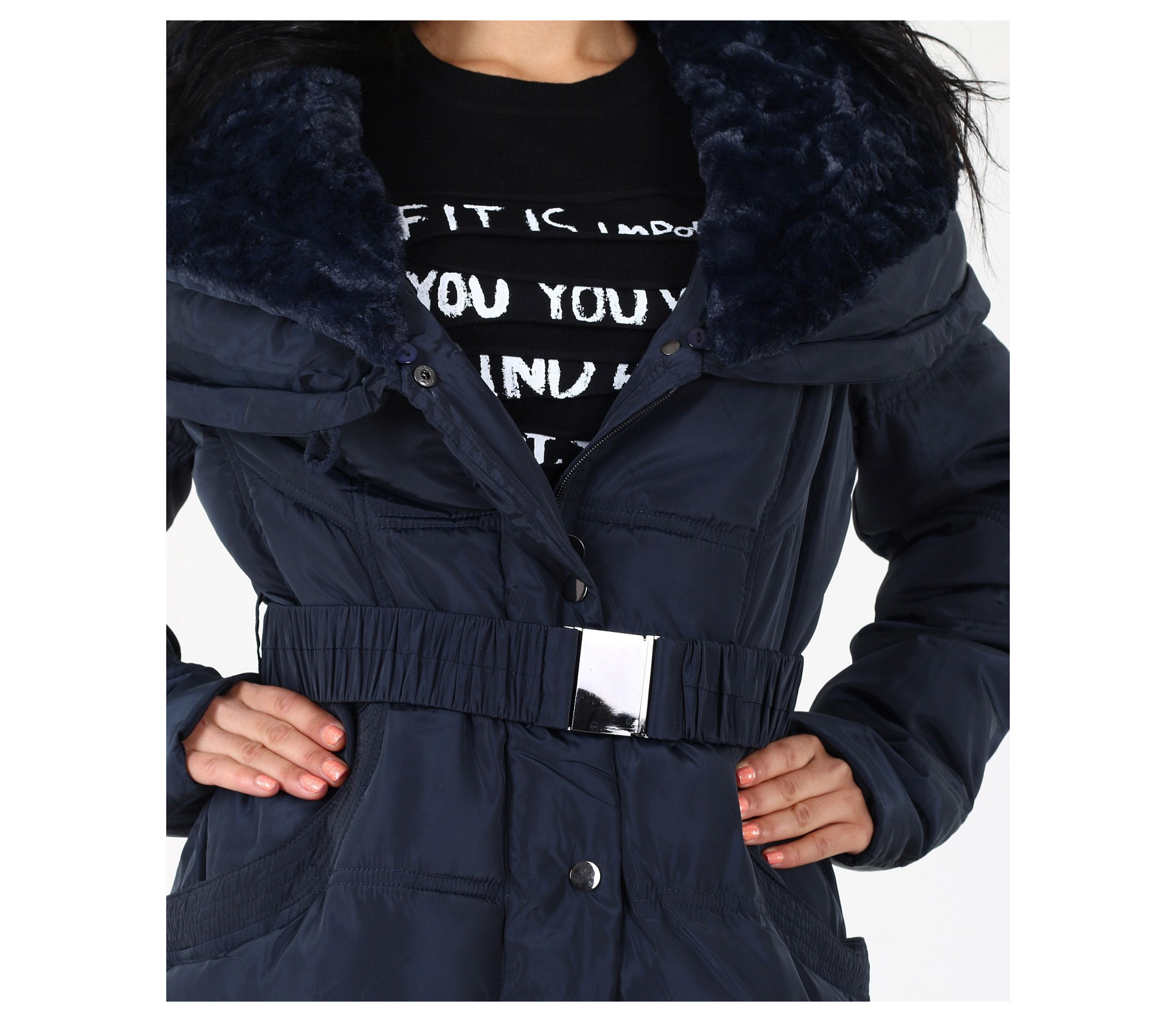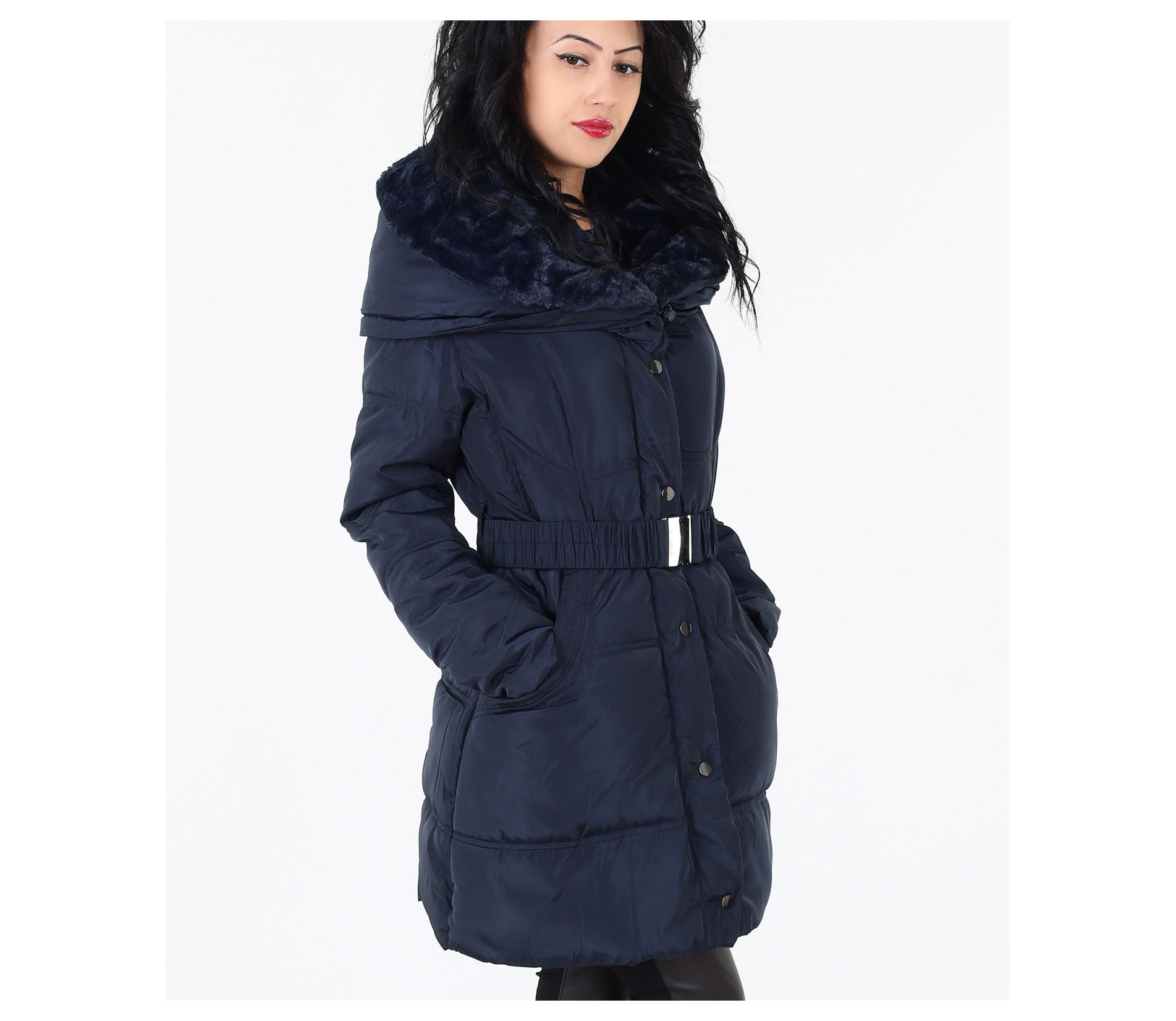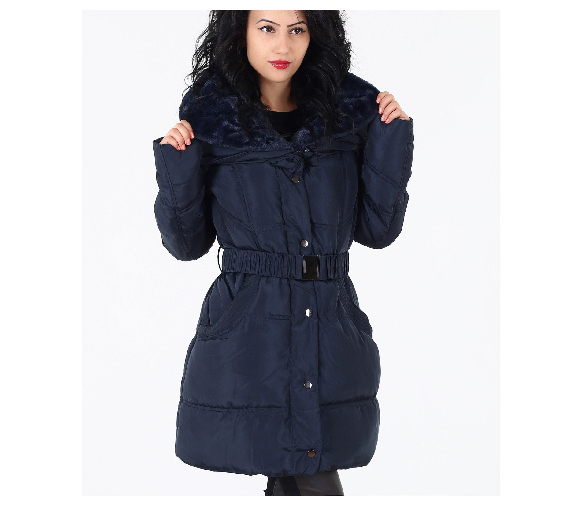 Модерно дамско зимно яке. Този модел яке е в тъмно син цвят - характерен за експериментиращите със своята визия. Моделът е удължен, като е перфектен за студената зима. Има топла и мека подплата, гарантираща топлина и комфорт. В областта на кръста има еластичен колан. Той прибира якето по тялото и оформя талията. Има голяма яка с прикачена пухена от вътрешната страна, предпазваща от вятър. Има два удобно разположени джоба без цип. Закопчаването е с помощта на цип и копчета, следващи цялата дължина на якето.